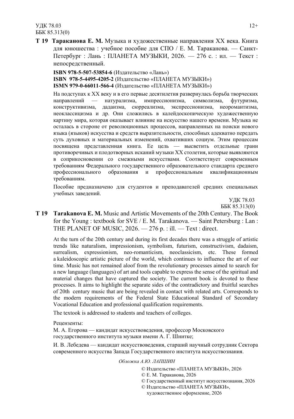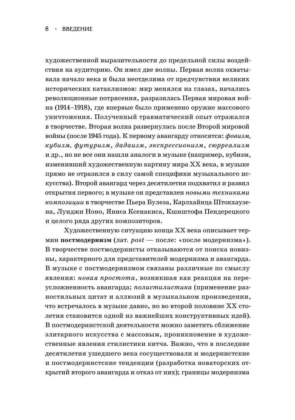 На подступах к ХХ веку и в его первые десятилетия развернулась борьба творческих направлений – натурализма, импрессионизма, символизма, футуризма, конструктивизма, дадаизма, сюрреализма, экспрессионизма, неоромантизма, неоклассицизма и др. Они сложились в калейдоскопическую художественную картину мира, которая оказывает влияние на искусство нашего времени. Музыка не осталась в стороне от революционных процессов, направленных на поиски нового языка (языков) искусства и средств выразительности, способных адекватно передать суть духовных и материальных изменений, охвативших социум. Этим процессам посвящена представленная книга. Её цель – высветить отдельные грани противоречивых и плодотворных исканий музыки ХХ столетия, которые выявляются в соприкосновении со смежными искусствами. Соответствует современным требованиям Федерального государственного образовательного стандарта среднего профессионального образования и профессиональным квалификационным требованиям. Пособие предназначено для студентов и преподавателей средних специальных учебных заведений. At the turn of the 20th century and during its first decades there was a struggle of artistic trends like naturalism, impressionism, symbolism, futurism, constructivism, dadaism, surrealism, expressionism, neo-romanticism, neoclassicism, etc. These formed a kaleidoscopic artistic picture of the world, which continues to influence the art of our time. Music has not remained aloof from the revolutionary processes aimed to search for a new language (languages) of art and tools capable to express the sense of the spiritual and material changes that have captured the society. The current book is devoted to these processes. It aims to highlight the separate sides of the contradictory and fruitful searches of 20th century music that are being revealed in contact with related arts. Corresponds to the modern requirements of the Federal State Educational Standard of Secondary Vocational Education and professional qualification requirements. The textook is addressed to students and teachers of colleges.