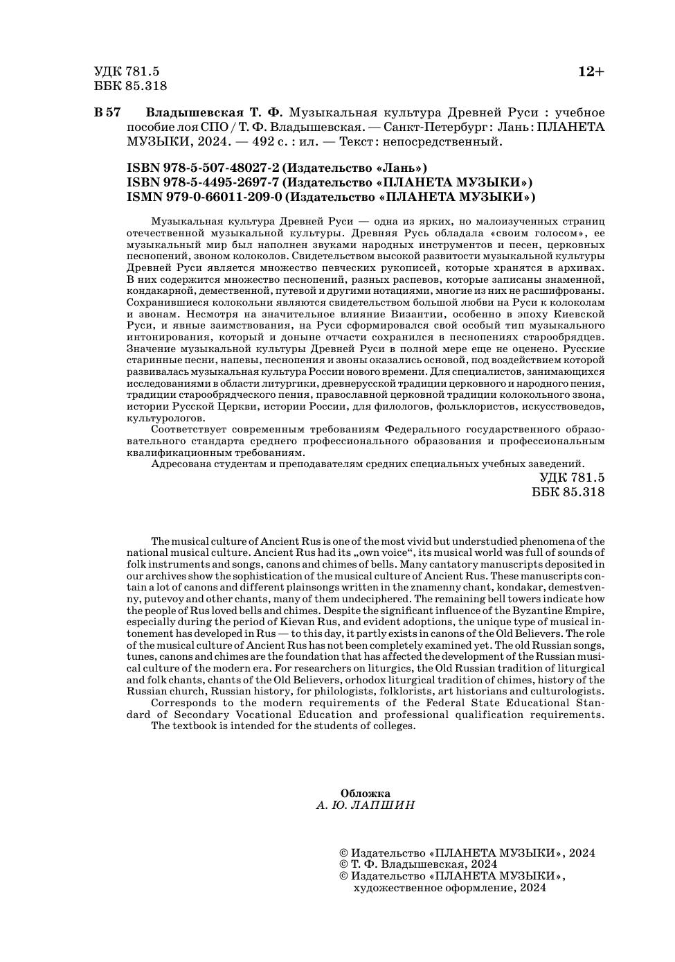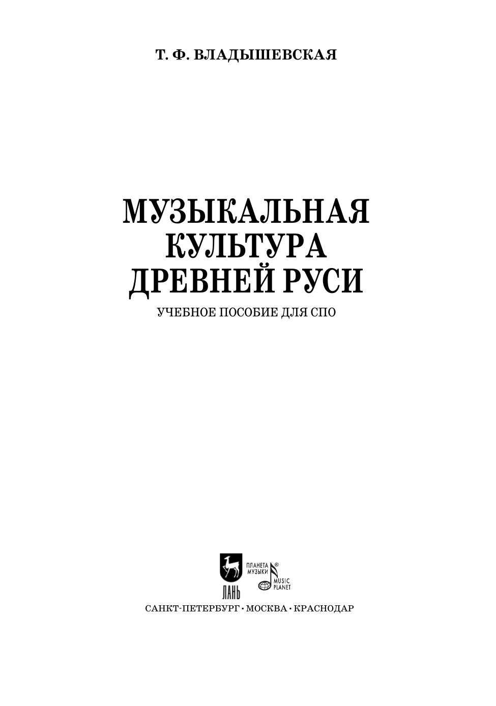 Музыкальная культура Древней Руси — одна из ярких, но малоизученных страниц отечественной музыкальной культуры. Древняя Русь обладала «своим голосом», ее музыкальный мир был наполнен звуками народных инструментов и песен, церковных песнопений, звоном колоколов. Свидетельством высокой развитости музыкальной культуры Древней Руси является множество певческих рукописей, которые хранятся в архивах. В них содержится множество песнопений, разных распевов, которые записаны знаменной, кондакарной, демественной, путевой и другими нотациями, многие из них не расшифрованы.Сохранившиеся колокольни являются свидетельством большой любви на Руси к колоколам и звонам. Несмотря на значительное влияние Византии, особенно в эпоху Киевской Руси, и явные заимствования, на Руси сформировался свой особый тип музыкального интонирования, который и доныне отчасти сохранился в песнопениях старообрядцев. Значение музыкальной культуры Древней Руси в полной мере еще не оценено. Русские старинные песни, напевы, песнопения и звоны оказались основой, под воздействием которой развивалась музыкальная культура России нового времени. Для специалистов, занимающихся исследованиями в области литургики, древнерусской традиции церковного и народного пения, традиции старообрядческого пения, православной церковной традиции колокольного звона, истории Русской Церкви, истории России, для филологов, фольклористов, искусствоведов, культурологов. Соответствует современным требованиям Федерального государственного образовательного стандарта среднего профессионального образования и профессиональным квалификационным требованиям. Адресована студентам и преподавателям средних специальных учебных заведений. The musical culture of Ancient Rus is one of the most vivid but understudied phenomena of the national musical culture. Ancient Rus had its „own voice“, its musical world was full of sounds of folk instruments and songs, canons and chimes of bells. Many cantatory manuscripts deposited in our archives show the sophistication of the musical culture of Ancient Rus. These manuscripts contain a lot of canons and different plainsongs written in the znamenny chant, kondakar, demestvenny, putevoy and other chants, many of them undeciphered. The remaining bell towers indicate how the people of Rus loved bells and chimes. Despite the significant influence of the Byzantine Empire, especially during the period of Kievan Rus, and evident adoptions, the unique type of musical intonement has developed in Rus — to this day, it partly exists in canons of the Old Believers. The role of the musical culture of Ancient Rus has not been completely examined yet. The old Russian songs, tunes, canons and chimes are the foundation that has affected the development of the Russian musical culture of the modern era. For researchers on liturgics, the Old Russian tradition of liturgical and folk chants, chants of the Old Believers, orhodox liturgical tradition of chimes, history of the Russian church, Russian history, for philologists, folklorists, art historians and culturologists. Corresponds to the modern requirements of the Federal State Educational Standard of Secondary Vocational Education and professional qualification requirements. The textbook is intended for the students of colleges.