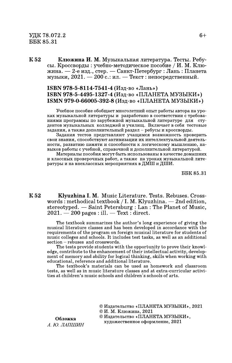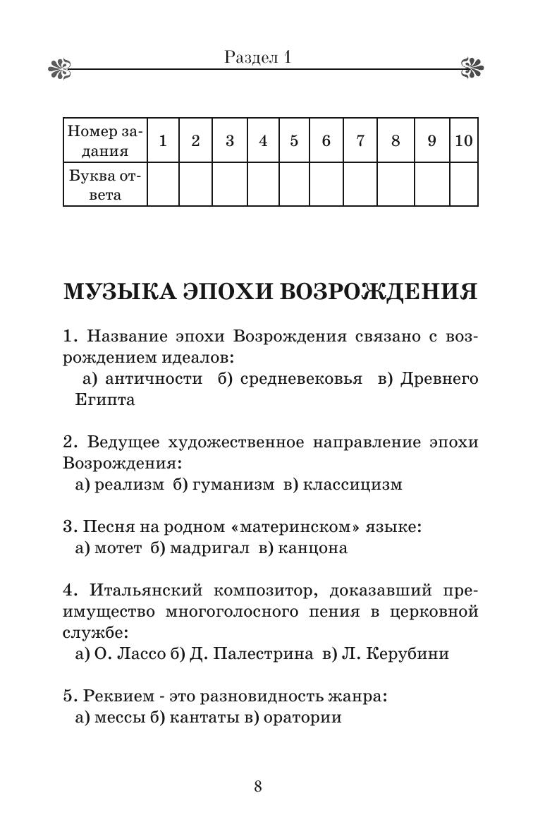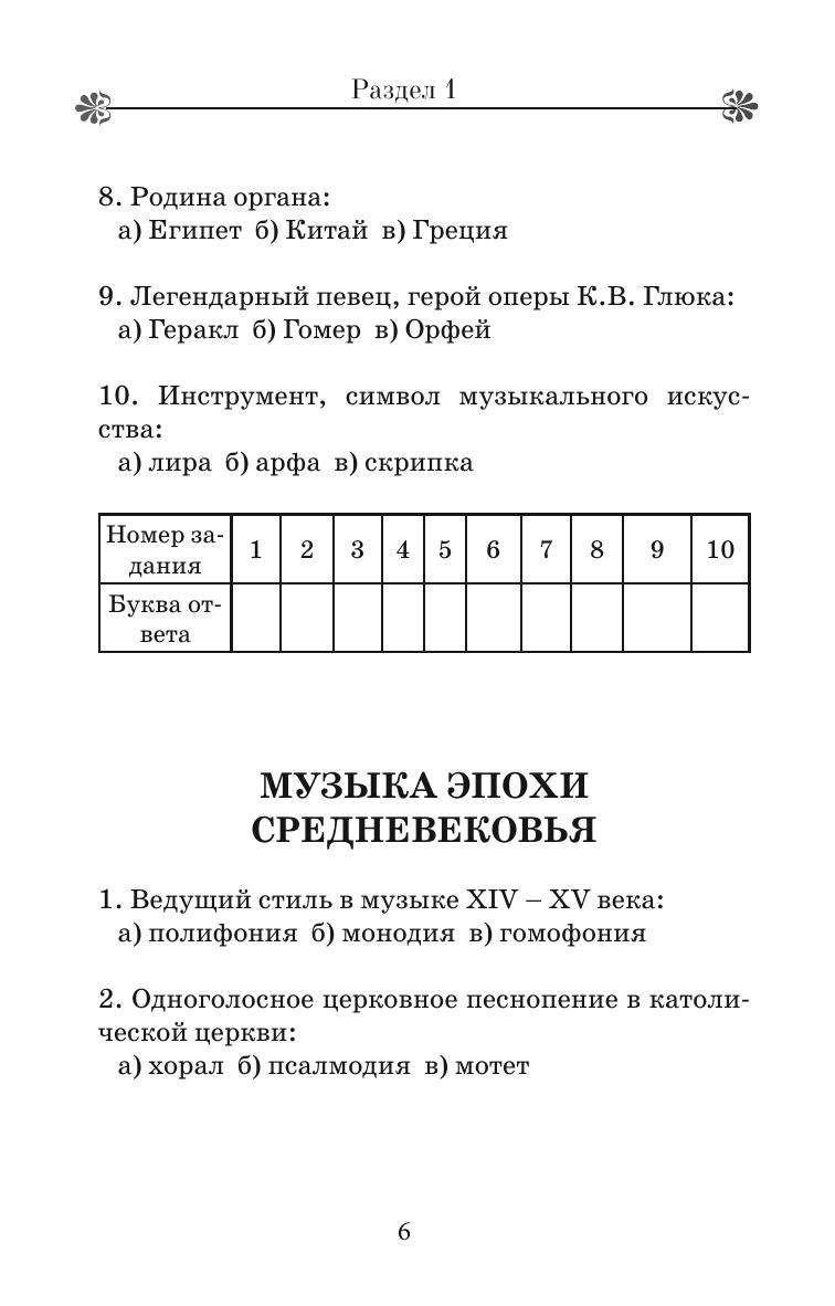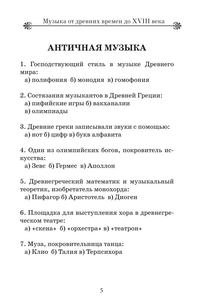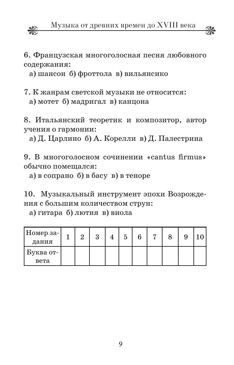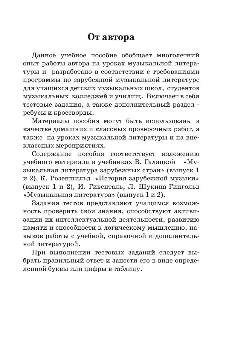 Учебное пособие обобщает многолетний опыт работы автора на уроках музыкальной литературы и разработано в соответствии с требованиями программы по зарубежной музыкальной литературе для студентов музыкальных колледжей и училищ. Включает в себя тестовые задания, а также дополнительный раздел — ребусы и кроссворды. Задания тестов представляют учащимся возможность проверить свои знания, способствуют активизации их интеллектуальной деятельности, развитию памяти и способности к логическому мышлению, навыков работы с учебной, справочной и дополнительной литературой. Материалы пособия могут быть использованы в качестве домашних и классных проверочных работ, а также на уроках музыкальной литературы и на внеклассных мероприятиях в ДМШ и ДШИ.
