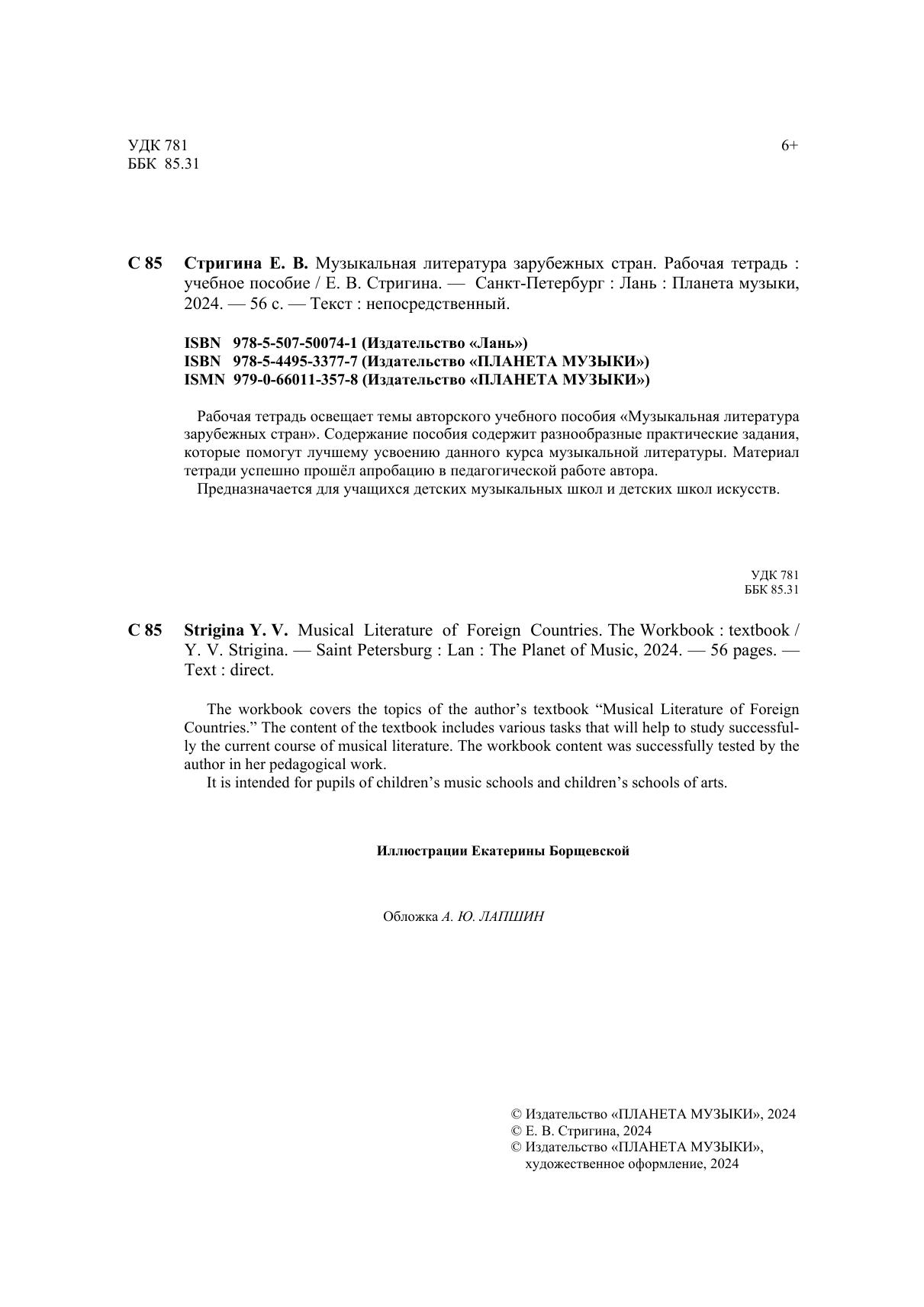 Рабочая тетрадь освещает темы авторского учебного пособия «Музыкальная литература зарубежных стран». Содержание пособия содержит разнообразные практические задания, которые помогут лучшему усвоению данного курса музыкальной литературы. Материал тетради успешно прошел апробацию в педагогической работе автора. Предназначается для учащихся детских музыкальных школ и детских школ искусств. The workbook covers the topics of the author’s textbook “Musical Literature of Foreign Countries.” The content of the textbook includes various tasks that will help to study successfully the current course of musical literature. The workbook content was successfully tested by the author in her pedagogical work. It is intended for pupils of children’s music schools and children’s schools of arts.