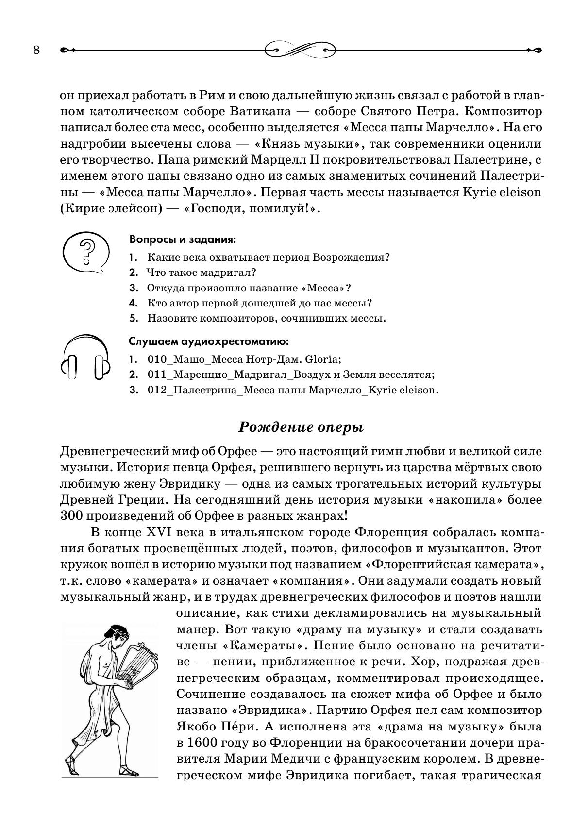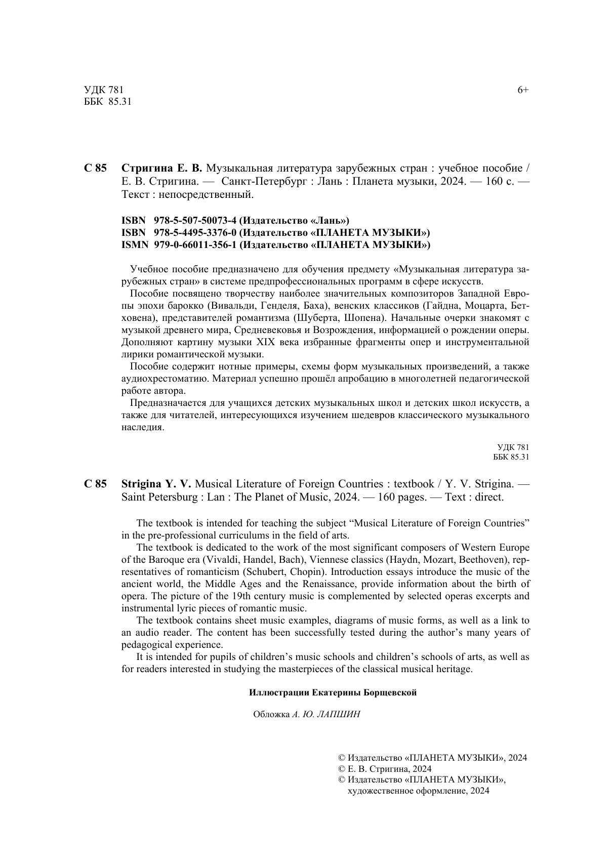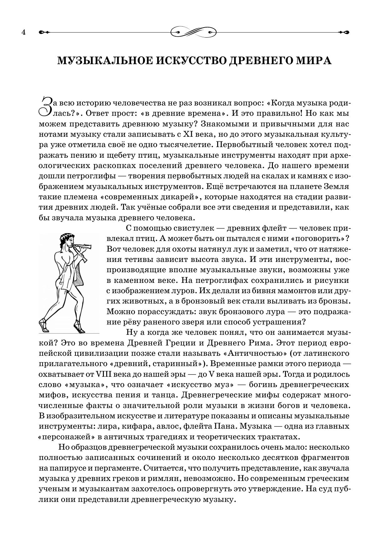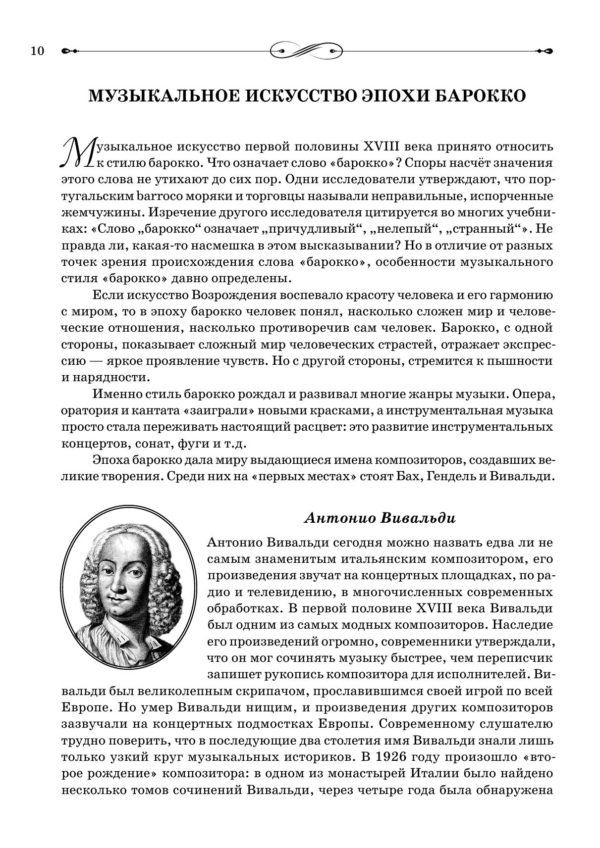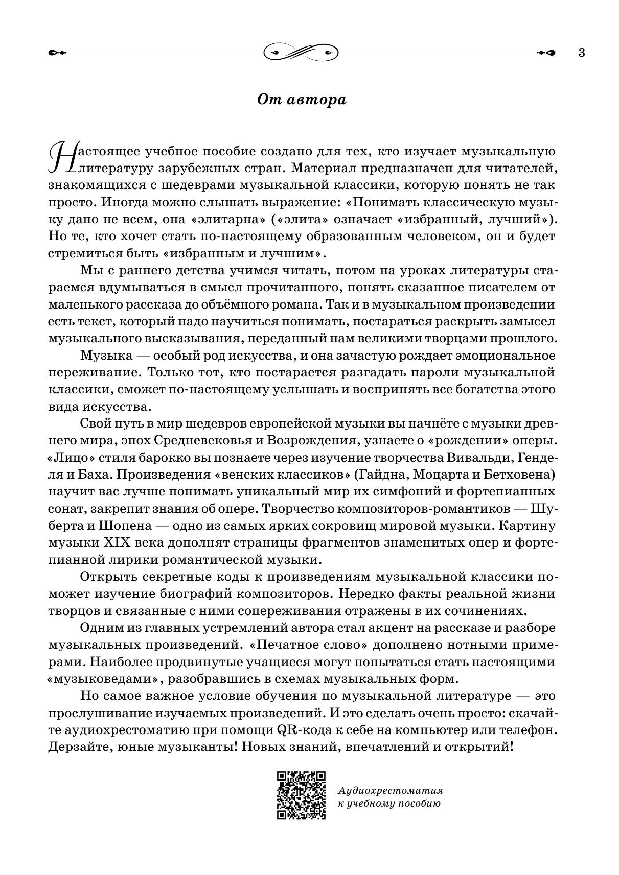 Учебное пособие предназначено для обучения предмету «Музыкальная литература зарубежных стран» в системе предпрофессиональных программ в сфере искусств. Пособие посвящено творчеству наиболее значительных композиторов Западной Европы эпохи барокко (Вивальди, Генделя, Баха), венских классиков (Гайдна, Моцарта, Бетховена), представителей романтизма (Шуберта, Шопена). Начальные очерки знакомят с музыкой древнего мира, Средневековья и Возрождения, информацией о рождении оперы. Дополняют картину музыки ХIХ века избранные фрагменты опер и инструментальной лирики романтической музыки. Пособие содержит нотные примеры, схемы форм музыкальных произведений, а также аудиохрестоматию. Материал успешно прошел апробацию в многолетней педагогической работе автора. Предназначается для учащихся детских музыкальных школ и детских школ искусств, а также для читателей, интересующихся изучением шедевров классического музыкального наследия. The textbook is intended for teaching the subject “Musical Literature of Foreign Countries” in the pre-professional curriculums in the field of arts. The textbook is dedicated to the work of the most significant composers of Western Europe of the Baroque era (Vivaldi, Handel, Bach), Viennese classics (Haydn, Mozart, Beethoven), representatives of romanticism (Schubert, Chopin). Introduction essays introduce the music of the ancient world, the Middle Ages and the Renaissance, provide information about the birth of opera. The picture of the 19th century music is complemented by selected operas excerpts and instrumental lyric pieces of romantic music. The textbook contains sheet music examples, diagrams of music forms, as well as a link to an audio reader. The content has been successfully tested during the author’s many years of pedagogical experience. It is intended for pupils of children’s music schools and children’s schools of arts, as well as for readers interested in studying the masterpieces of the classical musical heritage.