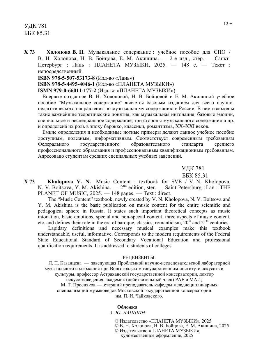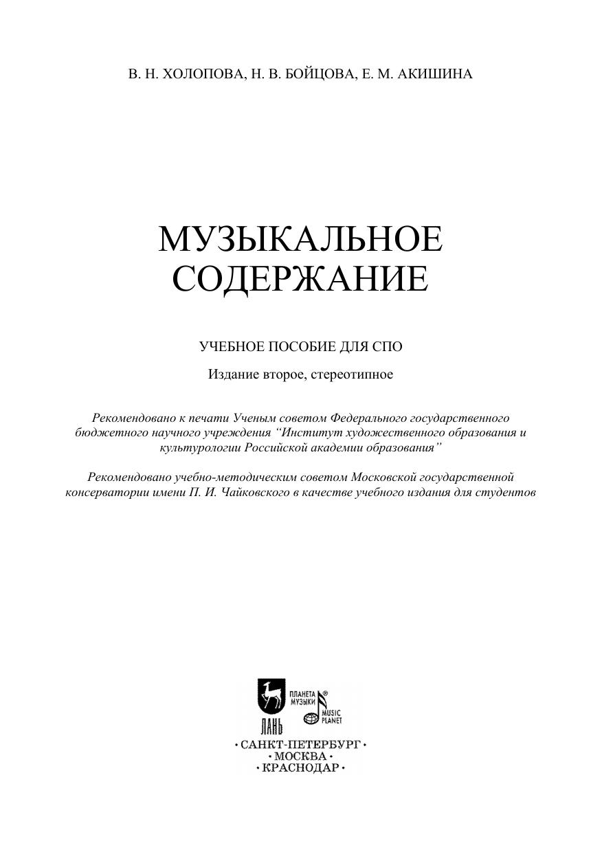 Впервые созданное В. Н. Холоповой, Н. В. Бойцовой и Е. М. Акишиной учебное пособие “Музыкальное содержание” является базовым изданием для всего научно-педагогического направления по музыкальному содержанию в России. В нем изложены такие важнейшие теоретические понятия, как музыкальная интонация, базовые эмоции, специальное и неспециальное содержание, три стороны музыкального содержания и др. и определена их роль в эпоху барокко, классики, романтизма, XX–XXI веков. Емкие определения и необходимые нотные примеры делают данное учебное пособие доступным, полезным, информативным. Соответствует современным требованиям Федерального государственного образовательного стандарта среднего профессионального образования и профессиональным квалификационным требованиям. Адресовано студентам средних специальных учебных заведений. The “Music Content” textbook, newly created by V. N. Kholopova, N. V. Boitsova and Y. M. Akishina is the basic publication on music content for the entire scientific and pedagogical sphere in Russia. It states such important theoretical concepts as music intonation, basic emotions, special and non-special content, three aspects of music content, etc. and defines their role in the era of baroque, classics, romanticism, 20th and 21st centuries. Lapidary definitions and necessary musical examples make this textbook understandable, useful, informative. Corresponds to the modern requirements of the Federal State Educational Standard of Secondary Vocational Education and professional qualification requirements. It is addressed to students of colleges.