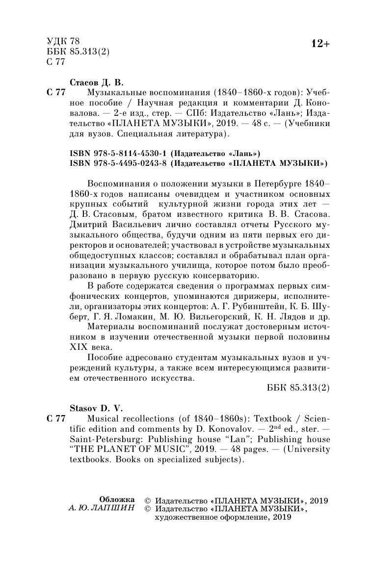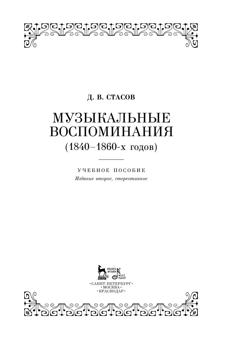 Воспоминания о положении музыки в Петербурге 1840–1860-х годов написаны очевидцем и участником основных крупных событий культурной жизни города этих лет — Д. В. Стасовым, братом известного критика В. В. Стасова. Дмитрий Васильевич лично составлял отчеты Русского музыкального общества, будучи одним из пяти первых его директоров и основателей; участвовал в устройстве музыкальных общедоступных классов; составлял и обрабатывал план организации музыкального училища, которое потом было преобразовано в первую русскую консерваторию.