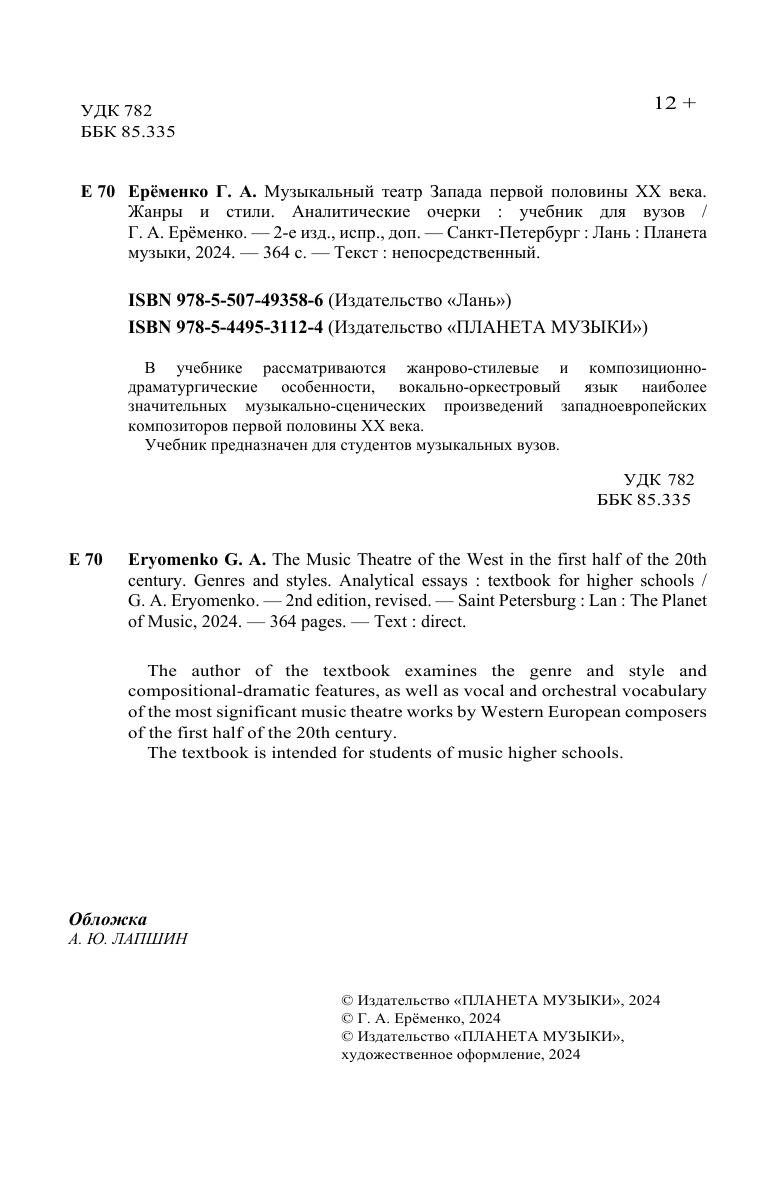 В учебном пособии рассматриваются жанрово-стилевые и композиционно-драматургические особенности, вокально-оркестровый язык наиболее значительных музыкально-сценических произведений западноевропейских композиторов первой половины XX века. Учебник предназначен для студентов музыкальных вузов. The author of the textbook examines the genre and style and compositional-dramatic features, as well as vocal and orchestral vocabulary of the most significant music theatre works by Western European composers of the first half of the 20th century. The textbook is intended for students of music higher schools.