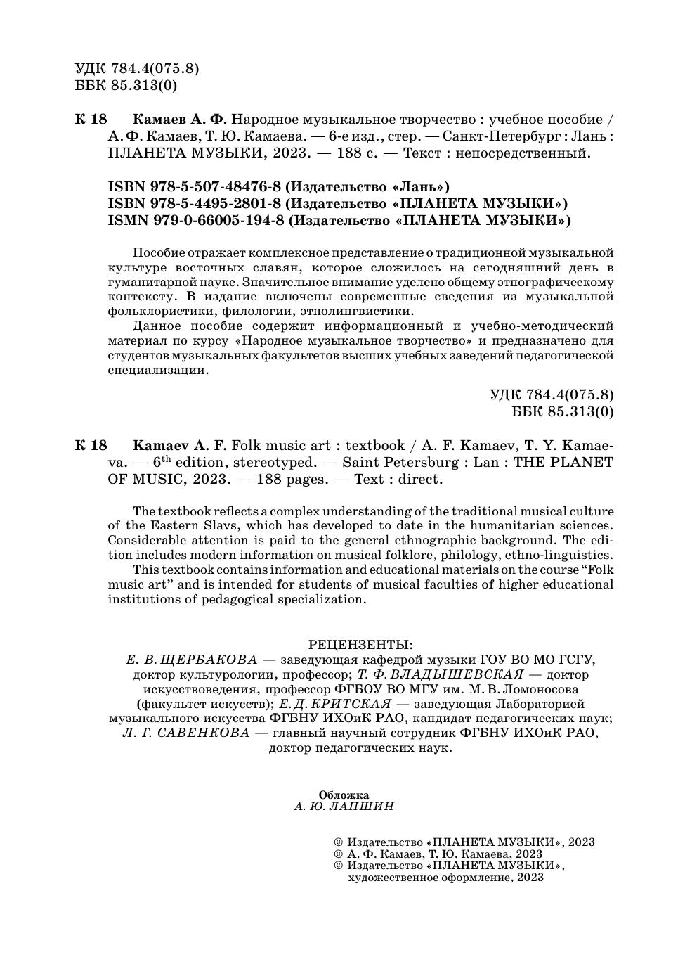 Пособие отражает комплексное представление о традиционной музыкальной культуре восточных славян, которое сложилось на сегодняшний день в гуманитарной науке. Значительное внимание уделено общему этнографическому контексту. В издание включены современные сведения из музыкальной фольклористики, филологии, этнолингвистики. Данное пособие содержит информационный и учебно-методический материал по курсу «Народное музыкальное творчество» и предназначено для студентов музыкальных факультетов высших учебных заведений педагогической специализации. The textbook reflects a complex understanding of the traditional musical culture of the Eastern Slavs, which has developed to date in the humanitarian sciences. Considerable attention is paid to the general ethnographic background. The edition includes modern information on musical folklore, philology, ethno-linguistics. This textbook contains information and educational materials on the course "Folk music art" and is intended for students of musical faculties of higher educational institutions of pedagogical specialization.