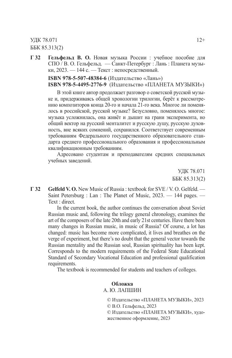 В этой книге автор продолжает разговор о советской русской музыке и, придерживаясь общей хронологии трилогии, берёт к рассмотрению композиторов конца 20 и начала 21 века. Многое ли поменялось в российской, русской музыке? Безусловно, поменялось многое: музыка усложнилась, она живёт и дышит на грани эксперимента, но общий вектор на русский менталитет и русскую душу, русскую духовность, вне всяких сомнений, сохранился. Соответствует современным требованиям Федерального государственного образовательного стандарта среднего профессионального образования и профессиональным квалификационным требованиям. Адресовано студентам и преподавателям средних специальных учебных заведений. In the current book, the author continues the conversation about Soviet Russian music and, following the trilogy general chronology, examines the art of the composers of the late 20th and early 21st centuries. Have there been many changes in Russian music, in music of Russia? Of course, a lot has changed: music has become more complicated, it lives and breathes on the verge of experiment, but there’s no doubt that the general vector towards the Russian mentality and the Russian soul, Russian spirituality has been kept. Corresponds to the modern requirements of the Federal State Educational Standard of Secondary Vocational Education and professional qualification requirements. The textbook is recommended for students and teachers of colleges.