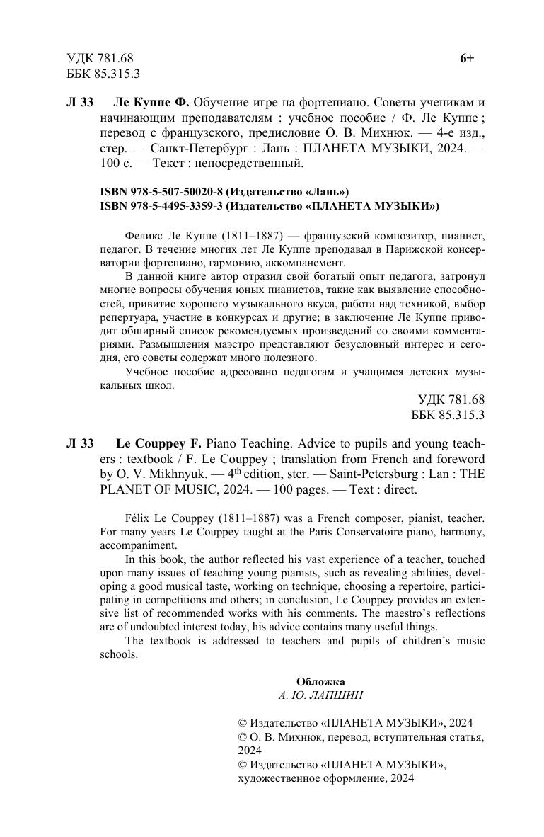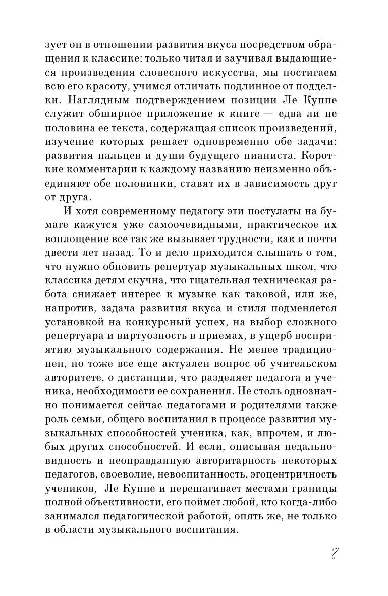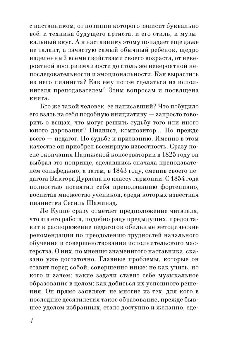 Феликс Ле Куппе (1811–1887) – французский композитор, пианист, педагог. В течение многих лет Ле Куппе преподавал в Парижской консерватории фортепиано, гармонию, аккомпанемент. В данной книге автор отразил свой богатый опыт педагога, затронул многие вопросы обучения юных пианистов, такие как выявление способностей, привитие хорошего музыкального вкуса, работа над техникой, выбор репертуара, участие в конкурсах и другие, в заключение Ле Куппе приводит обширный список рекомендуемых произведений со своими комментариями. Размышления маэстро представляют безусловный интерес и сегодня, его советы содержат много полезного. Учебное пособие адресовано педагогам и учащимся детских музыкальных школ.