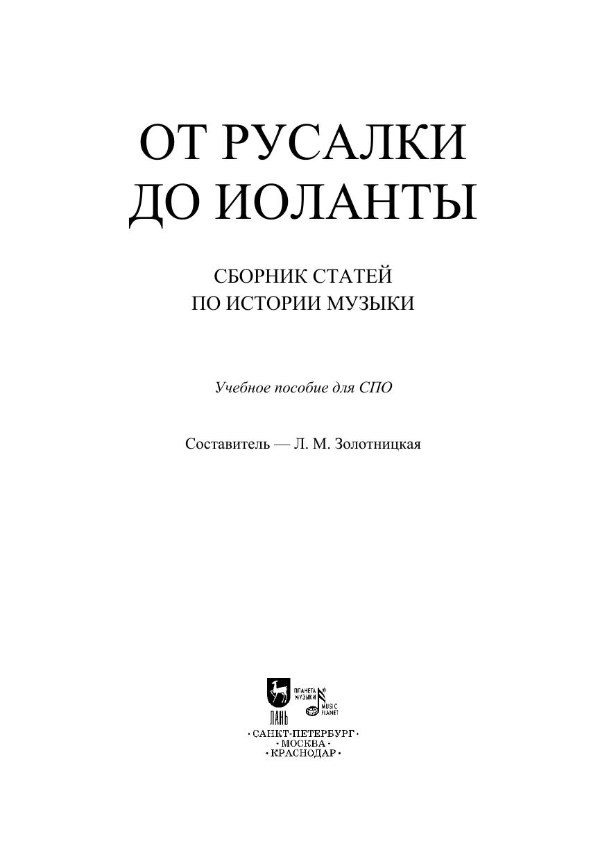 Сборник статей «От Русалки до Иоланты» посвящен различным аспектам истории музыки. В разделе «Музыка и литература» рассматриваются характеристики фольклорных и литературных персонажей в музыкальных и литературных сочинениях. Ценным дополнением к статьям являются таблицы, основанные на многочисленных примерах из русской и зарубежной музыки. Раздел «Специфика музыкального языка» посвящен семантике солирующих тембров в операх, семан-тике тональностей, проблеме «цветного слуха». Раздел «История музыки» представляет исследования о зарубежных музыкантах, посетивших Санкт-Петербург в первой половине XIX в. В «Методических аспектах преподавания истории музыки» предлагаются варианты изучения оперы на уроках истории музыки в музыкальных училищах. Соответствует современным требованиям Федерального государственного образовательного стандарта среднего профессионального образования и профес-сиональным квалификационным требованиям. Книга адресована педагогам и средних специальных учебных заведений. The collection of articles From the Mermaid to Iolanta is devoted to various sides of the music history. In the Music and Literature section the characteristics of folklore and literary characters in musical and literary works are examined. A valuable addition to the articles are the tables with numerous examples from Russian and foreign music. The Specifics of Musical Language section is devoted to the semantics of solo timbres in operas, the semantics of keys, and the issue of “color hearing”. The Music History section presents the study on foreign musicians who visited St. Petersburg in the first half of the 19th century. The Methodological Aspects of Teaching the Music History offers options for studying opera at music history lessons at music colleges. Corresponds to the modern requirements of the Federal State Educational Standard of Secondary Vocational Education and professional qualification requirements. The book is addressed to teachers and students of colleges.