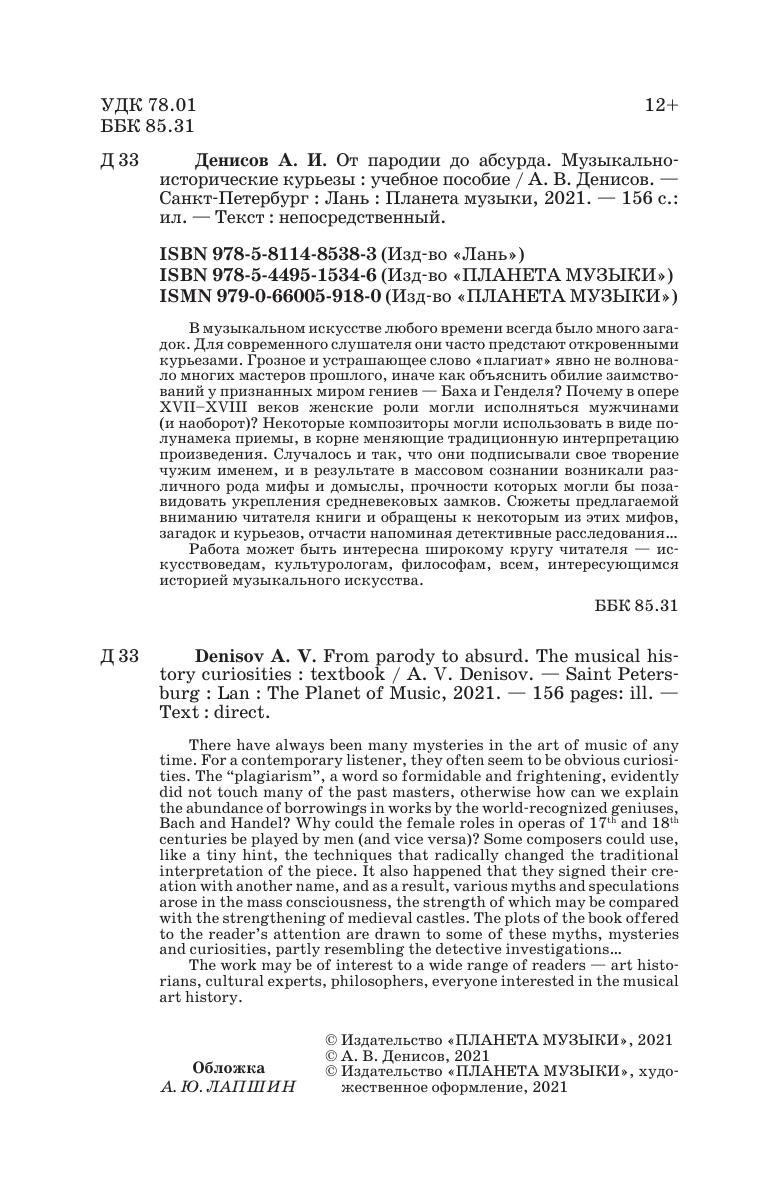 There have always been many mysteries in the art of music of any time. For a contemporary listener, they often seem to be obvious curiosities. The “plagiarism”, a word so formidable and frightening, evidently did not touch many of the past masters, otherwise how can we explain the abundance of borrowings in works by the world-recognized geniuses, Bach and Handel? Why could the female roles in operas of 17th and 18th centuries be played by men (and vice versa)? Some composers could use, like a tiny hint, the techniques that radically changed the traditional interpretation of the piece. It also happened that they signed their creation with another name, and as a result, various myths and speculations arose in the mass consciousness, the strength of which may be compared with the strengthening of medieval castles. The plots of the book offered to the reader’s attention are drawn to some of these myths, mysteries and curiosities, partly resembling the detective investigations...