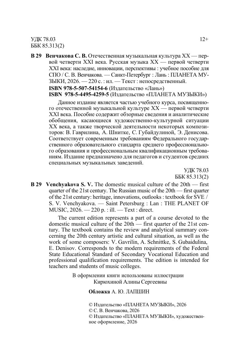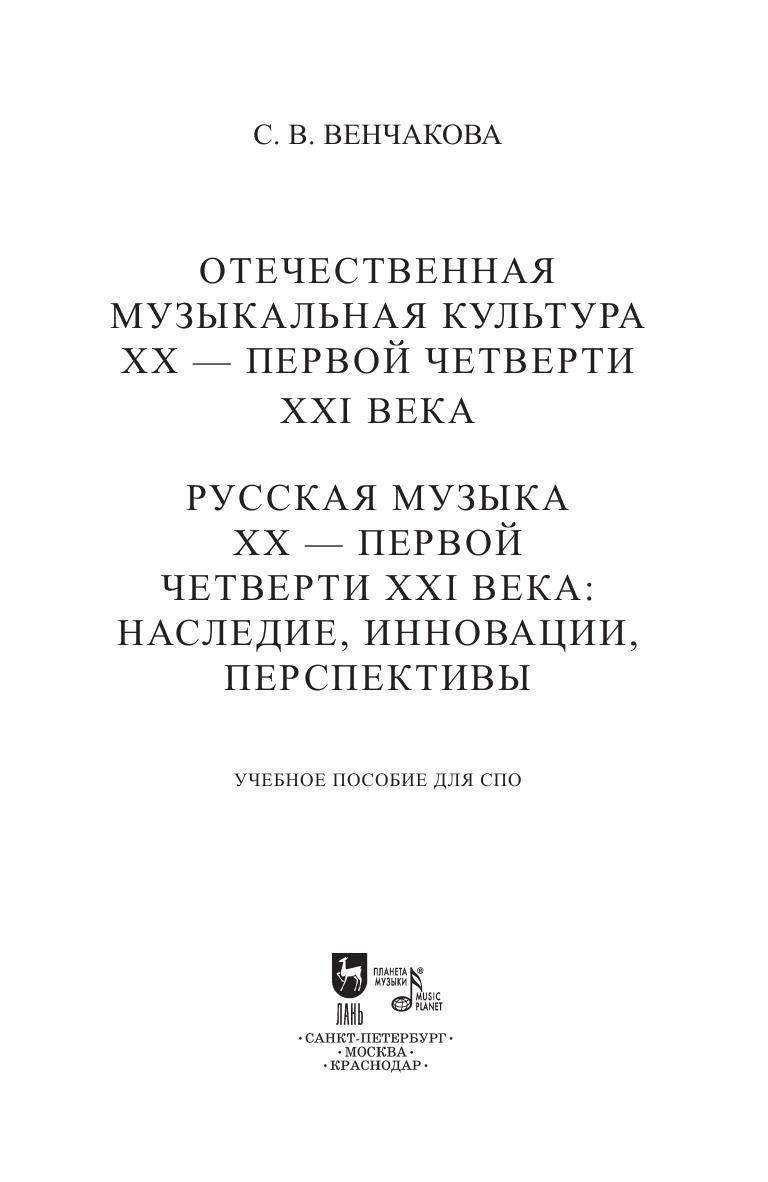 Данное издание является частью учебного курса, посвященного отечественной музыкальной культуре XX — первой четверти XXI века. Пособие содержит обзорные сведения и аналитические обобщения, касающиеся художественно-культурной ситуации XX века, а также творческой деятельности некоторых композиторов: В. Гаврилина, А. Шнитке, С. Губайдулиной, Э. Денисова. Соответствует современным требованиям Федерального государственного образовательного стандарта среднего профессионального образования и профессиональным квалификационным требованиям. Издание предназначено для педагогов и студентов средних специальных музыкальных заведений. The current edition represents a part of a course devoted to the domestic musical culture of the 20th — first quarter of the 21st century. The textbook contains the review and analytical summary concerning the 20th century artistic and cultural situation, as well as the work of some composers: V. Gavrilin, A. Schnittke, S. Gubaidulina, E. Denisov. Corresponds to the modern requirements of the Federal State Educational Standard of Secondary Vocational Education and professional qualification requirements. The edition is intended for teachers and students of music colleges.