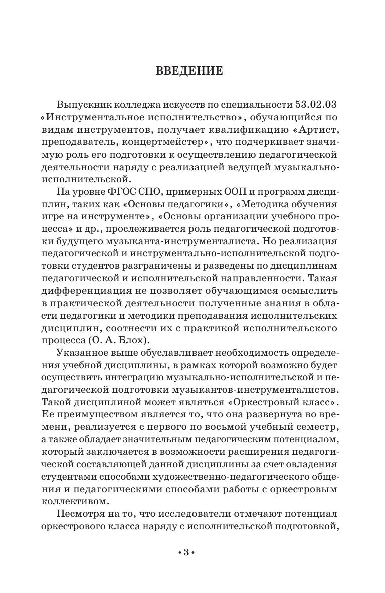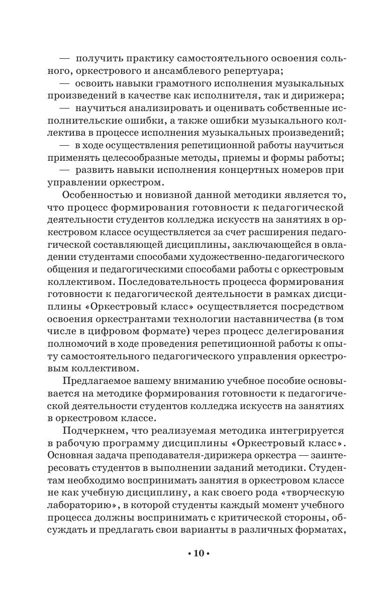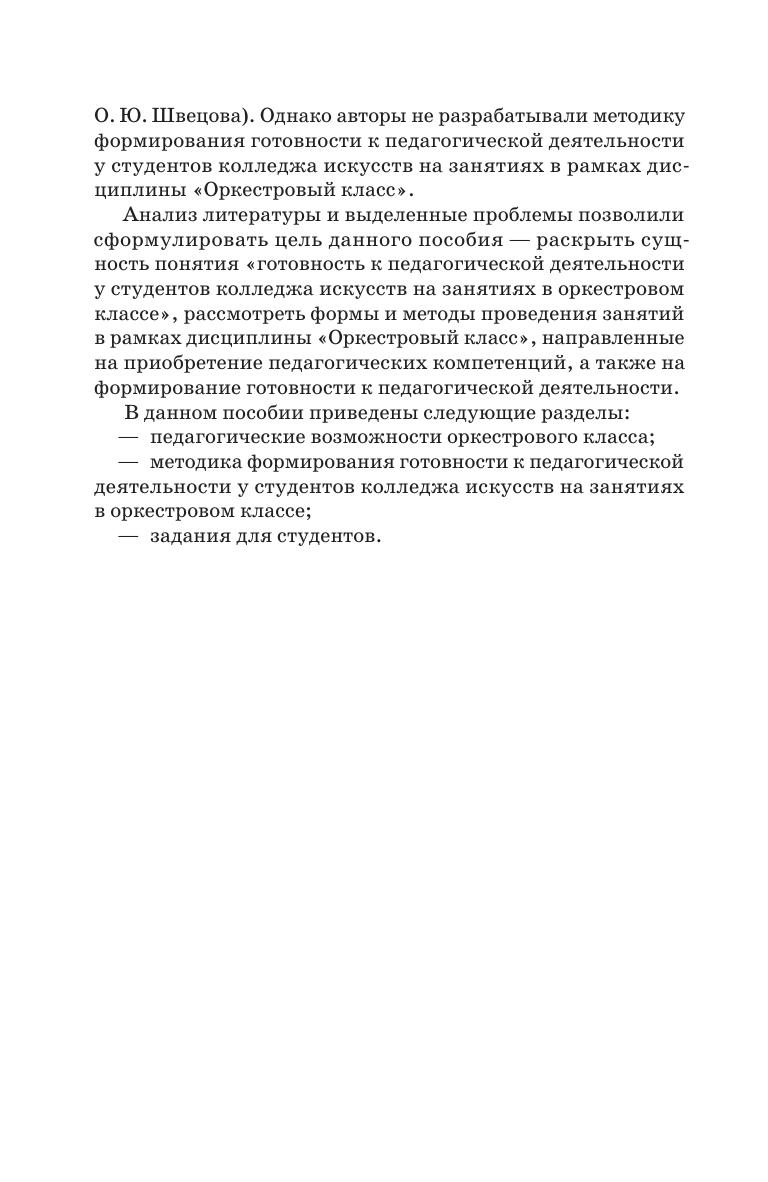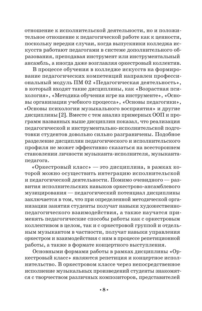 Учебное пособие предназначено для студентов колледжа, обучающихся по направлению подготовки 53.02.03 «Инструментальное исполнительство». В пособии рассматривается проблема актуальности процесса формирования готовности к педагогической деятельности у студентов колледжа искусств, разбираются педагогические возможности оркестрового класса, описываются методы и формы проведения занятий в рамках данной дисциплины, направленные на приобретение педагогических компетенций. Соответствует современным требованиям Федерального государственного образовательного стандарта среднего профессионального образования и профессиональным квалификационным требованиям. The textbook is intended for college students studying the “Instrumental Performance” (field og training 53.02.03). The textbook examines the problem of the relevance of the process of training the readiness for teaching activity among the students of colleges of arts, examines the pedagogical capabilities at the orchestra class, describes methods and forms of conducting classes teaching this subject, aimed at acquiring pedagogical skills. Corresponds to the modern requirements of the Federal State Educational Standard of Secondary Vocational Education and professional qualification requirements.