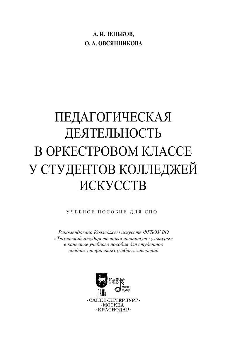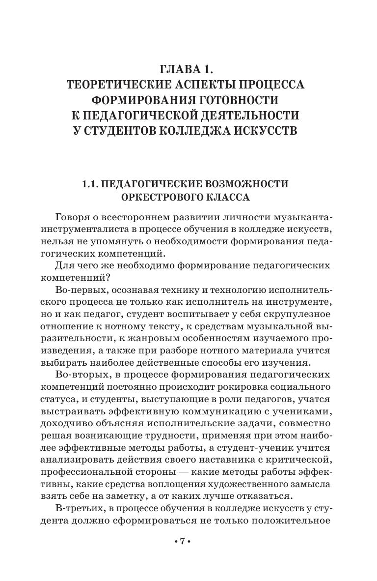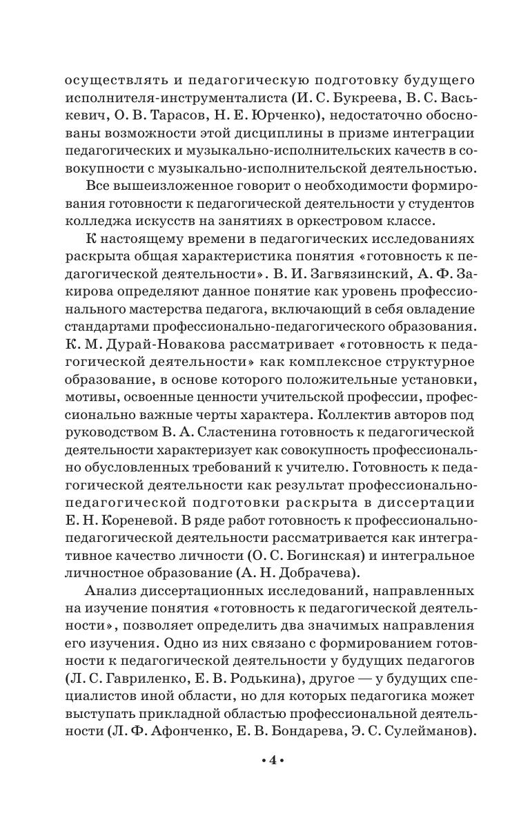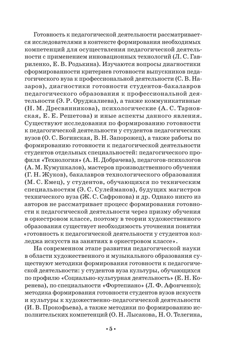 Учебное пособие предназначено для студентов колледжа, обучающихся по направлению подготовки 53.02.03 «Инструментальное исполнительство». В пособии рассматривается проблема актуальности процесса формирования готовности к педагогической деятельности у студентов колледжа искусств, разбираются педагогические возможности оркестрового класса, описываются методы и формы проведения занятий в рамках данной дисциплины, направленные на приобретение педагогических компетенций. Соответствует современным требованиям Федерального государственного образовательного стандарта среднего профессионального образования и профессиональным квалификационным требованиям. The textbook is intended for college students studying the “Instrumental Performance” (field og training 53.02.03). The textbook examines the problem of the relevance of the process of training the readiness for teaching activity among the students of colleges of arts, examines the pedagogical capabilities at the orchestra class, describes methods and forms of conducting classes teaching this subject, aimed at acquiring pedagogical skills. Corresponds to the modern requirements of the Federal State Educational Standard of Secondary Vocational Education and professional qualification requirements.