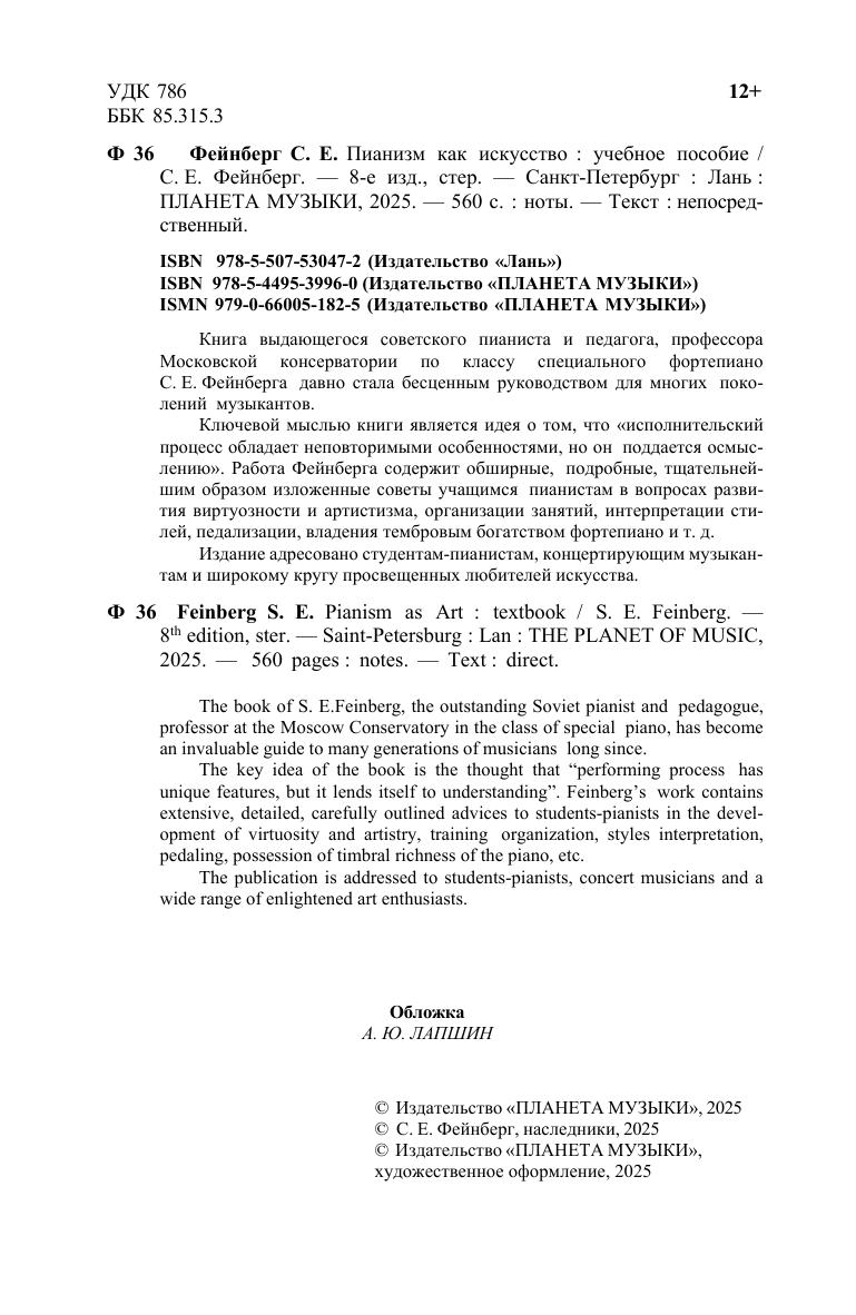 Книга выдающегося советского пианиста и педагога, профессора Московской консерватории по классу специального фортепиано, С.Е. Фейнберга давно стала бесценным руководством для многих поколений музыкантов. Ключевой мыслью книги является идея о том, что «исполнительский процесс обладает неповторимыми особенностями, но он поддается осмыслению». Работа Фейнберга содержит обширные, подробные, тщательнейшим образом изложенные, советы учащимся пианистам в вопросах развития виртуозности и артистизма, организации занятий, интерпретации стилей, педализации, владения тембровым богатством фортепиано и т. д. Издание адресовано студентам-пианистам, концертирующим музыкантам и широкому кругу просвещенных любителей искусства.