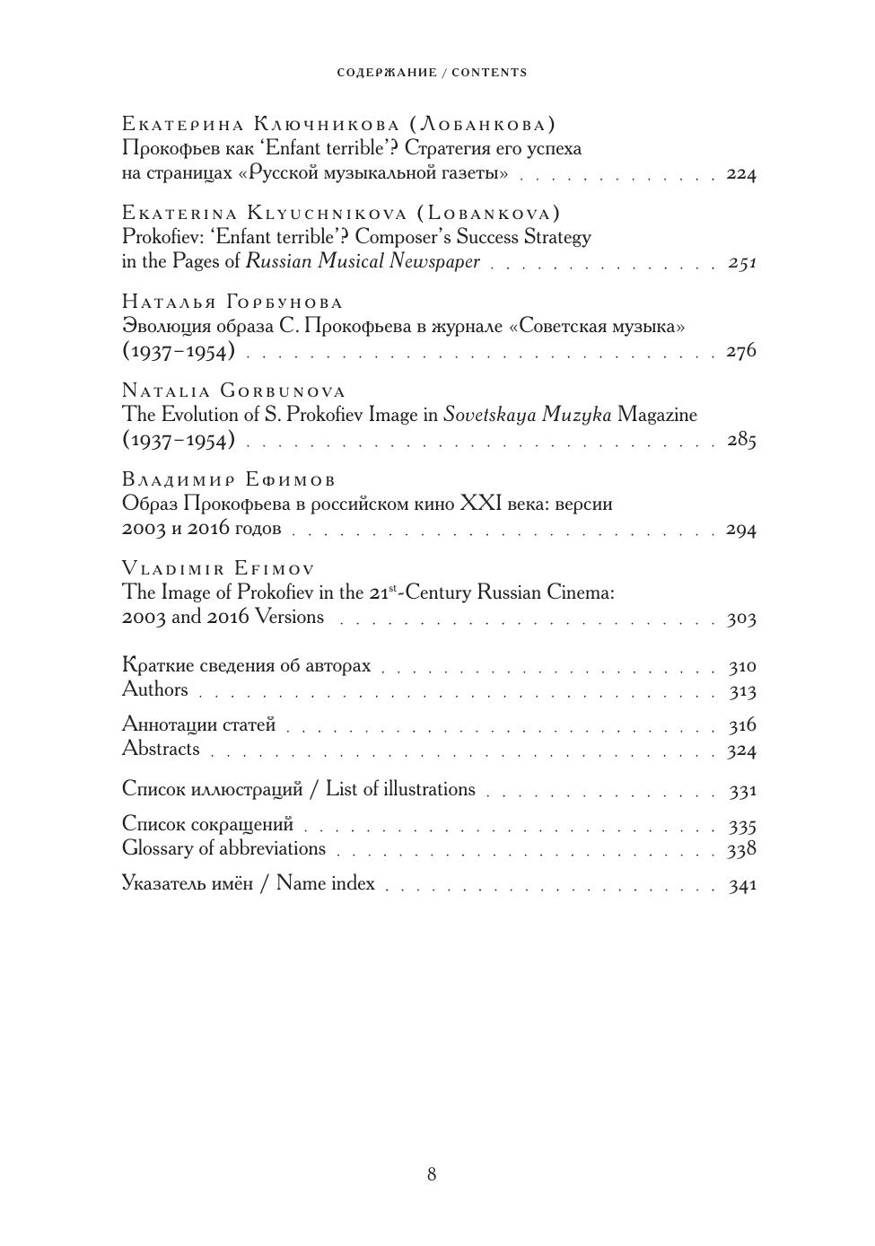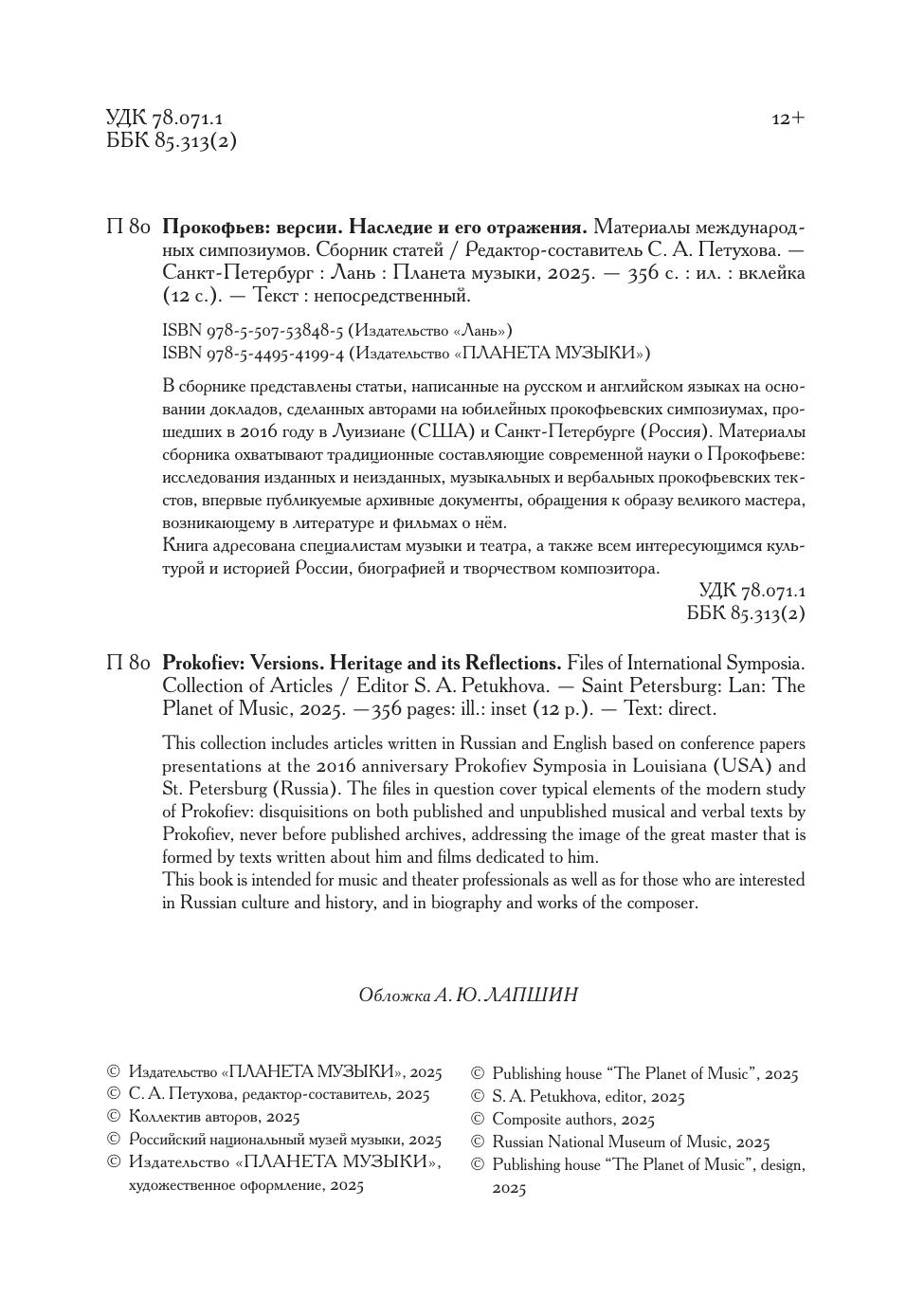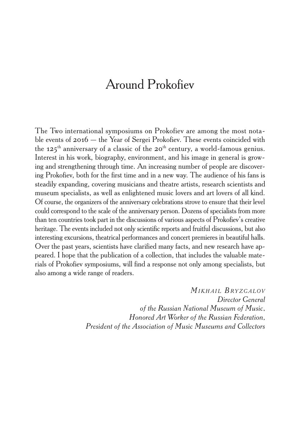 В сборнике представлены статьи, написанные на русском и английском языках на основании докладов, сделанных авторами на юбилейных прокофьевских симпозиумах, прошедших в 2016 году в Луизиане (США) и Санкт-Петербурге (Россия). Материалы сборника охватывают традиционные составляющие современной науки о Прокофьеве: исследования изданных и неизданных, музыкальных и вербальных прокофьевских текстов, впервые публикуемые архивные документы, обращения к образу великого мастера, возникающему в литературе и фильмах о нём. Книга адресована специалистам музыки и театра, а также всем интересующимся культурой и историей России, биографией и творчеством композитора. This collection includes articles written in Russian and English based on conference papers presentations at the 2016 anniversary Prokofiev Symposia in Louisiana (USA) and St. Petersburg (Russia). The files in question cover typical elements of the modern study of Prokofiev: disquisitions on both published and unpublished musical and verbal texts by Prokofiev, never before published archives, addressing the image of the great master that is formed by texts written about him and films dedicated to him. This book is intended for music and theater professionals as well as for those who are interested in Russian culture and history, and in biography and works of the composer.
