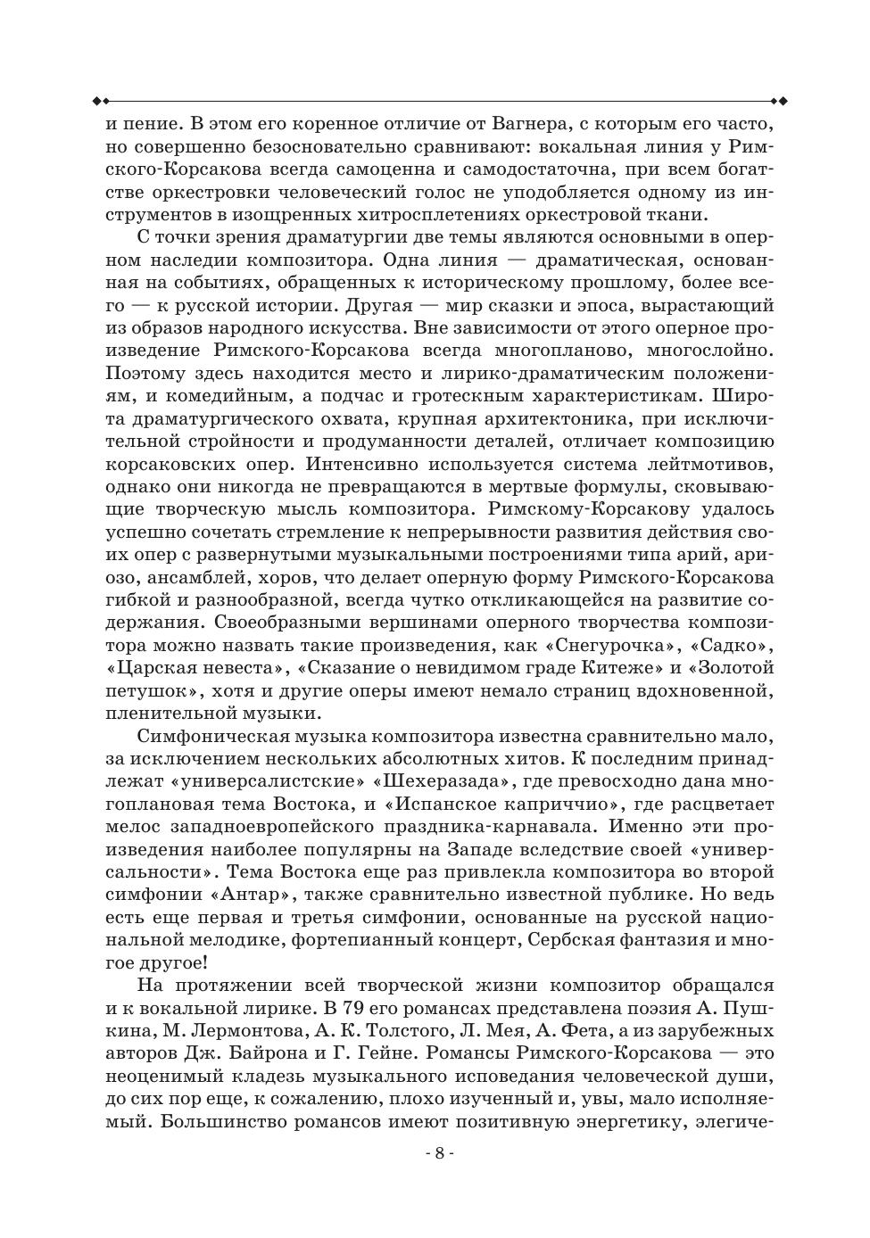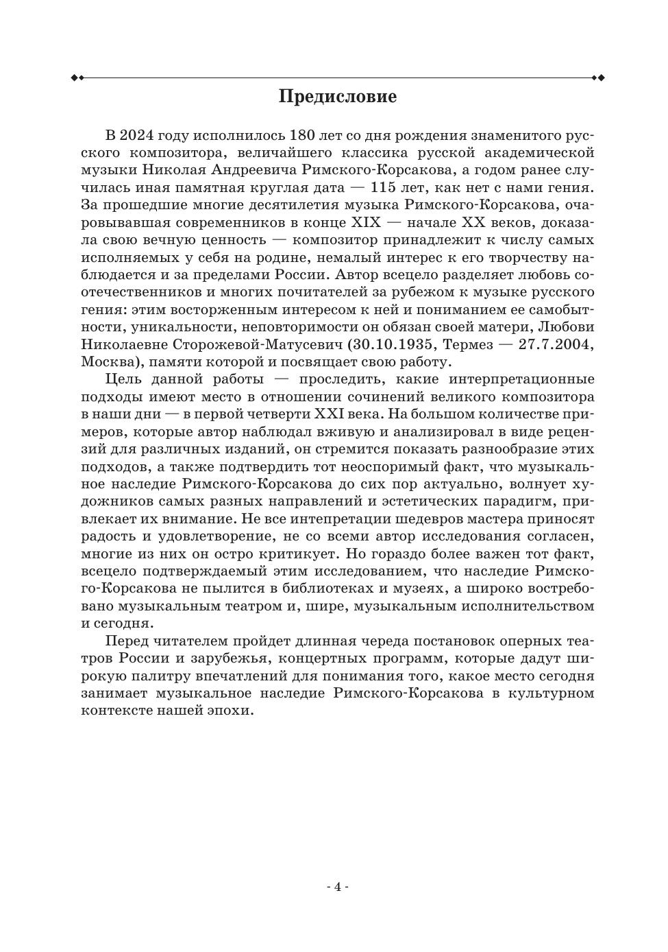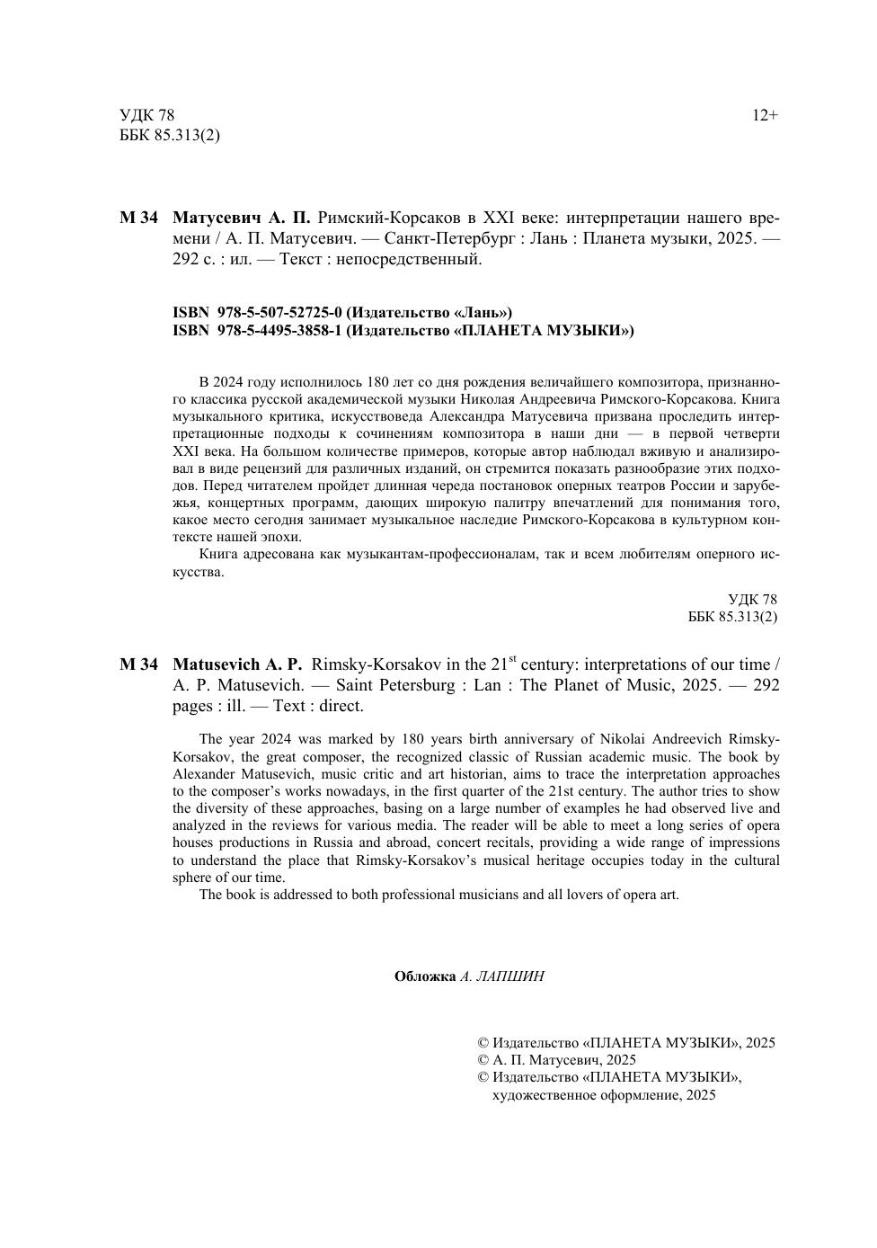 В 2024 году исполнилось 180 лет со дня рождения величайшего композитора, признанного классика русской академической музыки Николая Андреевича Римского-Корсакова. Книга музыкального критика, искусствоведа Александра Матусевича призвана проследить интерпретационные подходы к сочинениям композитора в наши дни – в первой четверти XXI века. На большом количестве примеров, которые автор наблюдал вживую и анализировал в виде рецензий для различных изданий, он стремится показать разнообразие этих подходов. Перед читателем пройдет длинная череда постановок оперных театров России и зарубежья, концертных программ, дающих широкую палитру впечатлений для понимания того, какое место сегодня занимает музыкальное наследие Римского-Корсакова в культурном контексте нашей эпохи. Книга адресована, как музыкантам-профессионалам, так и всем любителям оперного искусства. The year 2024 was marked by 180 years birth anniversary of Nikolai Andreevich Rimsky-Korsakov, the great composer, the recognized classic of Russian academic music. The book by Alexander Matusevich, music critic and art historian, aims to trace the interpretation approaches to the composer’s works nowadays, in the first quarter of the 21st century. The author tries to show the diversity of these approaches, basing on a large number of examples he had observed live and analyzed in the reviews for various media. The reader will be able to meet a long series of opera houses productions in Russia and abroad, concert recitals, providing a wide range of impressions to understand the place that Rimsky-Korsakov’s musical heritage occupies today in the cultural sphere of our time. The book is addressed to both professional musicians and all lovers of opera art.