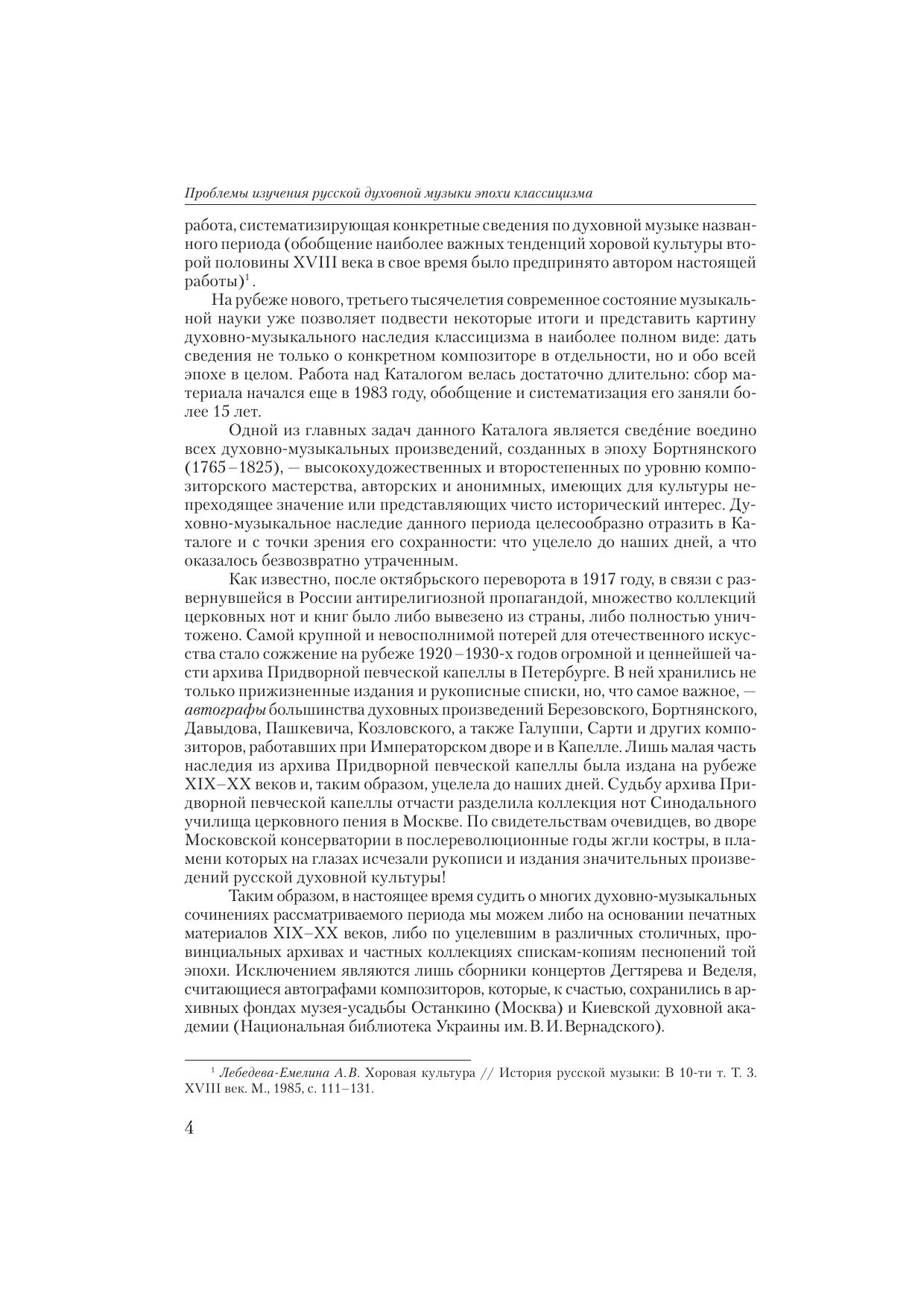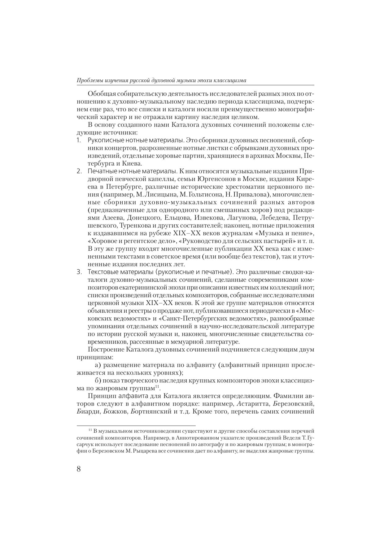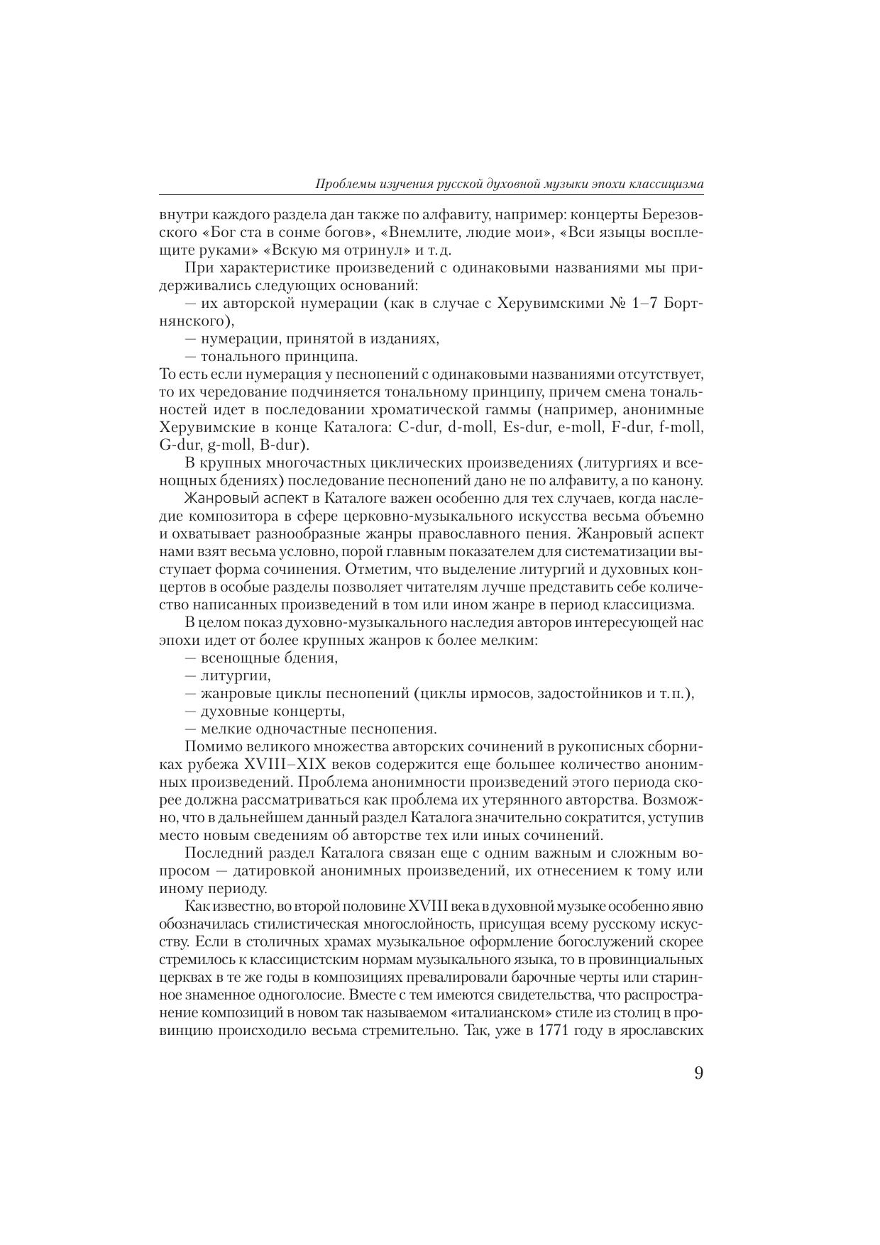 В данном каталоге представлен впервые в отечественном музыковедении свод русских духовно-музыкальных сочинений эпохи классицизма. В каталоге рассматривается музыкально-духовное творчество более 50 композиторов, охарактеризовано более 1000 церковных произведений. Музыкальные песнопения отражены как реально существующие (в рукописях или изданиях), так и не дошедшие до наших дней.