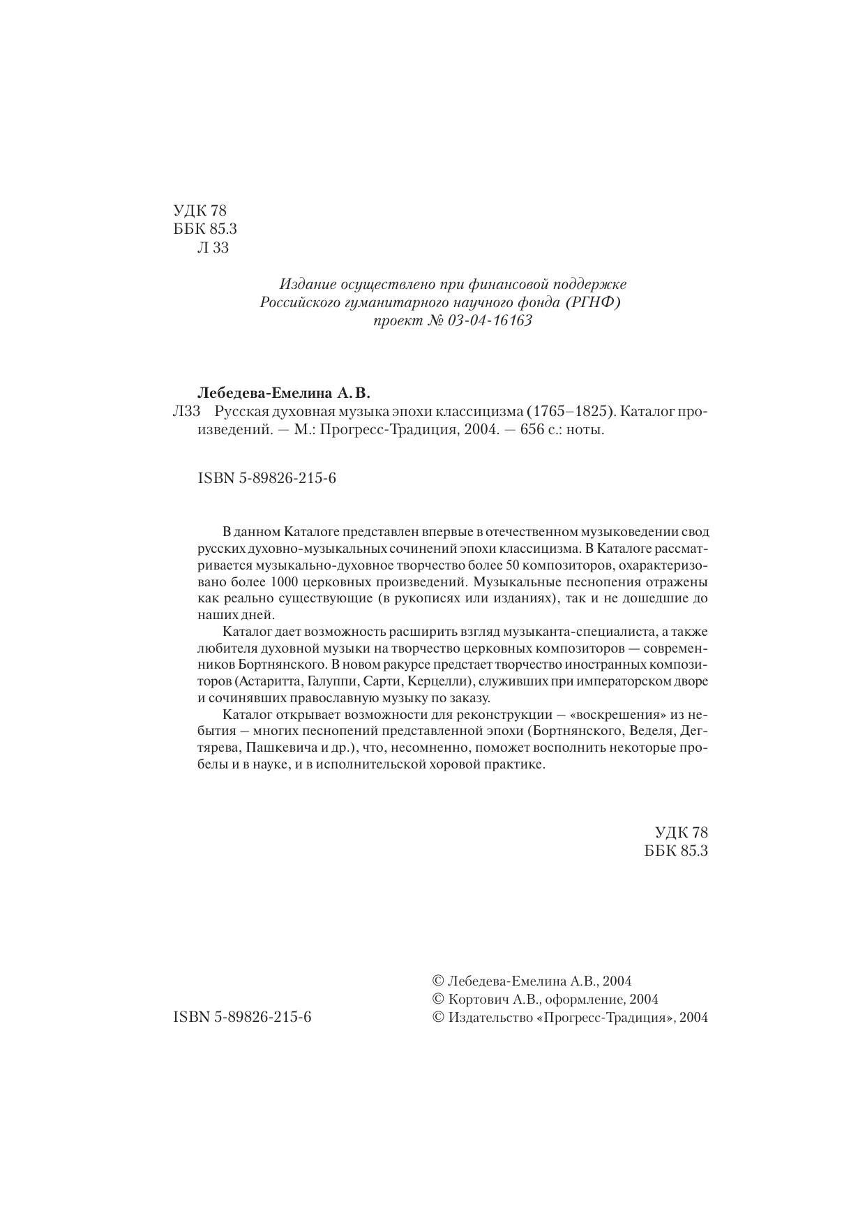 Каталог дает возможность расширить взгляд музыканта-специалиста, а также любителя духовной музыки на творчество церковных композиторов - современников Бортнянского. В новом ракурсе предстает творчество иностранных композиторов (Астаритта, Галуппи, Сарти, Керцелли), служивших при императорском дворе и сочинявших православную музыку по заказу.