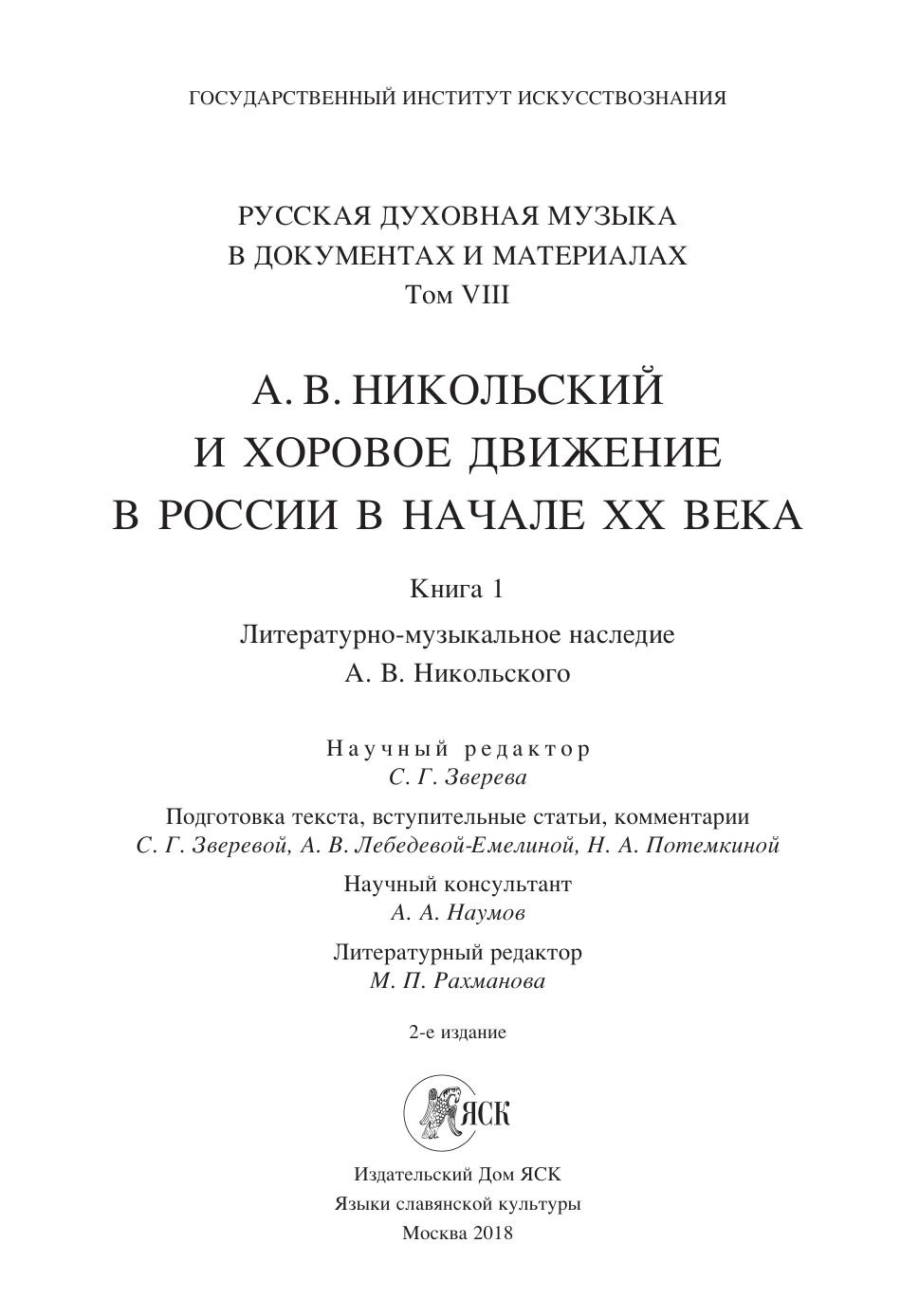 Русская духовная музыка в документах и материалах. Т. VIII: А.В. Никольский и хоровое движение в России в начале ХХ века. Кн. 1: Литературно-музыкальное наследие А. В. Никольского