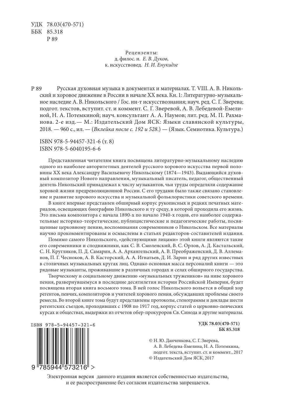 Представленная читателям книга посвящена литературно-музыкальному наследию одного из наиболее авторитетных деятелей русского хорового искусства первой половины XX века Александру Васильевичу Никольскому (1874—1943). Выдающийся духовный композитор Нового направления, музыкальный писатель, педагог, общественный деятель Никольский принадлежал к числу музыкантов, чьи труды определяли содержание хоровой жизни предреволюционной России. С его трудами было также связано становление и развитие хорового искусства и музыкальной фольклористики советского времени. В книге впервые представлен обширный корпус рукописных и редких печатных материалов, освещающих биографию Никольского и ту среду, в которой проходила его жизнь. Это письма композитора с начала 1890-х по начало 1940-х годов, его наиболее содержательные историко-теоретические, публицистические и педагогические работы, посвященные церковному пению, воспоминания современников о Никольском. Все материалы научно прокомментированы и осмыслены в статьях редакторов-составителей издания. Помимо самого Никольского, «действующими лицами» этой книги являются такие его современники и сподвижники, как С. В. Смоленский, В. С. Орлов, А. Д. Кастальский, С. Н. Кругликов, П. Д. Самарин, А. А. Архангельский, А. В. Преображенский, Д. В. Аллеманов, П. Г. Чесноков, А. В. Касторский, А. А. Игнатьев, Д. И. Зарин и ряд других известных в столичных музыкальных кругах лиц. Однако основная масса персоналий книги — это рядовые музыканты, проживавшие в различных городах и селах обширного государства. Творческому и социальному движению «музыкальных тружеников» на ниве хорового пения, развернувшемуся в последние десятилетия истории Российской Империи, будет посвящена вторая книга восьмого тома. В ней голос Никольского вольется в общий хор регентов, певчих, композиторов и учителей хорового пения, обсуждавших проблемы своего ремесла. Во второй книге тома будут представлены протоколы, стенограммы и доклады шести регентских съездов, проходивших с 1908 по 1917 год, корпус статей о церковно-певческих курсах и обществах, выдержки из отчетов обер-прокуроров Св. Синода и другие материалы.