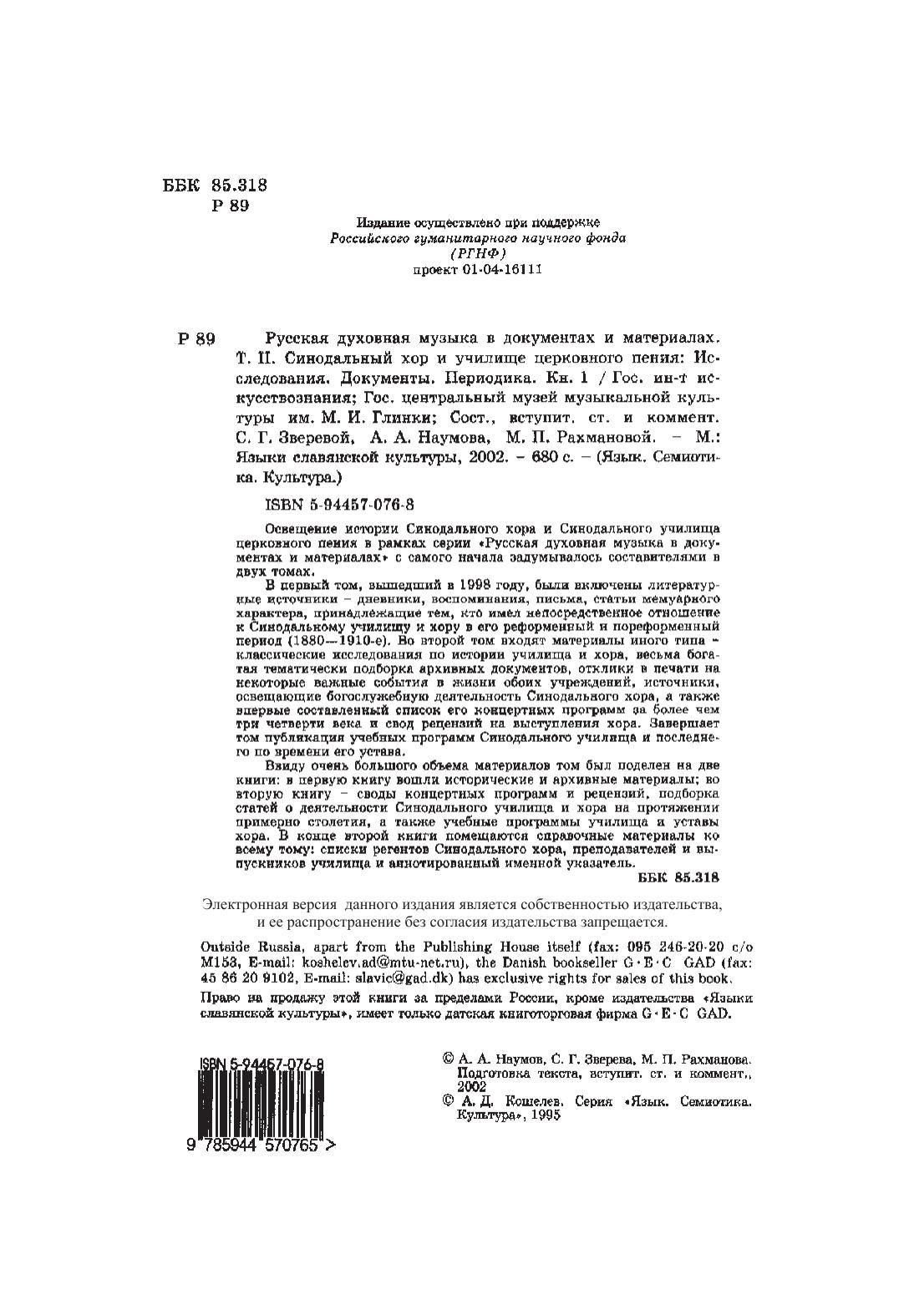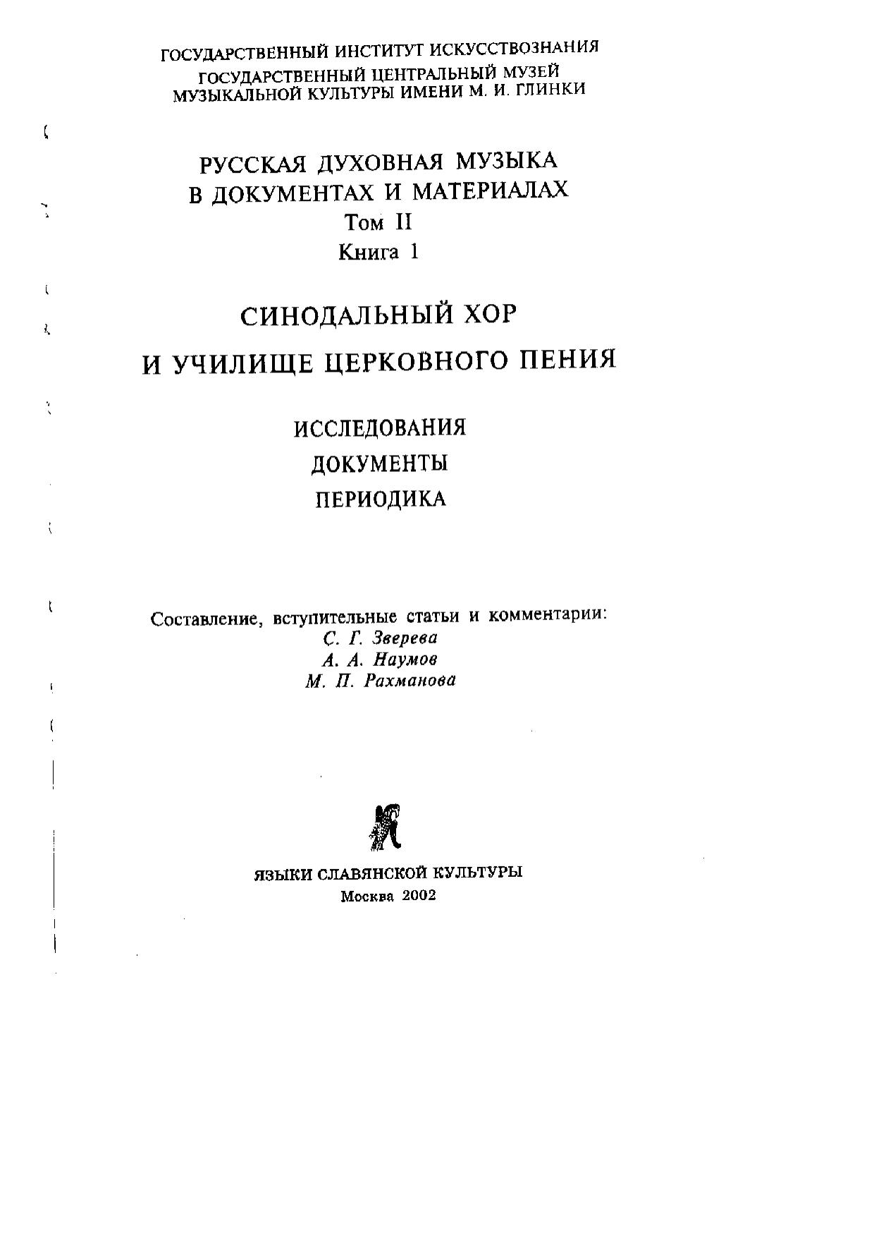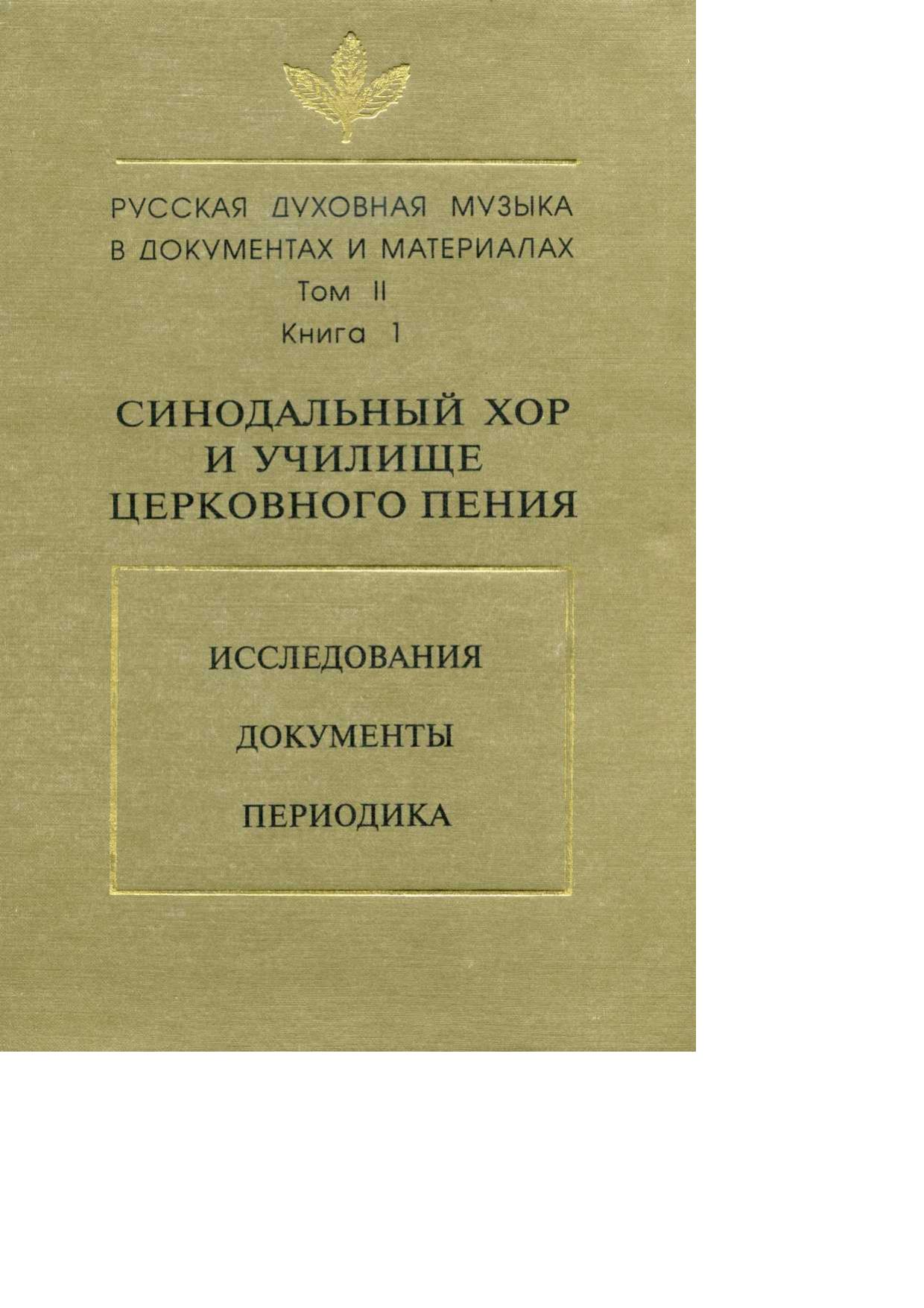 Русская духовная музыка в документах и материалах. Т. II. Кн. 1. Синодальный хор и училище церковного пения. Исследования. Документы. Периодика