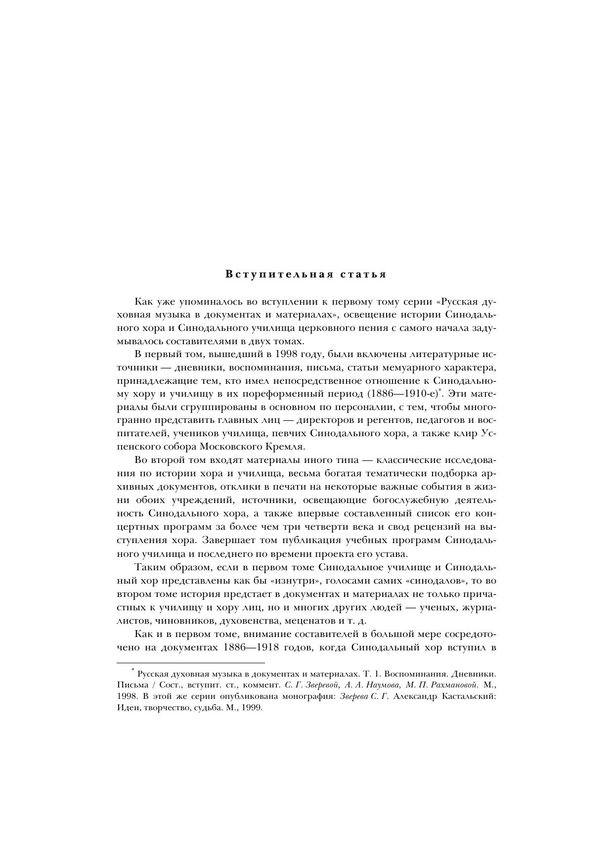 Освещение истории Синодального хора и Синодального училища церковного пения в рамках серии «Русская духовная музыка в документах и материалах» с самого начала задумывалось составителями в двух томах. В первый том были включены литературные источники – дневники, воспоминания, письма, статьи мемуарного характера, принадлежащие тем, кто имел непосредственное отношение к Синодальному училищу и хору в его реформенный и пореформенный период (1880-1910-е). Во второй том входят материалы иного типа – классические исследования по истории училища и хора, весьма богатая тематически подборка архивных документов, отклики в печати на некоторые важные события в жизни обоих учреждений, источники, освещающие богослужебную деятельность Синодального хора, а также впервые составленный список его концертных программ за более чем три четверти века и свод рецензий на выступления хора. Завершает том публикация учебных программ Синодального училища и последнего по времени его устава. Ввиду очень большого объема материалов том был поделен на две книги: в первую книгу вошли исторические и архивные материалы, во вторую книгу – своды концертных программ и рецензий, подборка статей о деятельности Синодального училища и хора на протяжении примерно столетия, а также учебные программы училища и уставы хора. В конце второй книги помещаются справочные материалы ко всему тому: списки регентов Синодального хора, преподавателей и выпускников училища и аннотированный именной указатель.