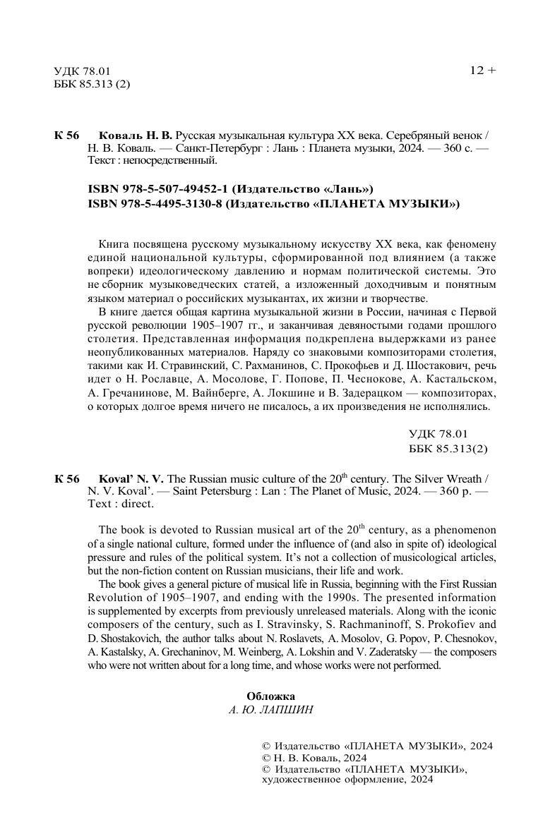 Книга посвящена русскому музыкальному искусству ХХ века, как феномену единой национальной культуры, сформированной под влиянием (а также вопреки) идеологическому давлению и нормам политической системы. Это не сборник музыковедческих статей, а изложенный доходчивым и понятным языком материал о российских музыкантах, их жизни и творчестве. В книге дается общая картина музыкальной жизни в России, начиная с Первой русской революции 1905–1907 гг., и заканчивая девяностыми годами прошлого столетия. Представленная информация подкреплена выдержками из неопубликованных ранее материалов. Наряду со знаковыми композиторами столетия, таких как И. Стравинский, С. Рахманинов, С. Прокофьев и Д. Шостакович, речь идет о Н. Рославце, А. Мосолове, Г. Попове, П. Чеснокове, А. Кастальском, А. Гречанинове, М. Вайнберге, А. Локшине и В. Задерацком – композиторах, о которых долгое время ничего не писалось, а их произведения не исполнялись. The book is devoted to Russian musical art of the 20th century, as a phenomenon of a single national culture, formed under the influence of (and also in spite of) ideological pressure and rules of the political system. It’s not a collection of musicological articles, but the non-fiction content on Russian musicians, their life and work. The book gives a general picture of musical life in Russia, beginning with the First Russian Revolution of 1905–1907, and ending with the 1990s. The presented information is supplemented by excerpts from previously unreleased materials. Along with the iconic composers of the century, such as I. Stravinsky, S. Rachmaninoff, S. Prokofiev and D. Shostakovich, the author talks about N. Roslavets, A. Mosolov, G. Popov, P. Chesnokov, A. Kastalsky, A. Grechaninov, M. Weinberg, A. Lokshin and V. Zaderatsky — the composers who were not written about for a long time, and whose works were not performed.