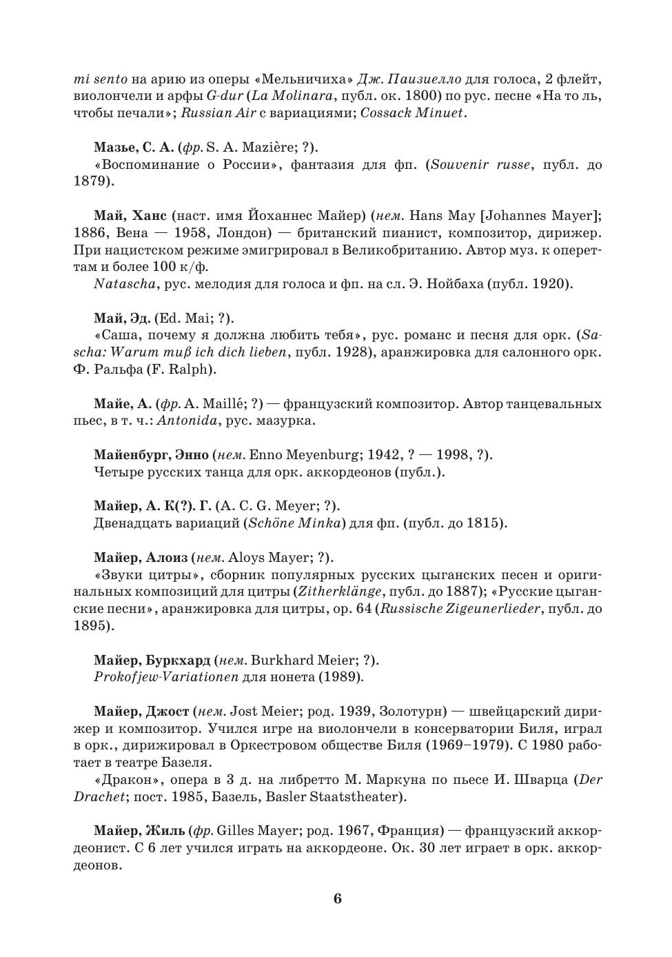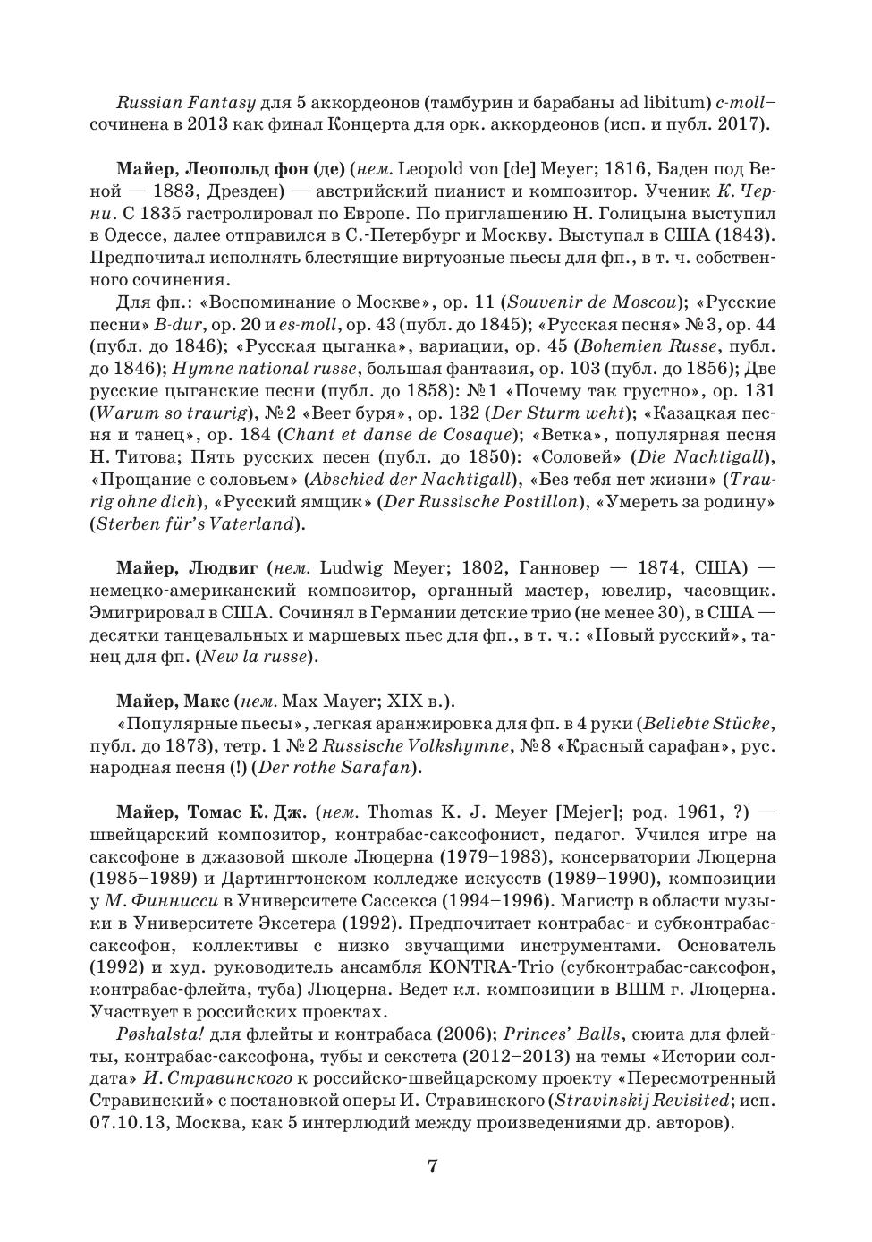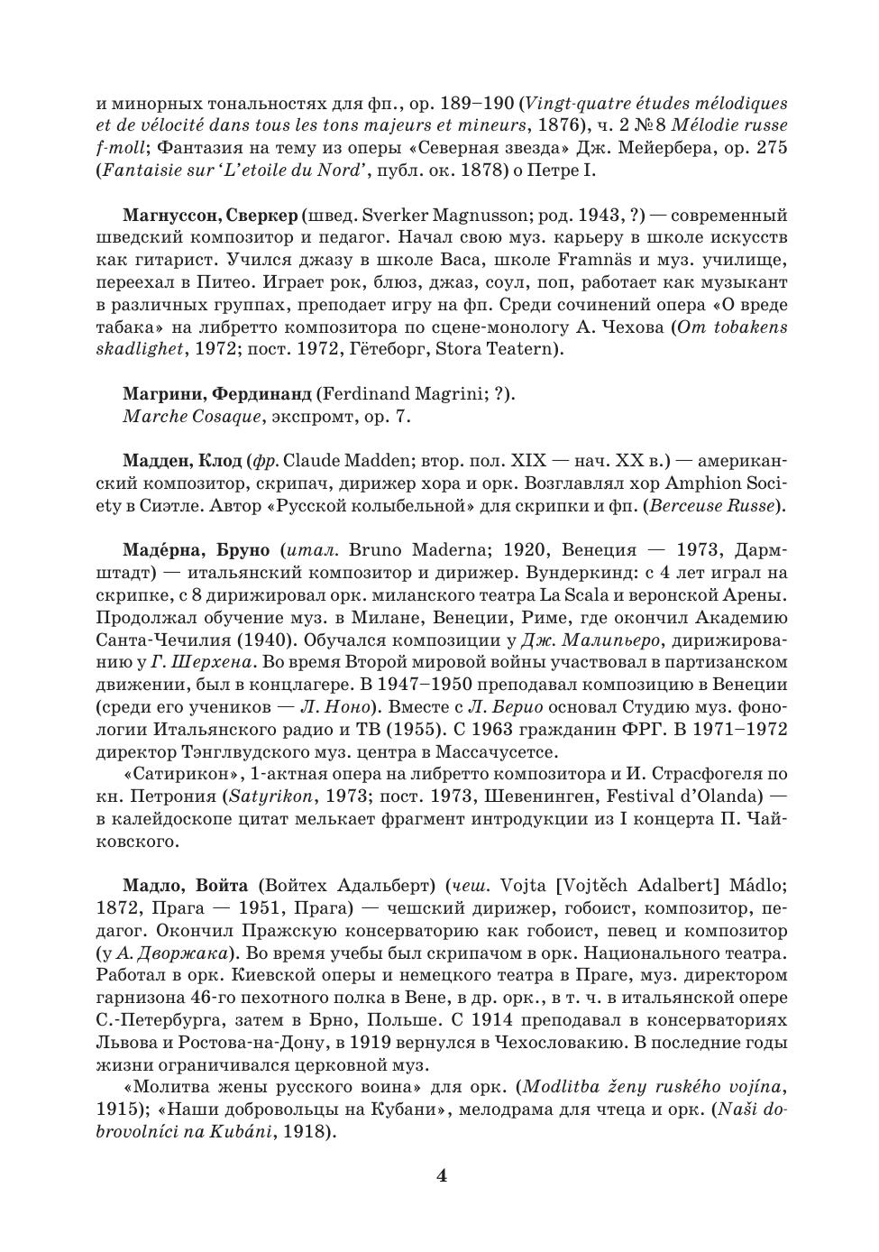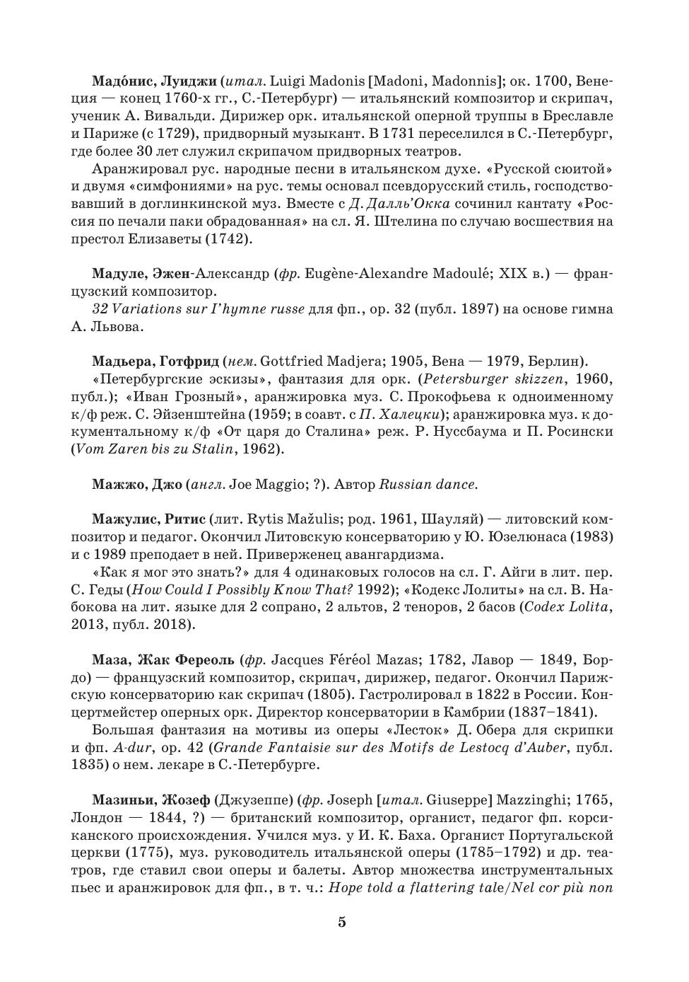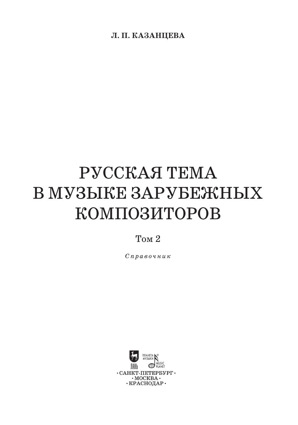 Научное справочное издание представляет собою первый опыт обобщения информации о зарубежной («нероссийской») музыке, посвященной России. Книга содержит словарные статьи о более чем 4 600 композиторов и их «русских» опусах. «Русская тема» как отображение русского начала в художественном произведении проявляет себя и в сугубо музыкальной специфике в виде цитирования, аранжировки и стилизации русского фольклора или произведений русских композиторов, использования русских народных инструментов. Она ставится и шире – как манифестация наиболее общих, коренных глубинных аспектов национальной идентичности, таких как культура (язык, литература и искусство, бытовые традиции), история (события и вехи становления Российского государства, крупные исторические персоналии), территориальное расположение и природная среда обитания, религиозные верования, особенности общественного бытия и психологии россиянина, складывающаяся в его сознании картина мира.