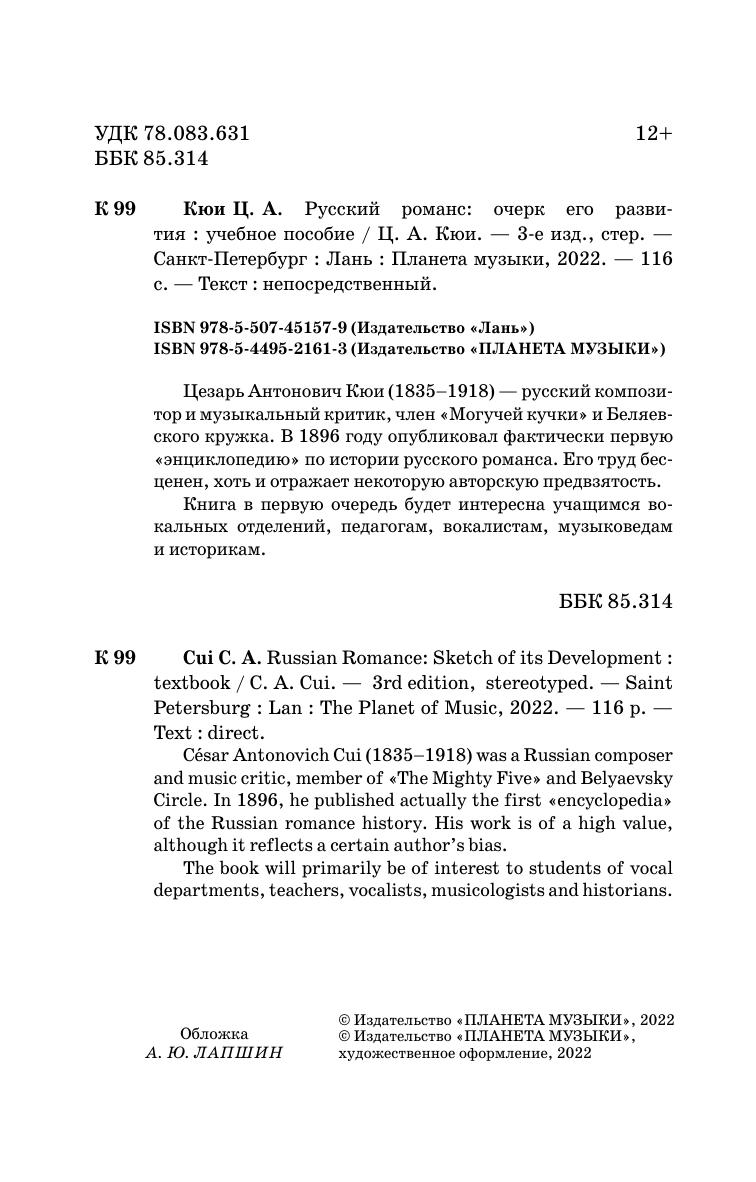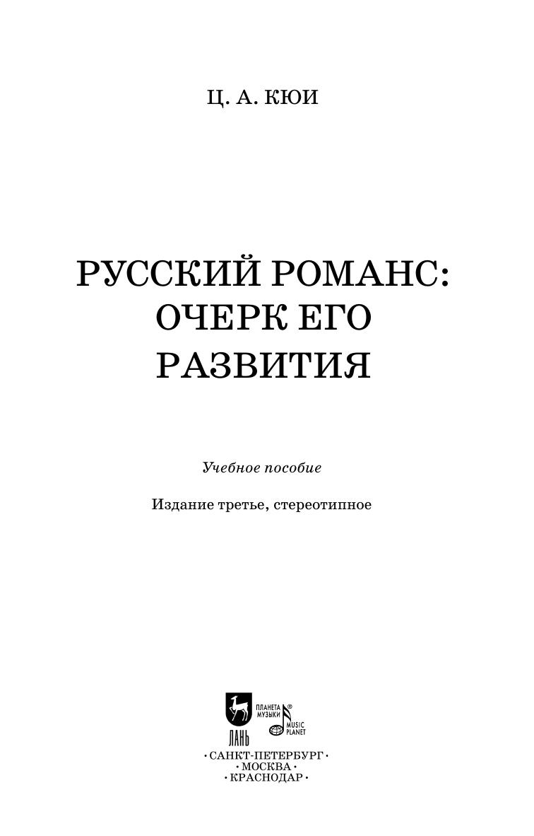 Цезарь Антонович Кюи (1835 - 1918) - русский композитор и музыкальный критик, член «Могучей кучки» и Беляевского кружка. В 1896 году опубликовал фактически первую "энциклопедию" по истории русского романса. Его труд бесценен, хоть и отражает некоторую авторскую предвзятость. Книга в первую очередь будет интересна учащимся вокальных отделений, педагогам, вокалистам, музыковедам и историкам.