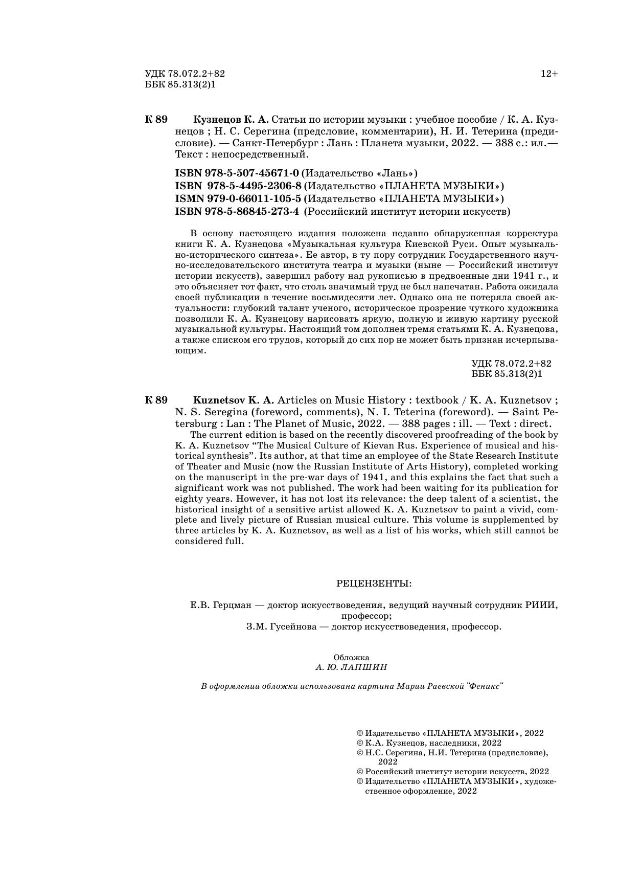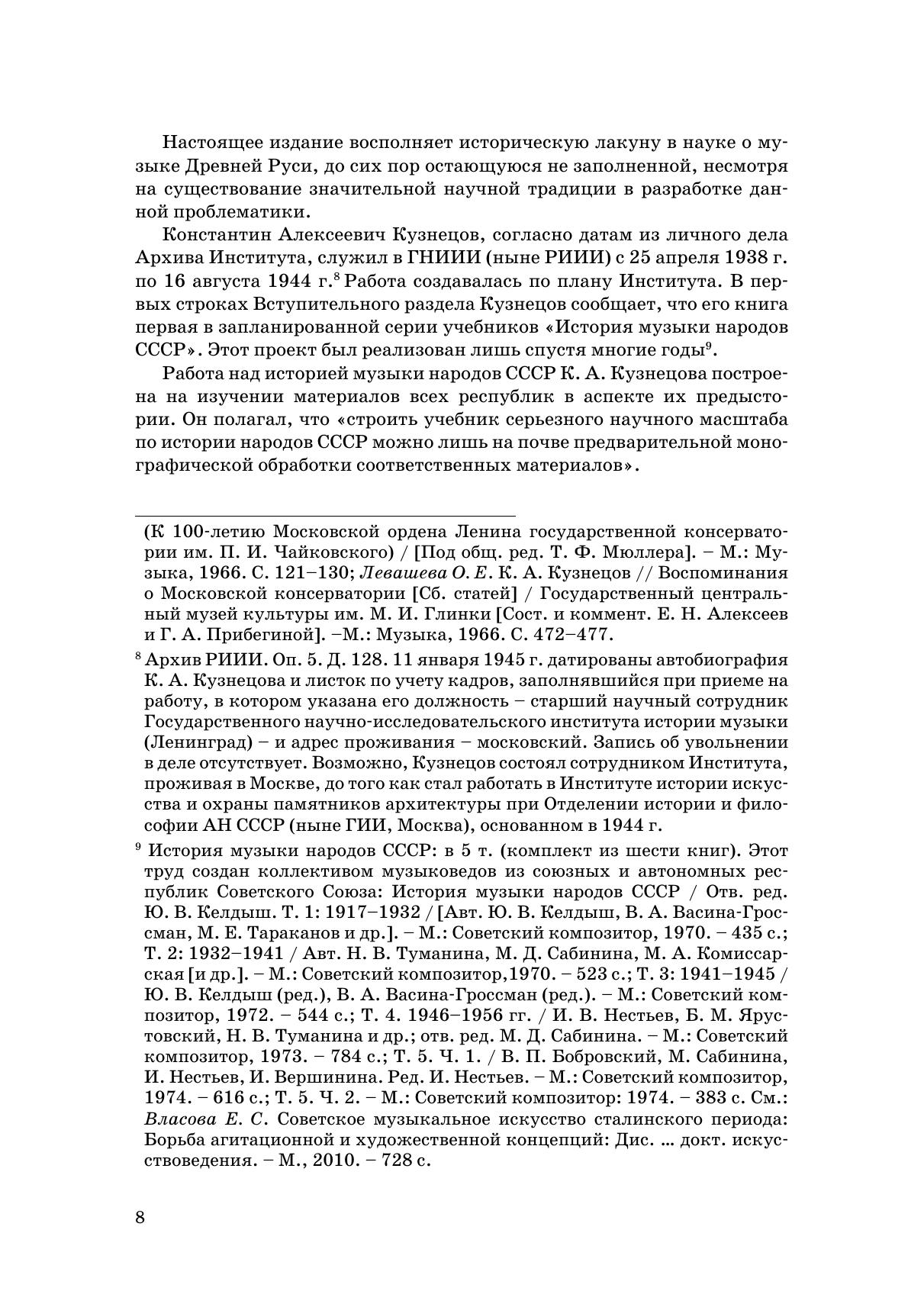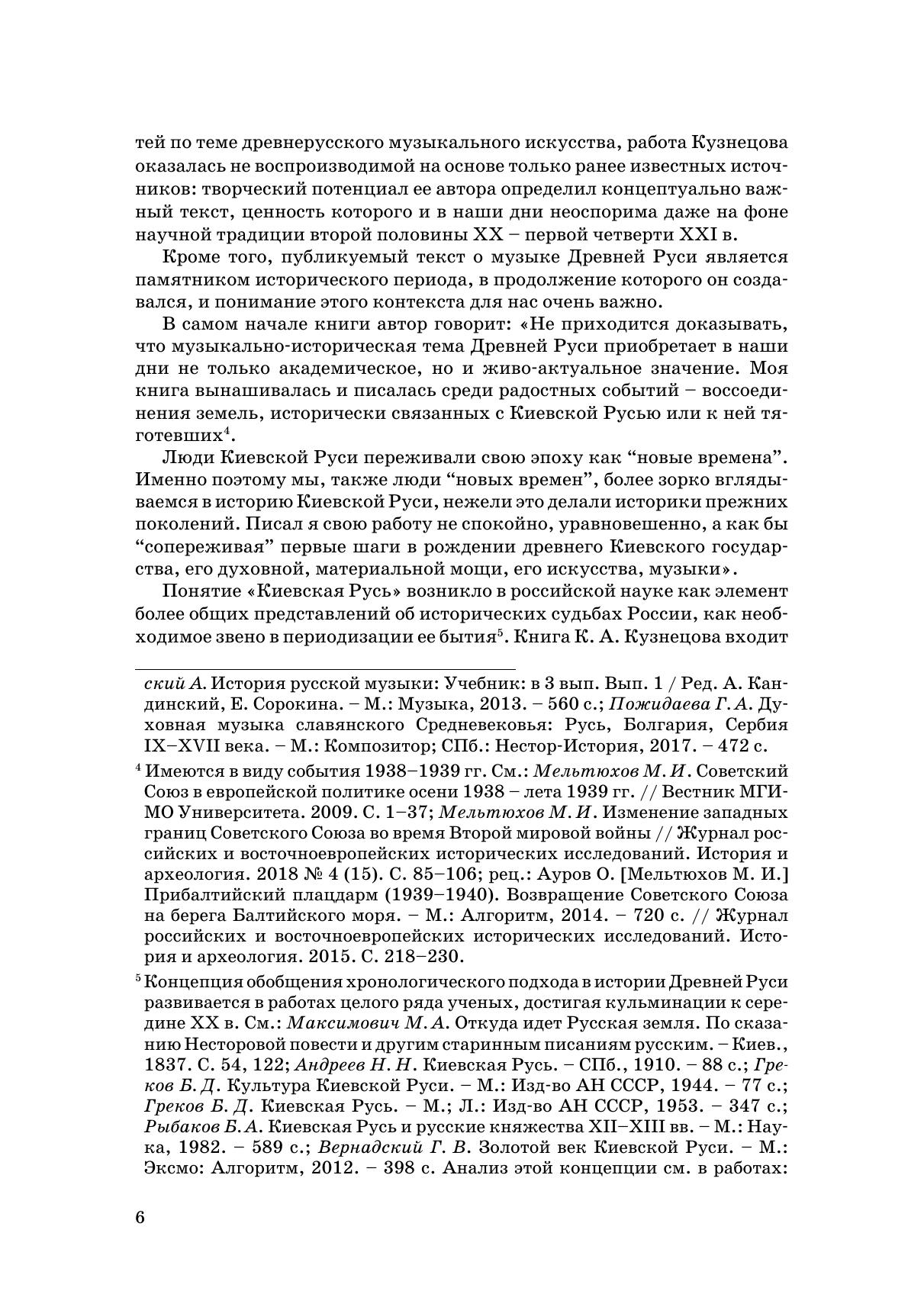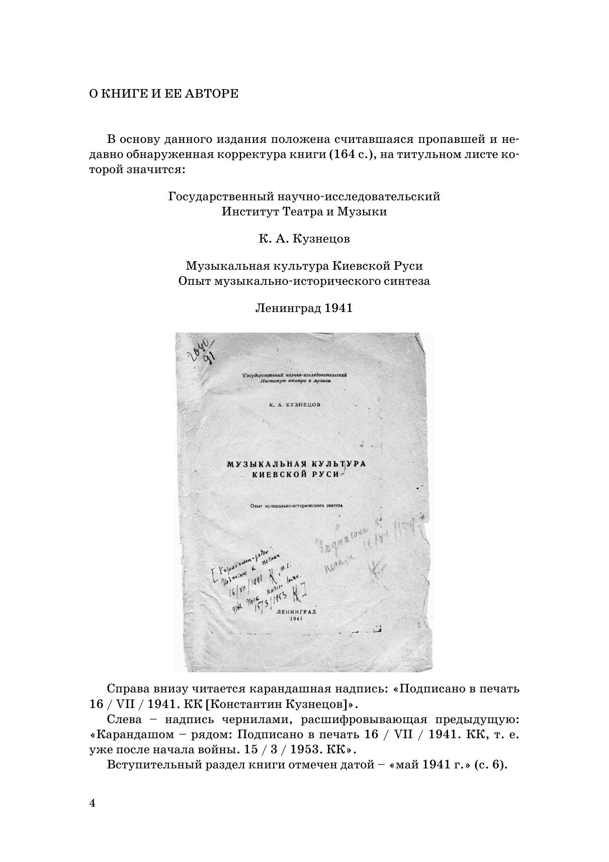 В основу настоящего издания положена недавно обнаруженная корректура книги К. А. Кузнецова «Музыкальная культура Киевской Руси. Опыт музыкально-исторического синтеза». Ее автор, в ту пору сотрудник Государственного научно-исследовательского института театра и музыки (ныне – Российский институт истории искусств), завершил работу над рукописью в предвоенные дни 1941 г., и это объясняет тот факт, что столь значимый труд не был напечатан. Работа ожидала своей публикации в течение восьмидесяти лет. Однако она не потеряла своей актуальности: глубокий талант ученого, историческое прозрение чуткого художника позволили К. А. Кузнецову нарисовать яркую, полную и живую картину русской музыкальной культуры. Настоящий том дополнен тремя статьями К. А. Кузнецова, а также списком его трудов, который до сих пор не может быть признан исчерпывающим.