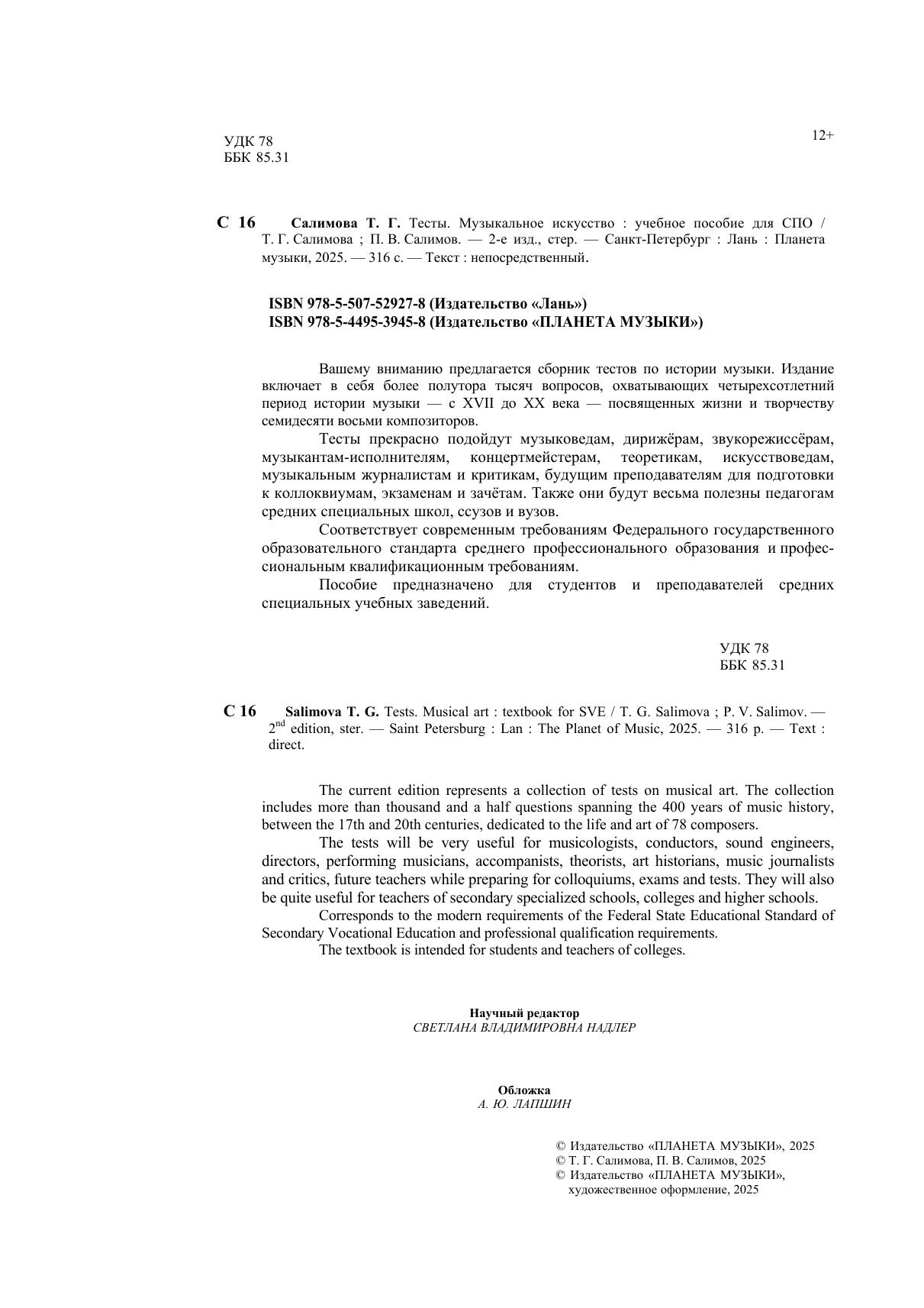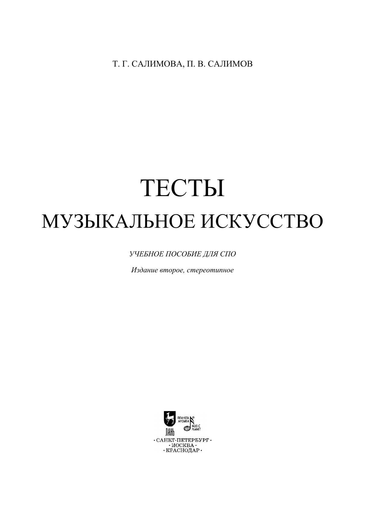 Вашему вниманию предлагается сборник тестов по истории музыки. Издание включает в себя более полутора тысяч вопросов, охватывающих четырехсотлетний период истории музыки — с XVII до XX века — посвященных жизни и творчеству семидесяти восьми композиторов. Тесты прекрасно подойдут музыковедам, дирижёрам, звукорежиссёрам, музыкантам-исполнителям, концертмейстерам, теоретикам, искусствоведам, музыкальным журналистам и критикам, будущим преподавателям для подготовки к коллоквиумам, экзаменам и зачётам. Соответствует современным требованиям Федерального государственного образовательного стандарта среднего профессионального образования и профессиональным квалификационным требованиям. Пособие предназначено для студентов и преподавателей средних специальных учебных заведений. The current edition represents a collection of tests on musical art. The collection includes more than thousand and a half questions spanning the 400 years of music history, between the 17th and 20th centuries, dedicated to the life and art of 78 composers. The tests will be very useful for musicologists, conductors, sound engineers, directors, performing musicians, accompanists, theorists, art historians, music journalists and critics, future teachers while preparing for colloquiums, exams and tests. Corresponds to the modern requirements of the Federal State Educational Standard of Secondary Vocational Education and professional qualification requirements. The textbook is intended for students and teachers of colleges.