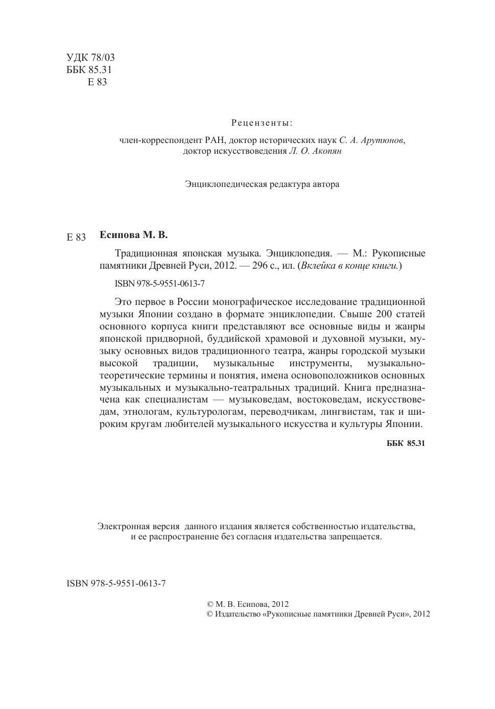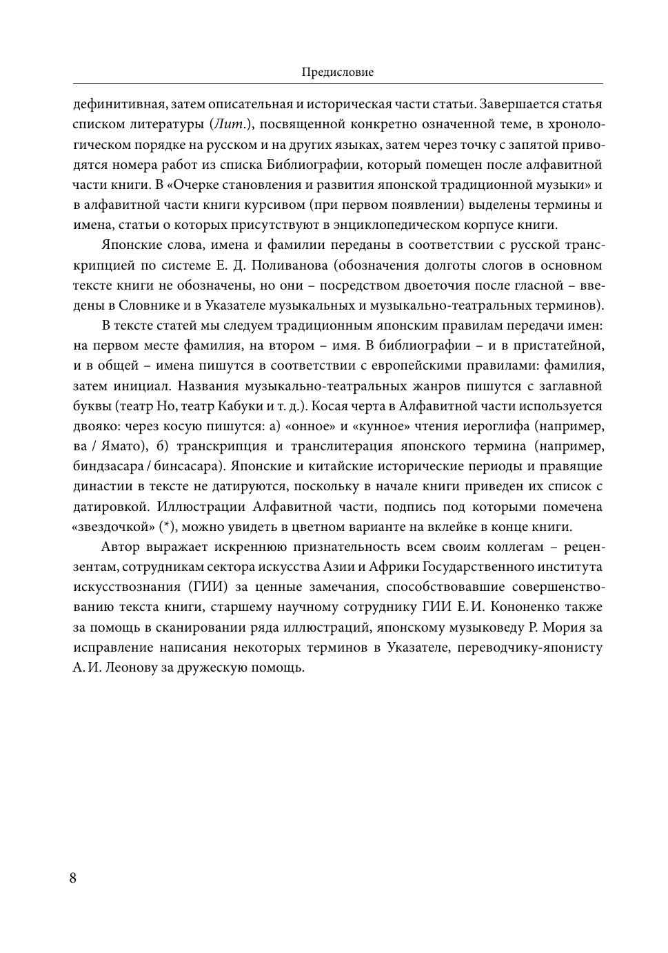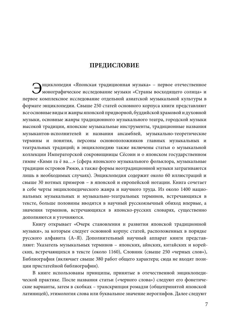 Это первое в России монографическое исследование традиционной музыки Японии создано в формате энциклопедии. Свыше 200 статей основного корпуса книги представляют все основные виды и жанры японской придворной, буддийской храмовой и духовной музыки, музыку основных видов традиционного театра, жанры городской музыки высокой традиции, музыкальные инструменты, музыкально-теоретические термины и понятия, имена основоположников основных музыкальных и музыкально-театральных традиций. Книга предназначена как специалистам - музыковедам, востоковедам, искусствоведам, этнологам, культурологам, переводчикам, лингвистам, так и широким кругам любителей музыкального искусства и культуры Японии.
