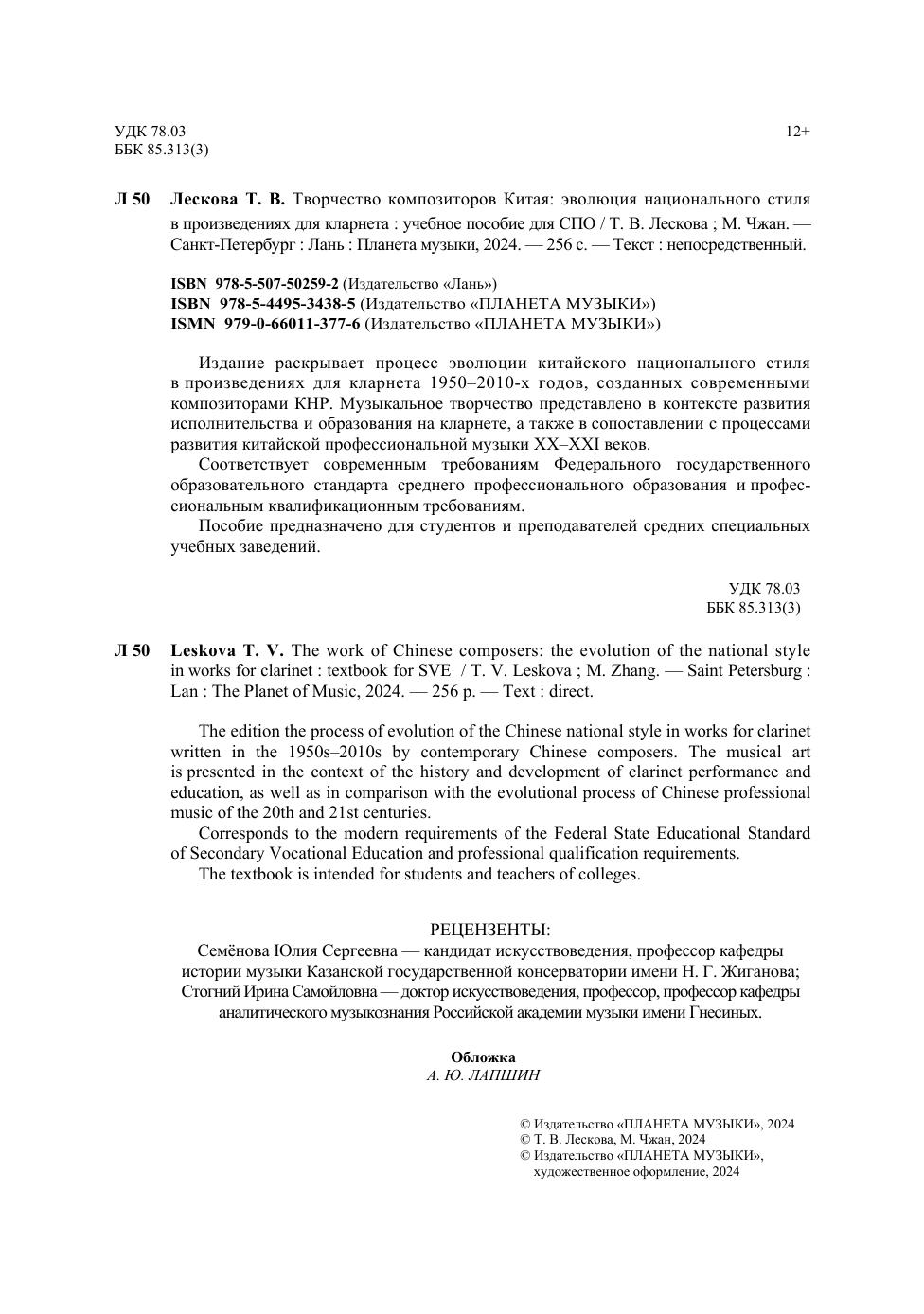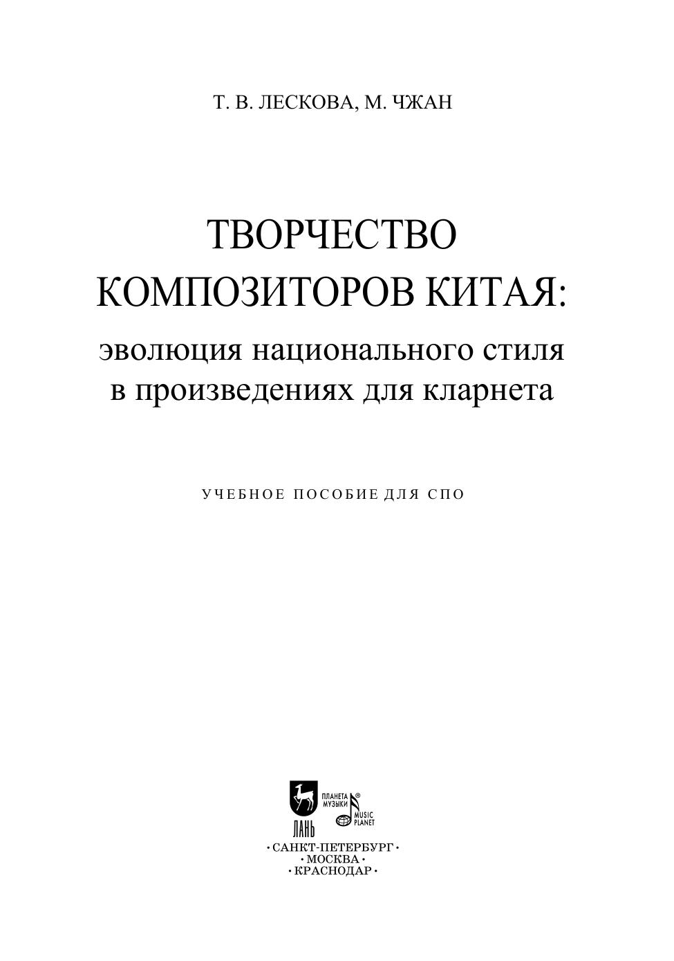 Издание раскрывает процесс эволюции китайского национального стиля в произведениях для кларнета 1950-2010-х годов, созданных современными композиторами КНР. Музыкальное творчество представлено в контексте развития исполнительства и образования на кларнете, а также в сопоставлении с процессами развития китайской профессиональной музыки XX-XXI веков. Соответствует современным требованиям Федерального государственного образовательного стандарта среднего профессионального образования и профессиональным квалификационным требованиям. Пособие предназначено для студентов и преподавателей средних специальных учебных заведений. The edition the process of evolution of the Chinese national style in works for clarinet written in the 1950s–2010s by contemporary Chinese composers. The musical art is presented in the context of the history and development of clarinet performance and education, as well as in comparison with the evolutional process of Chinese professional music of the 20th and 21st centuries. Corresponds to the modern requirements of the Federal State Educational Standard of Secondary Vocational Education and professional qualification requirements. The textbook is intended for students and teachers of colleges.