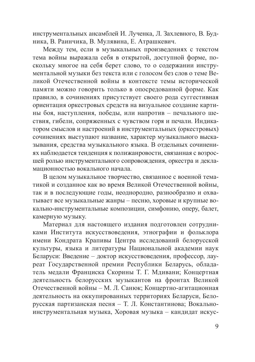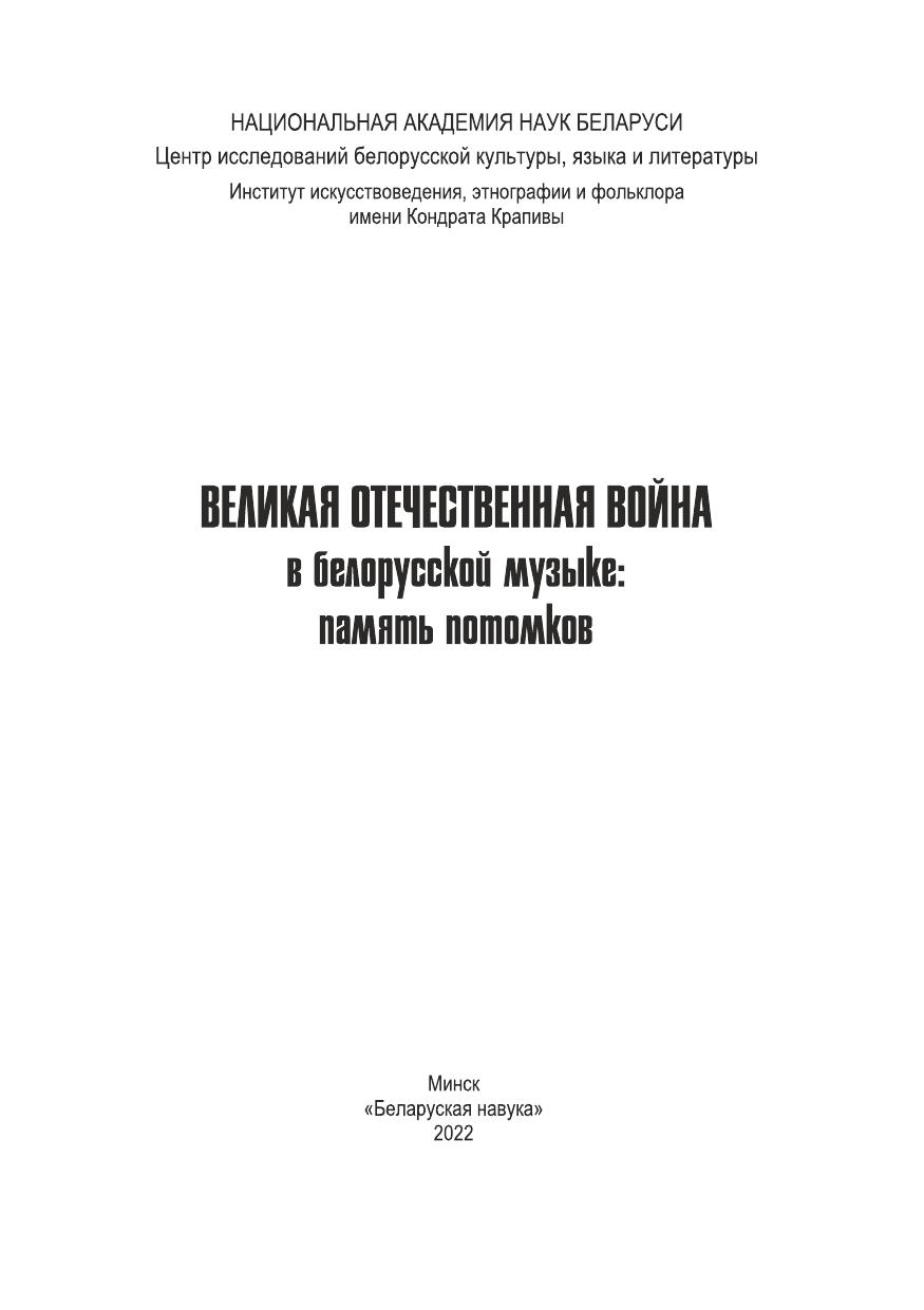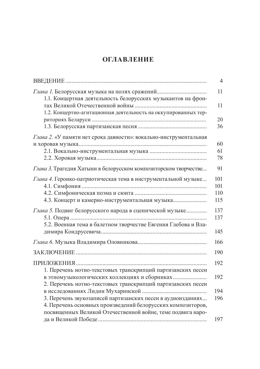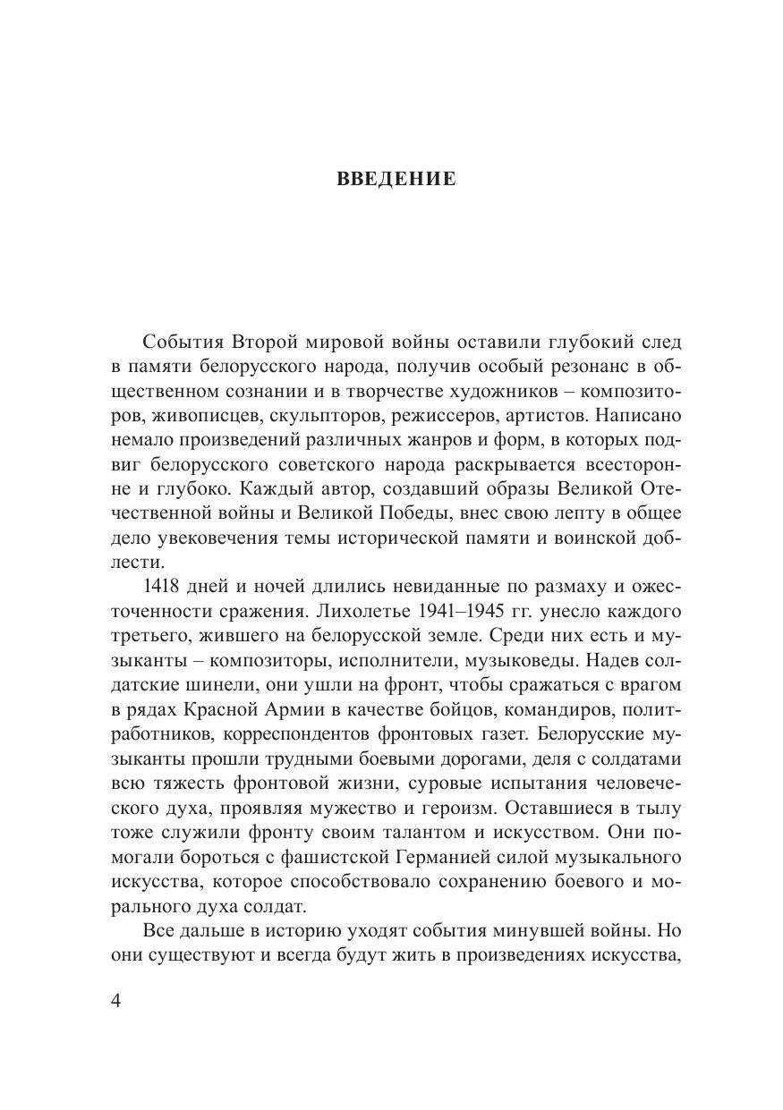 Книга посвящена претворению темы Великой Отечественной войны в белорусском композиторском творчестве и песенном фольклоре, подвигу белорусских артистов и партизан-музыкантов. В ней рассмотрен феномен партизанской песни и его роль в поддержке боевого духа защитников Отечества. Монография охватывает все жанры композиторского творчества – симфоническую, вокально-симфоническую и хоровую музыку, концерты и камерно-инструментальные произведения, песни, оперы и балеты, написанные как во время, так и после Великой Отечественной войны.