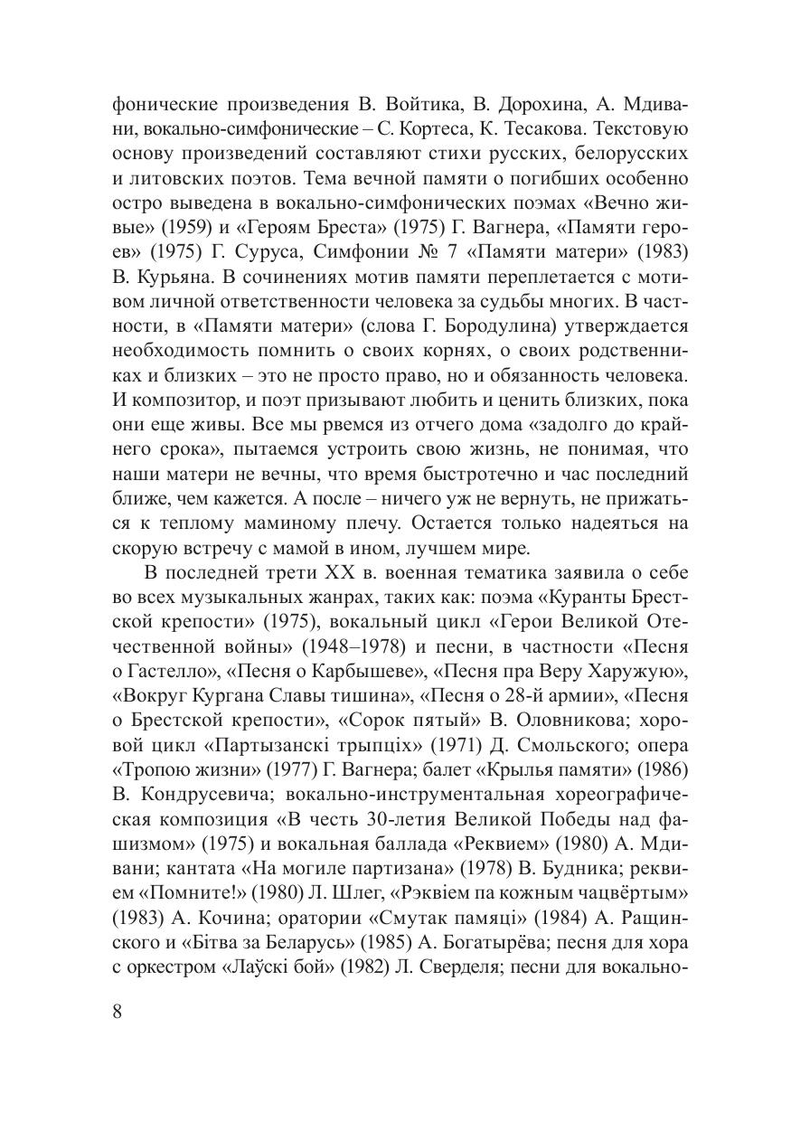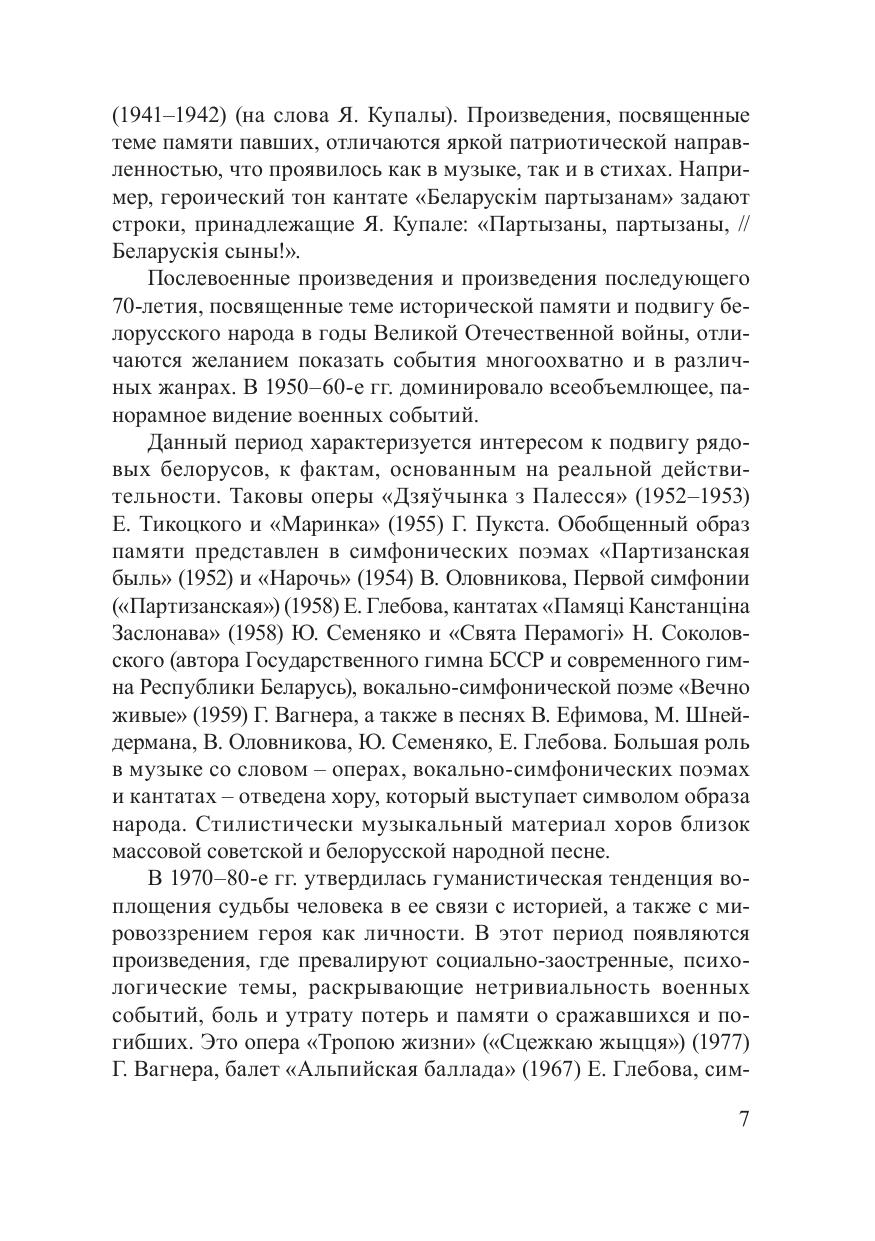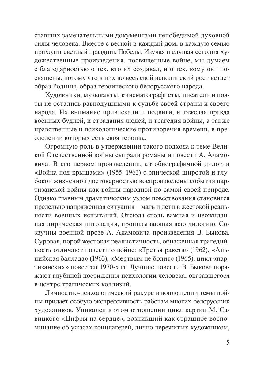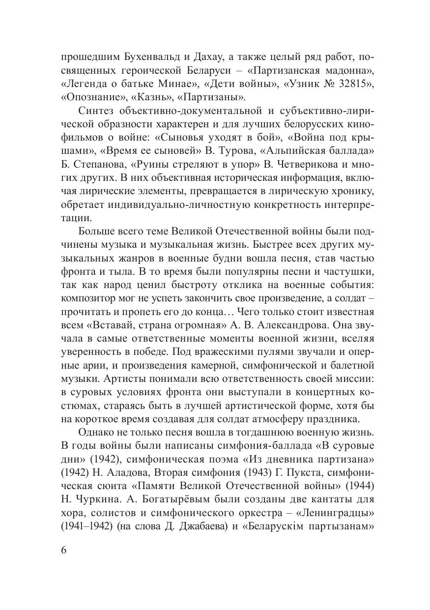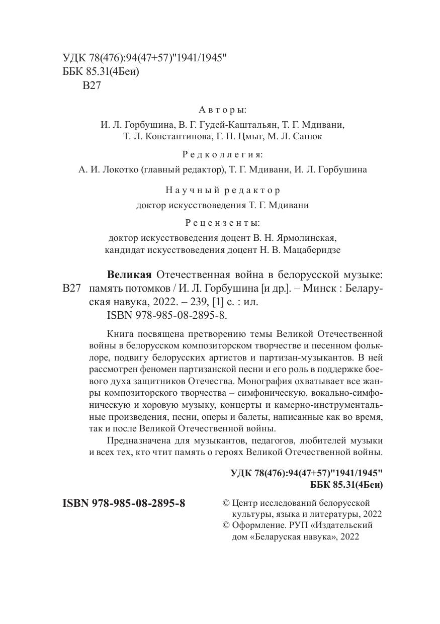 Книга посвящена претворению темы Великой Отечественной войны в белорусском композиторском творчестве и песенном фольклоре, подвигу белорусских артистов и партизан-музыкантов. В ней рассмотрен феномен партизанской песни и его роль в поддержке боевого духа защитников Отечества. Монография охватывает все жанры композиторского творчества – симфоническую, вокально-симфоническую и хоровую музыку, концерты и камерно-инструментальные произведения, песни, оперы и балеты, написанные как во время, так и после Великой Отечественной войны.