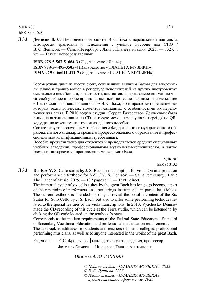 Бессмертный цикл из шести Сюит, сочинённый великим Бахом для виолончели, давно и прочно вошёл в репертуар исполнителей на других инструментах смычкового семейства и, в частности, альтистов. Предлагаемое вниманию читателей учебное пособие призвано раскрыть не только возможное содержание «Шести сюит для виолончели соло» И. С. Баха, но и предложить решение некоторых технологических моментов, связанных с особенностями их переложения для альта. В 2010 году в студии «Терра» Вячеславом Денисовым была выполнена запись цикла на CD, которую можно прослушать, перейдя по QR-коду, расположенном на страницах данного пособия. Соответствует современным требованиям Федерального государственного образовательного стандарта среднего профессионального образования и профессиональным квалификационным требованиям. Пособие предназначено для студентов и преподавателей средних специальных учебных заведений, профессиональным музыкантам-исполнителям, а также всем, кто интересуется произведениями великого Баха. The immortal cycle of six cello suites by the great Bach has long ago become a part of the repertoire of performers on other strings instruments, in particular, violists. The current textbook is intended not only to reveal the possible content of the Six Suites for Solo Cello by J. S. Bach, but also to offer some performing techiques re-lated to the special features of the viola transcriptions. In 2010, Vyacheslav Denisov made the CD-recording of this cycle at the Terra studio, which can be listened to by clicking the QR code located on the textbook’s pages. Corresponds to the modern requirements of the Federal State Educational Standard of Secondary Vocational Education and professional qualification requirements. The textbook is addressed to students and teachers of music colleges, professional performing musicians, as well as to anyone interested in the works of the great Bach.