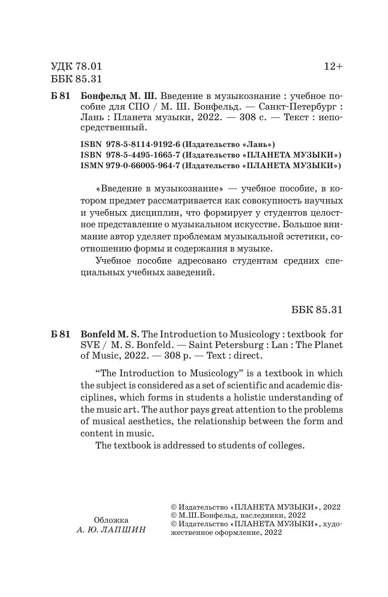 “The Introduction to Musicology” is a textbook in which the subject is considered as a set of scientific and academic disciplines, which forms in students a holistic understanding of the music art. The author pays great attention to the problems of musical aesthetics, the relationship between the form and content in music.