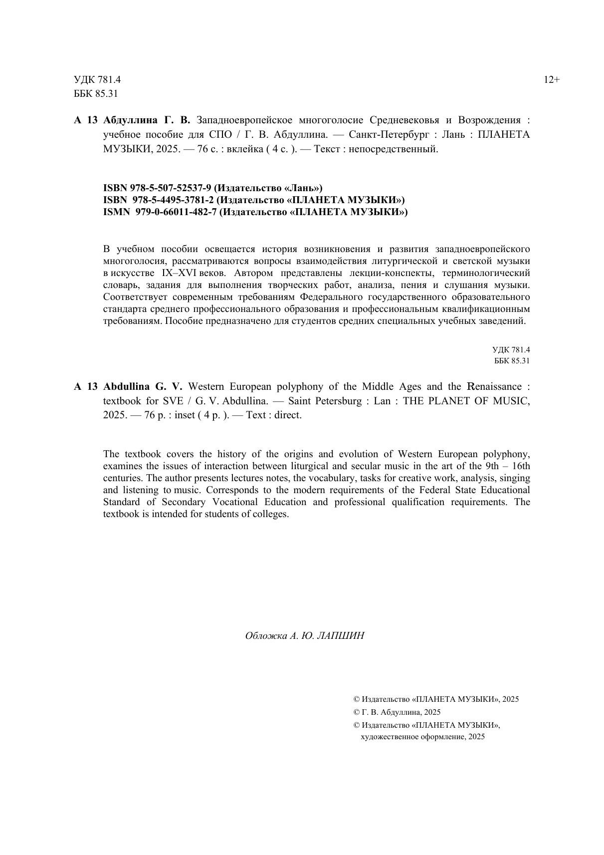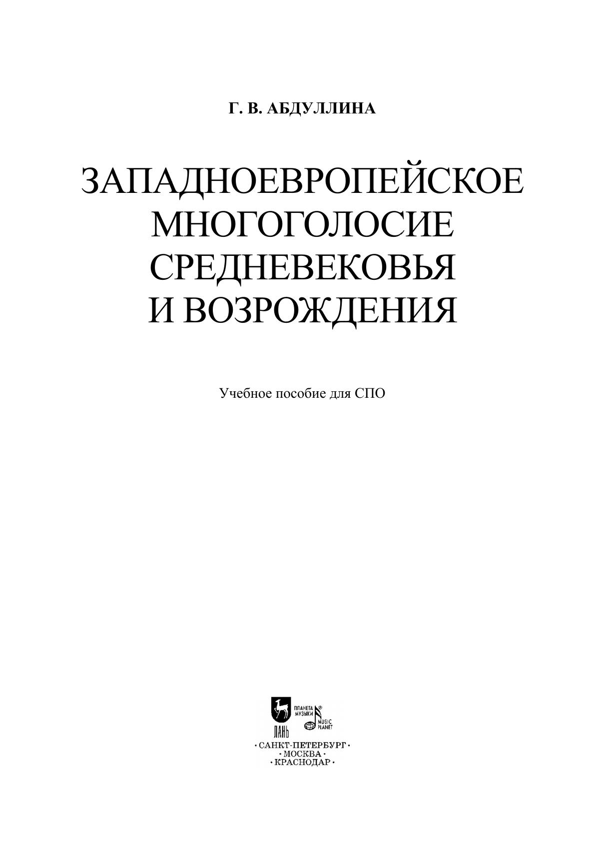 В учебном пособии освещается история возникновения и развития западноевропейского многоголосия, рассматриваются вопросы взаимодействия литургической и светской музыки в искусстве IX–XVI веков. Автором представлены лекции-конспекты, терминологический словарь, задания для выполнения творческих работ, анализа, пения и слушания музыки. Соответствует современным требованиям Федерального государственного образовательного стандарта среднего профессионального образования и профессиональным квалификационным требованиям. Пособие предназначено для студентов средних специальных учебных заведений. The textbook covers the history of the origins and evolution of Western European polyphony, examines the issues of interaction between liturgical and secular music in the art of the 9th – 16th centuries. The author presents lectures notes, the vocabulary, tasks for creative work, analysis, singing and listening to music. Corresponds to the modern requirements of the Federal State Educational Standard of Secondary Vocational Education and professional qualification requirements. The textbook is intended for students of colleges.