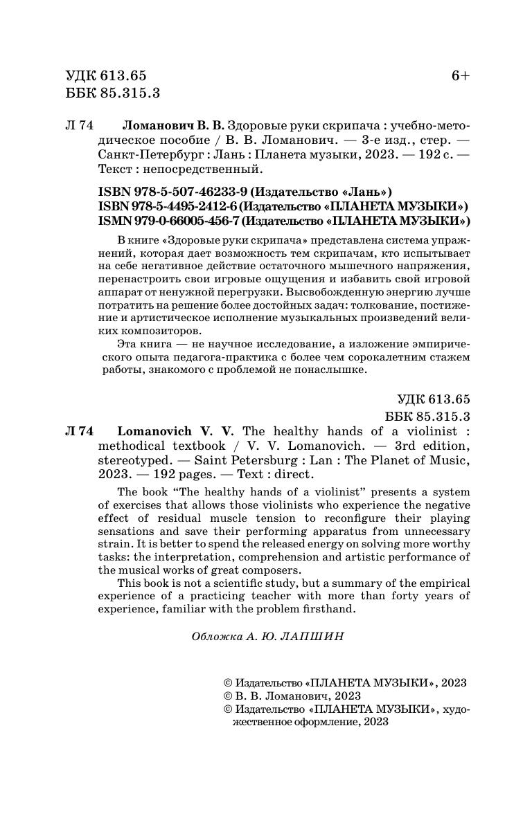 The book “The healthy hands of a violinist” presents a system of exercises that allows those violinists who experience the negative effect of residual muscle tension to reconfigure their playing sensations and save their performing apparatus from unnecessary strain. It is better to spend the released energy on solving more worthy tasks: the interpretation, comprehension and artistic performance of the musical works of great composers.