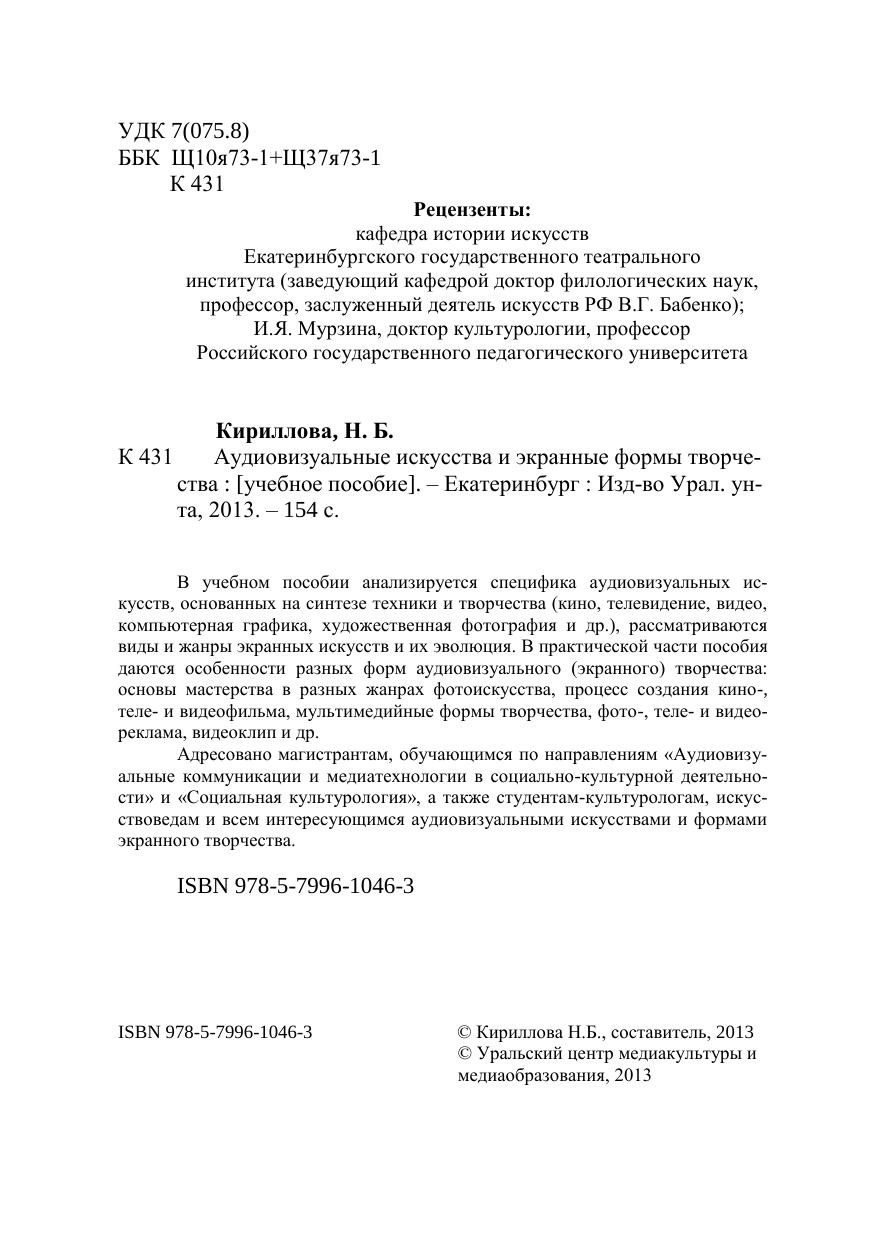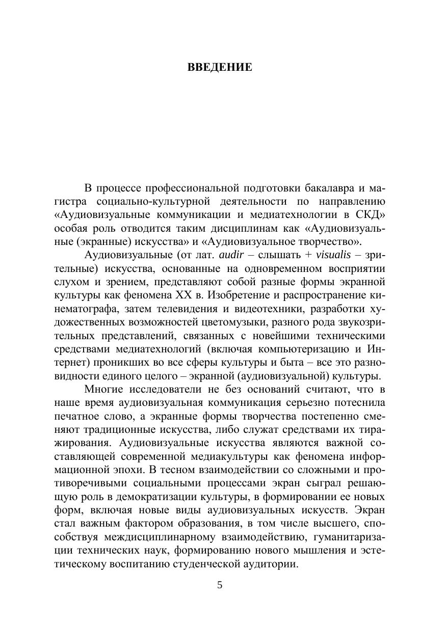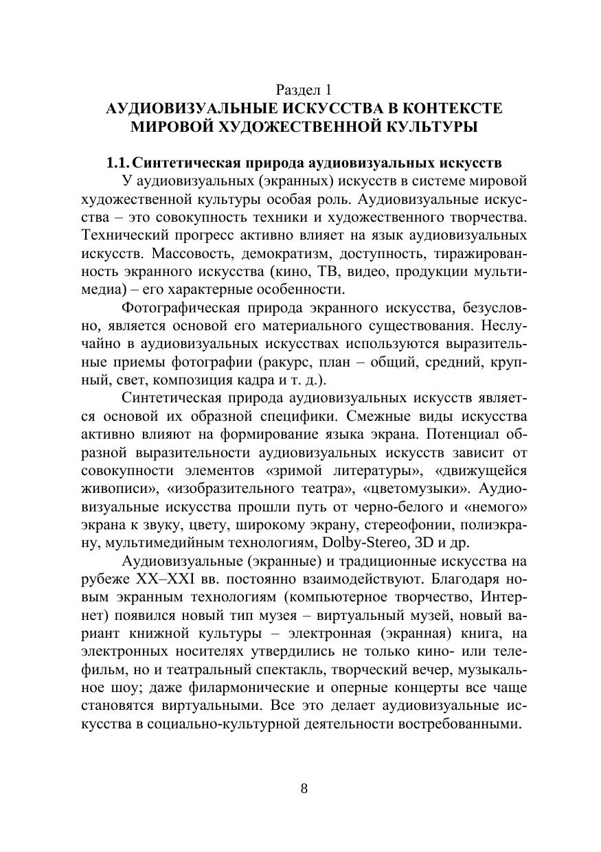 В учебном пособии анализируется специфика аудиовизуальных искусств, основанных на синтезе техники и творчества (кино, телевидение, видео, компьютерная графика, художественная фотография и др.), рассматриваются виды и жанры экранных искусств и их эволюция. В практической части пособия даются особенности разных форм аудиовизуального (экранного) творчества: основы мастерства в разных жанрах фотоискусства, процесс создания кино-, телеи видеофильма, мультимедийные формы творчества, фото-, телеи видеореклама, видеоклип и др. Адресовано магистрантам, обучающимся по направлениям «Аудиовизуальные коммуникации и медиатехнологии в социально-культурной деятельности» и «Социальная культурология», а также студентам-культурологам, искусствоведам и всем интересующимся аудиовизуальными искусствами и формами экранного творчества.