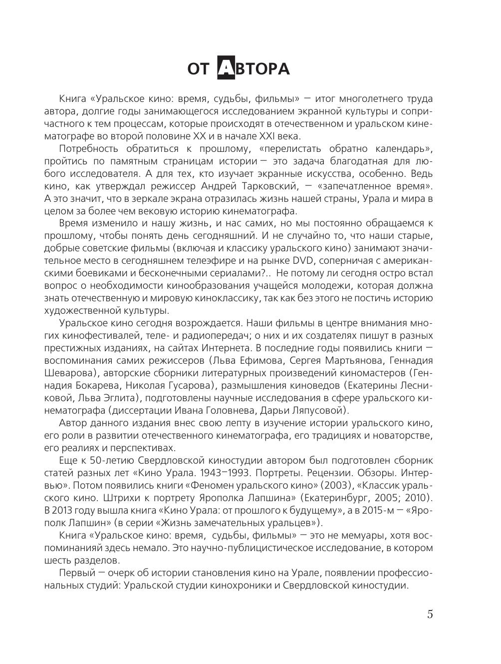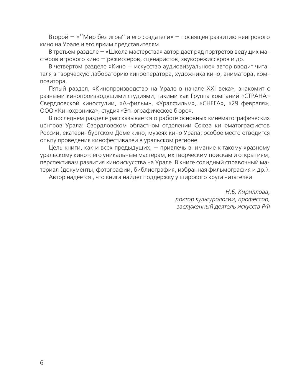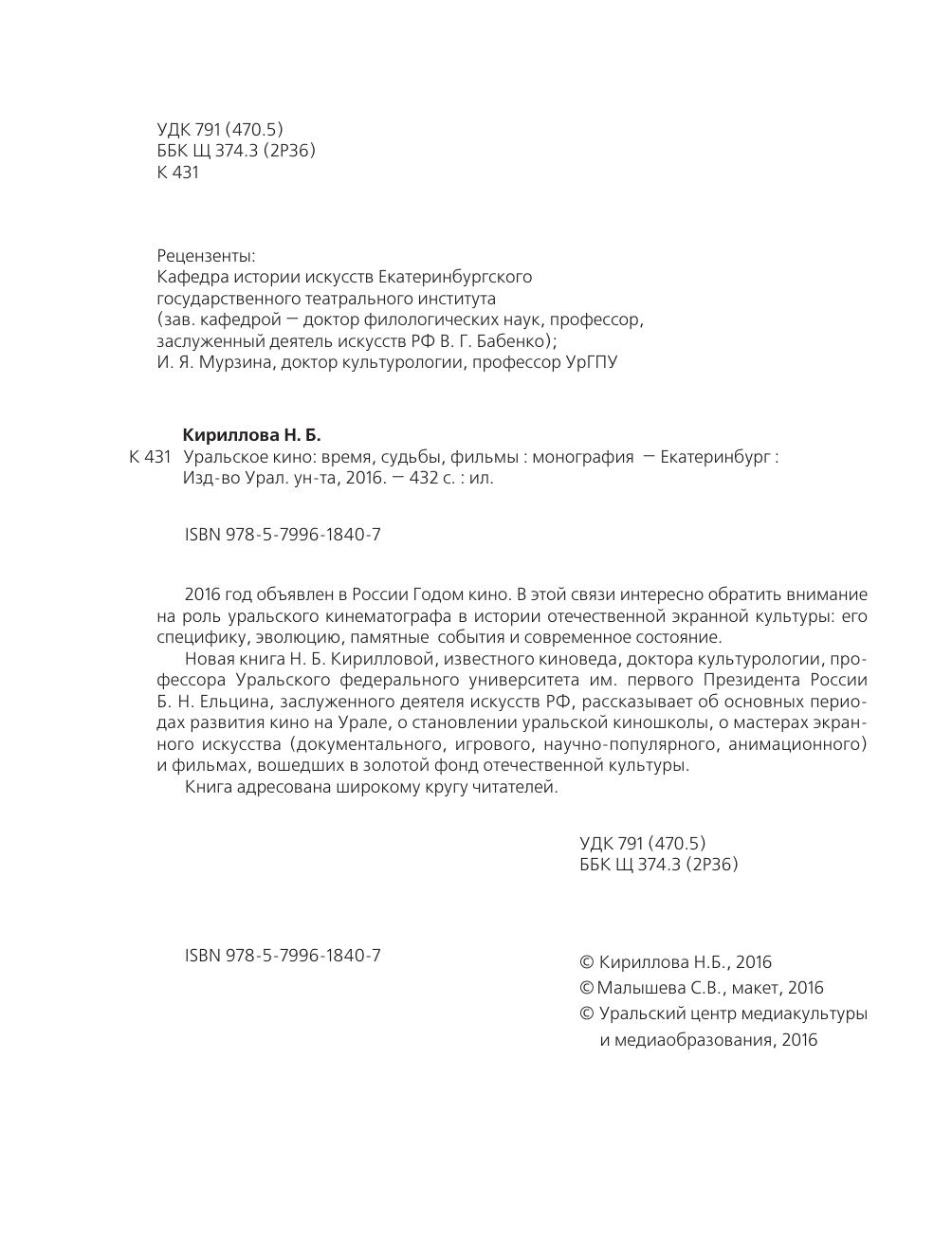 2016 год объявлен в России Годом кино. В этой связи интересно обратить внимание на роль уральского кинематографа в истории отечественной экранной культуры: его специфику, эволюцию, памятные события и современное состояние. Новая книга Н. Б. Кирилловой, известного киноведа, доктора культурологии, профессора Уральского федерального университета им. первого Президента России Б. Н. Ельцина, заслуженного деятеля искусств РФ, рассказывает об основных периодах развития кино на Урале, о становлении уральской киношколы, о мастерах экранного искусства (документального, игрового, научно-популярного, анимационного) и фильмах, вошедших в золотой фонд отечественной культуры. Книга адресована широкому кругу читателей.