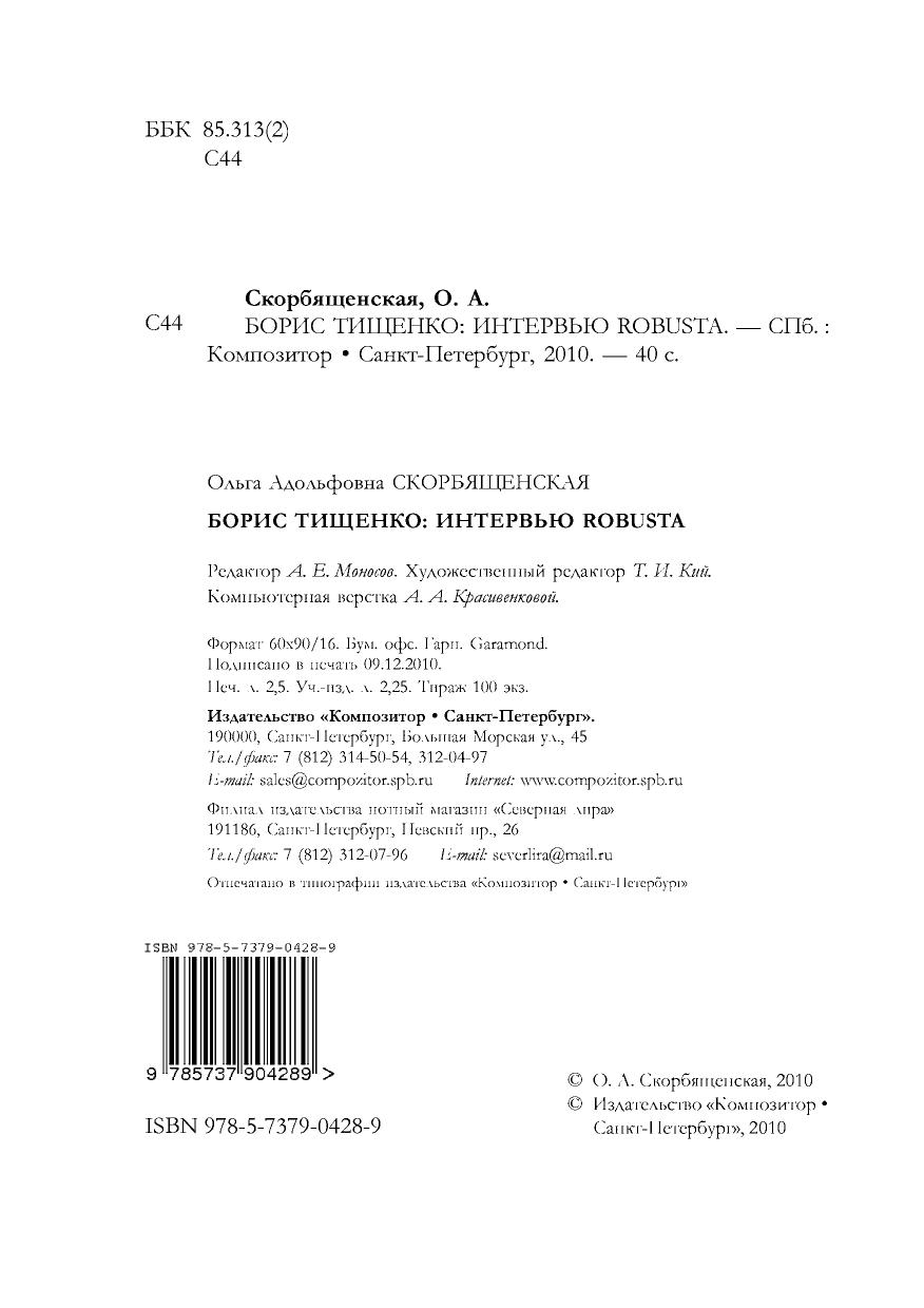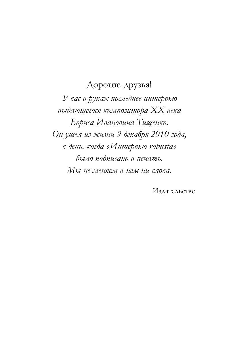 O Борисе Ивановиче Тищенко написано огромное количество статей, несколько книг, пишутся диссертации, посвященные его творчеству. Однако до сих пор не существует биографии этого выдающегося композитора — одного из самых значительных музыкантов нашего времени. То, что будет предложено читателям, — не объективная биография композитора (время для нее еще не пришло),а попытка создания его портрета через диалоги автора с Борисом Ивановичем, происходившие осенью 2009 года. Поскольку в этих беседах затрагиваются темы, важные и интересные для понимания современной культуры, диалоги дополнены своего рода комментариями, материал для которых взят из статей и книг о Борисе Тищенко и его собственных печатных работ.
