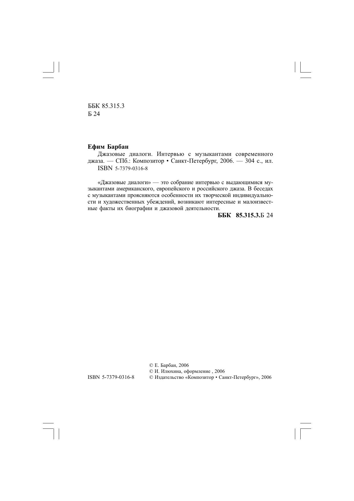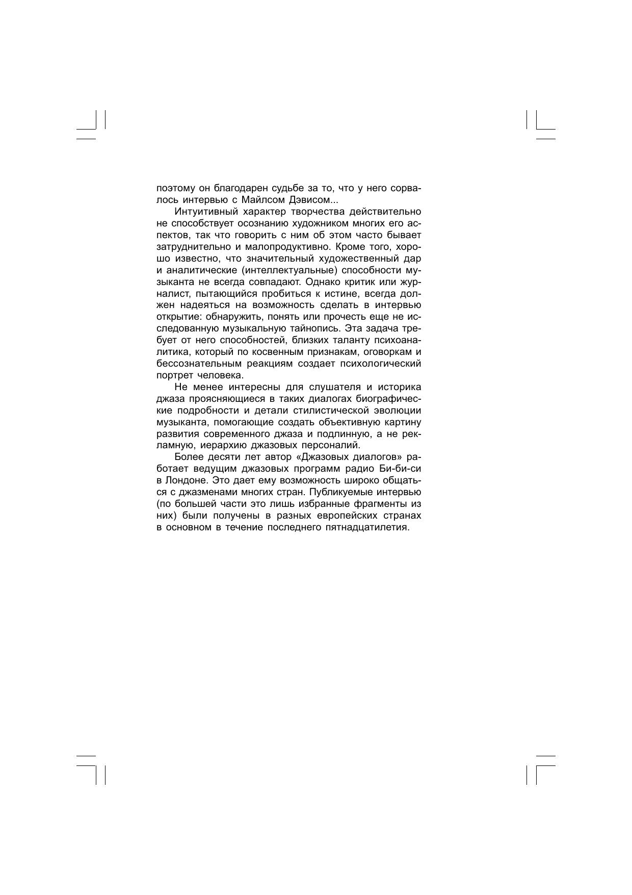 «Джазовые диалоги» — это собрание интервью с выдающимися музыкантами американского, европейского и российского джаза. В беседах с музыкантами проясняются особенности их творческой индивидуальности и художественных убеждений, возникают интересные и малоизвестные факты их биографии и джазовой деятельности.