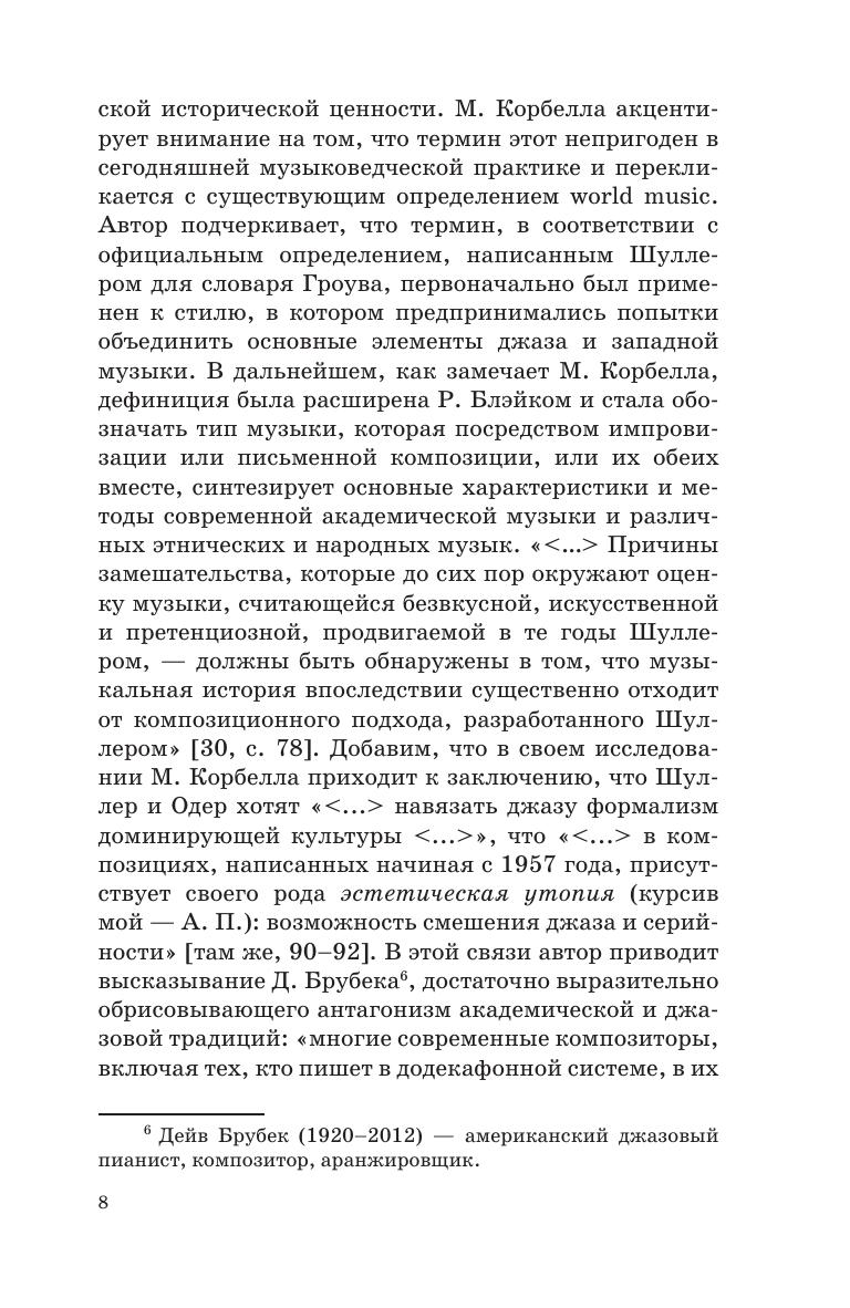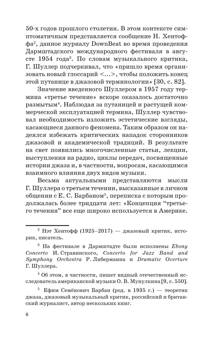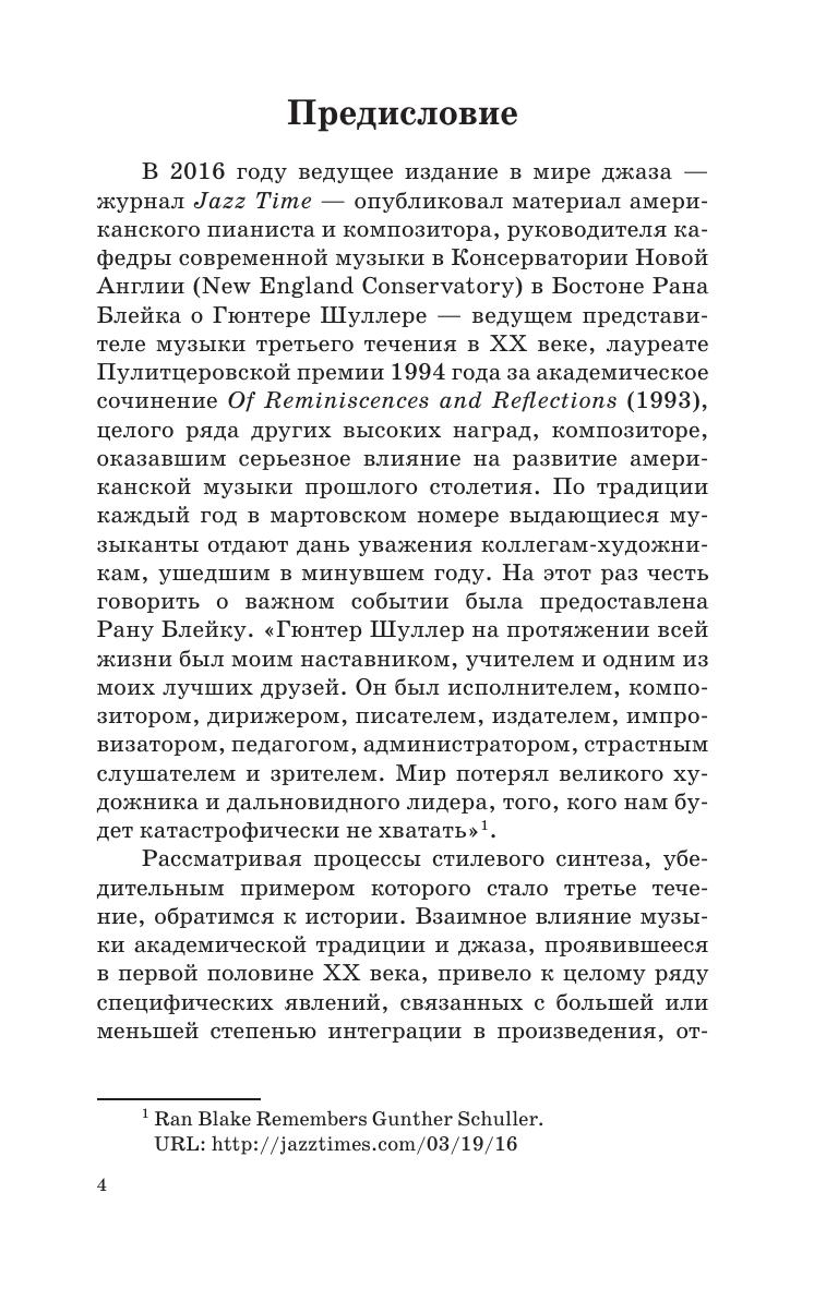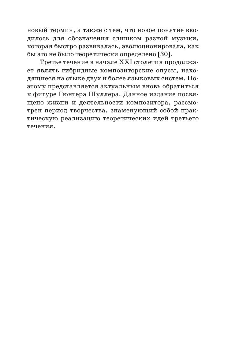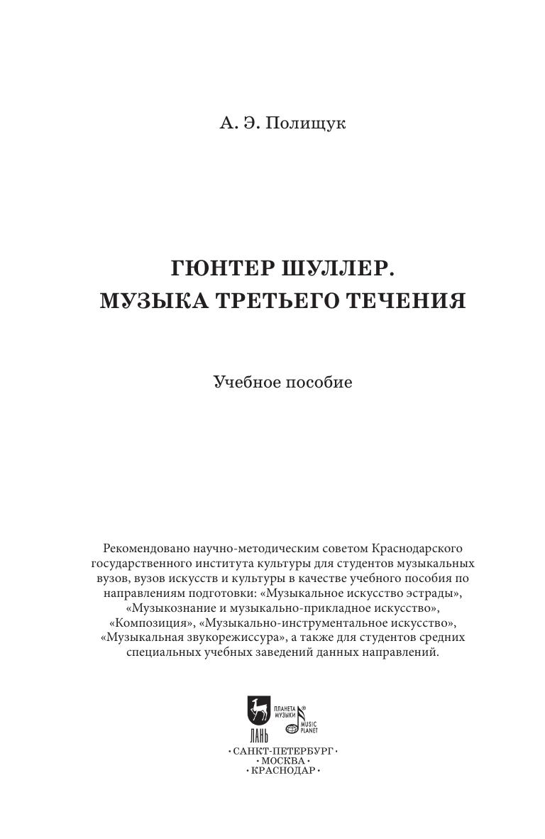 Учебное пособие посвящено Гюнтеру Шуллеру — американскому композитору, исполнителю, музыковеду, дирижеру, педагогу, автору термина «третье течение», относящегося к стилевому направлению, синтезирующему выразительные средства академической музыки и джазовой практики. В книге анализируются не исследованные ранее в отечественном музыкознании и базирующиеся на эстетических принципах третьего течения сочинения Г. Шуллера, созданные с 1957 по 1967 г. Издание рассчитано на музыковедов, композиторов, исполнителей, музыкальных педагогов. Материал может быть использован в учебных курсах «История зарубежной музыки XX–XXI вв.», «Массовая музыкальная культура», «История и теория джазовой музыки», «Композиция».