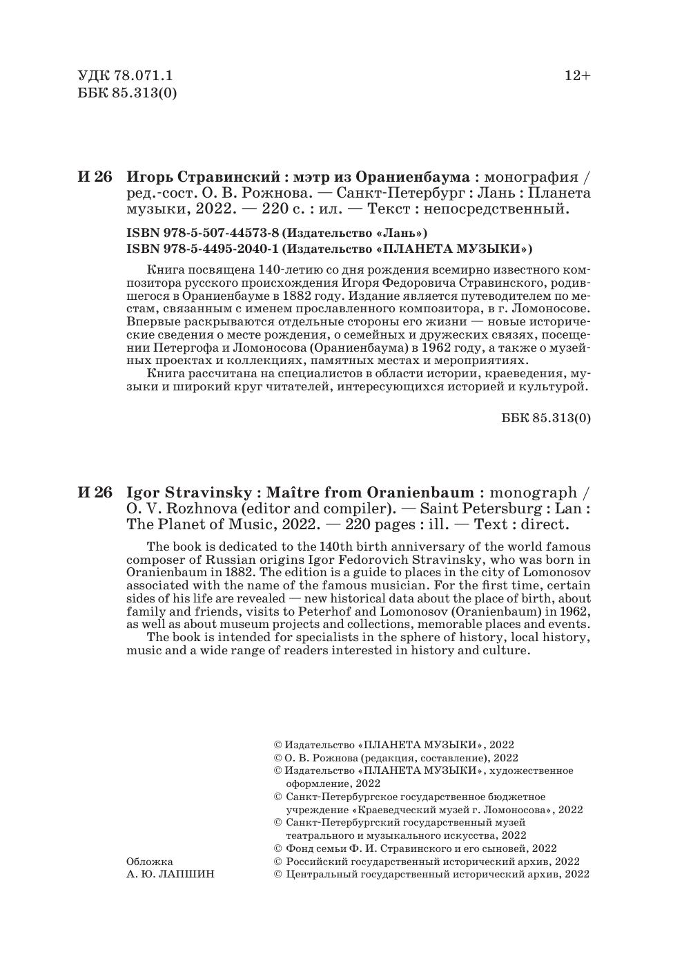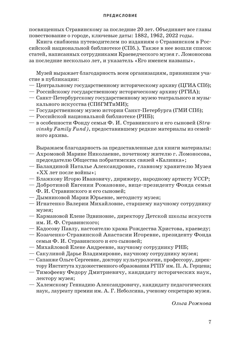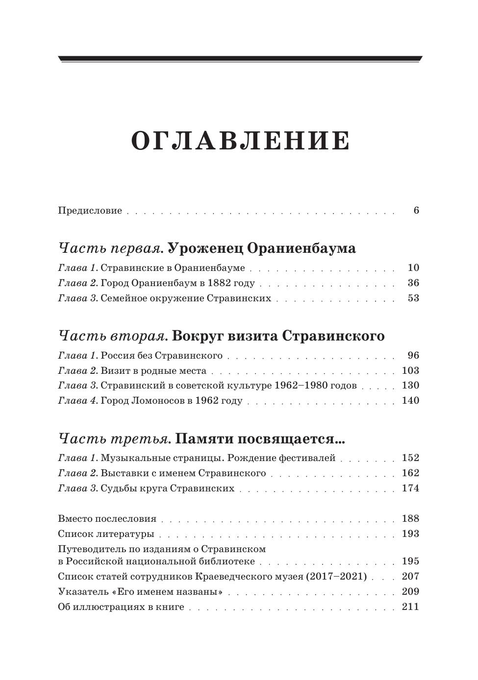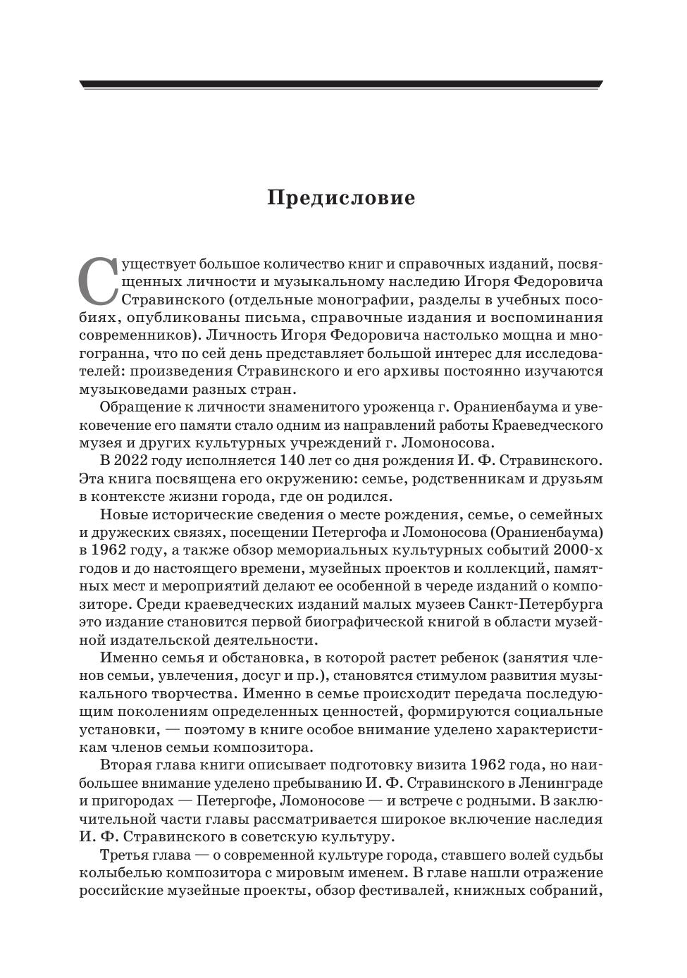 Книга посвящена 140-летию со дня рождения всемирно известного композитора русского происхождения Игоря Федоровича Стравинского, родившегося в Ораниенбауме в 1882 году. Издание является путеводителем по местам, связанным с именем прославленного музыканта в г. Ломоносове. Впервые раскрываются отдельные стороны его жизни — новые исторические сведения о месте рождения, о семейных и дружеских связях, посещении Петергофа и Ломоносова (Ораниенбаума) в 1962 году, а также о музейных проектах и коллекциях, памятных местах и мероприятиях.