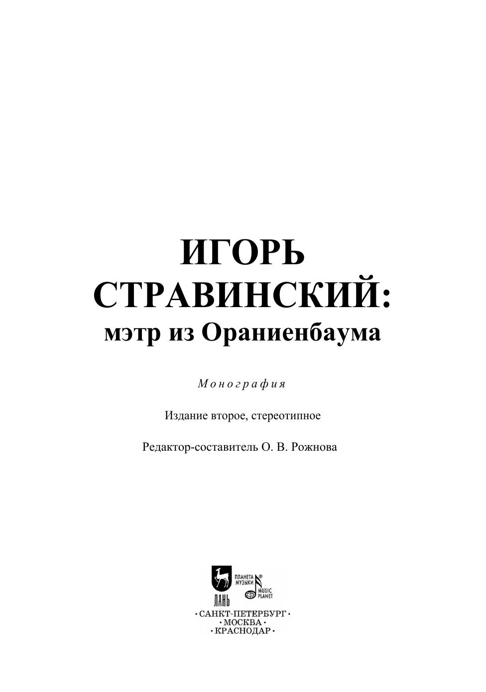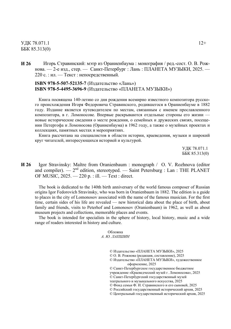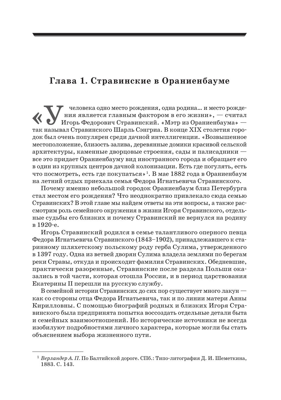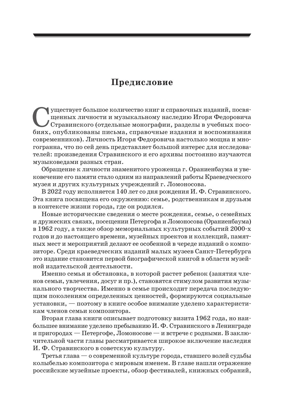 Книга посвящена 140-летию со дня рождения всемирно известного композитора русского происхождения Игоря Федоровича Стравинского, родившегося в Ораниенбауме в 1882 году. Издание является путеводителем по местам, связанным с именем прославленного музыканта в г. Ломоносове. Впервые раскрываются отдельные стороны его жизни — новые исторические сведения о месте рождения, о семейных и дружеских связях, посещении Петергофа и Ломоносова (Ораниенбаума) в 1962 году, а также о музейных проектах и коллекциях, памятных местах и мероприятиях. Книга рассчитана на специалистов в области истории, краеведения, музыки и широкий круг читателей, интересующихся историей и культурой.