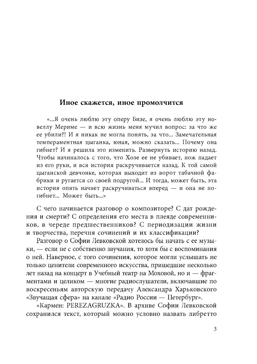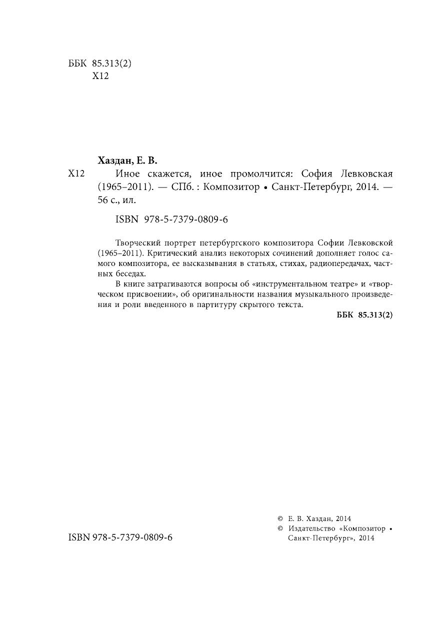 Творческий портрет петербургского композитора Софии Левковской (1965-2011). Критический анализ некоторых сочинений дополняет голос самого композитора, ее высказывания в статьях, стихах, радиопередачах, частных беседах. В книге затрагиваются вопросы об «инструментальном театре» и «творческом присвоении», об оригинальности названия музыкального произведения и роли введенного в партитуру скрытого текста.