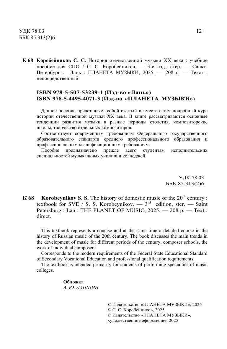 Сергей Савельевич Коробейников – кандидат искусствоведения, доцент кафедры истории театра, литературы и музыки Новосибирского государственного театрального института. Окончил Ленинградскую государственную консерваторию им. Римского-Корсакова. Сфера его научных интересов связана с музыкой XIX и XX веков – как зарубежной, так и отечественной. Автор монографии о фуге в творчестве композиторов-романтиков, учебных пособий («История музыкальной эстрады и джаза», «Жанры и формы музыкальных произведений», «Музыка в театре»), а также статей, опубликованных в ряде изданий («Журнал любителей искусства», «Музыкальная культура Новосибирска», «Музыкальная академия», «Музыкальная жизнь», «Вестник НГК им М.И. Глинки», «Вопросы музыкознания», «Околотеатральный журнал» и др.). Данное пособие может быть использовано студентами исполнительских специальностей музыкальных училищ и колледжей. This textbook represents a concise and at the same time a detailed course in the history of Russian music of the 20th century. The book discusses the main trends in the development of music for different periods of the century, composer schools, the work of individual composers. The textbook is intended for the students of colleges.