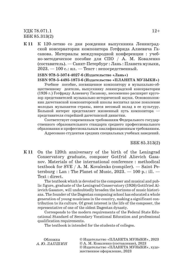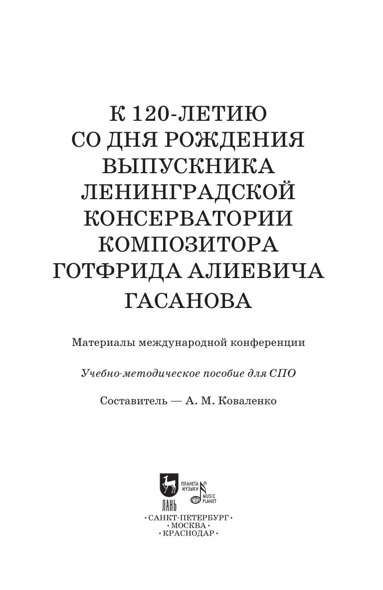 The textbook which is devoted to the composer and musical and public figure, graduate of the Leningrad Conservatory (1926) Gottfried Alievich Gasanov, will undoubtedly broaden the horizons of music historians. The founder of the Dagestan composing school has educated a whole generation of young musicians in the country, making a significant contribution to its culture. Of great interest is the life of the composer, the representative of one of the oldest Dagestan dynasty. Corresponds to the modern requirements of the Federal State Educational Standard of Secondary Vocational Education and professional qualification requirements.