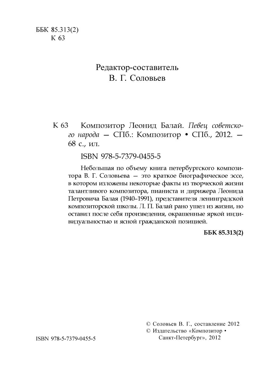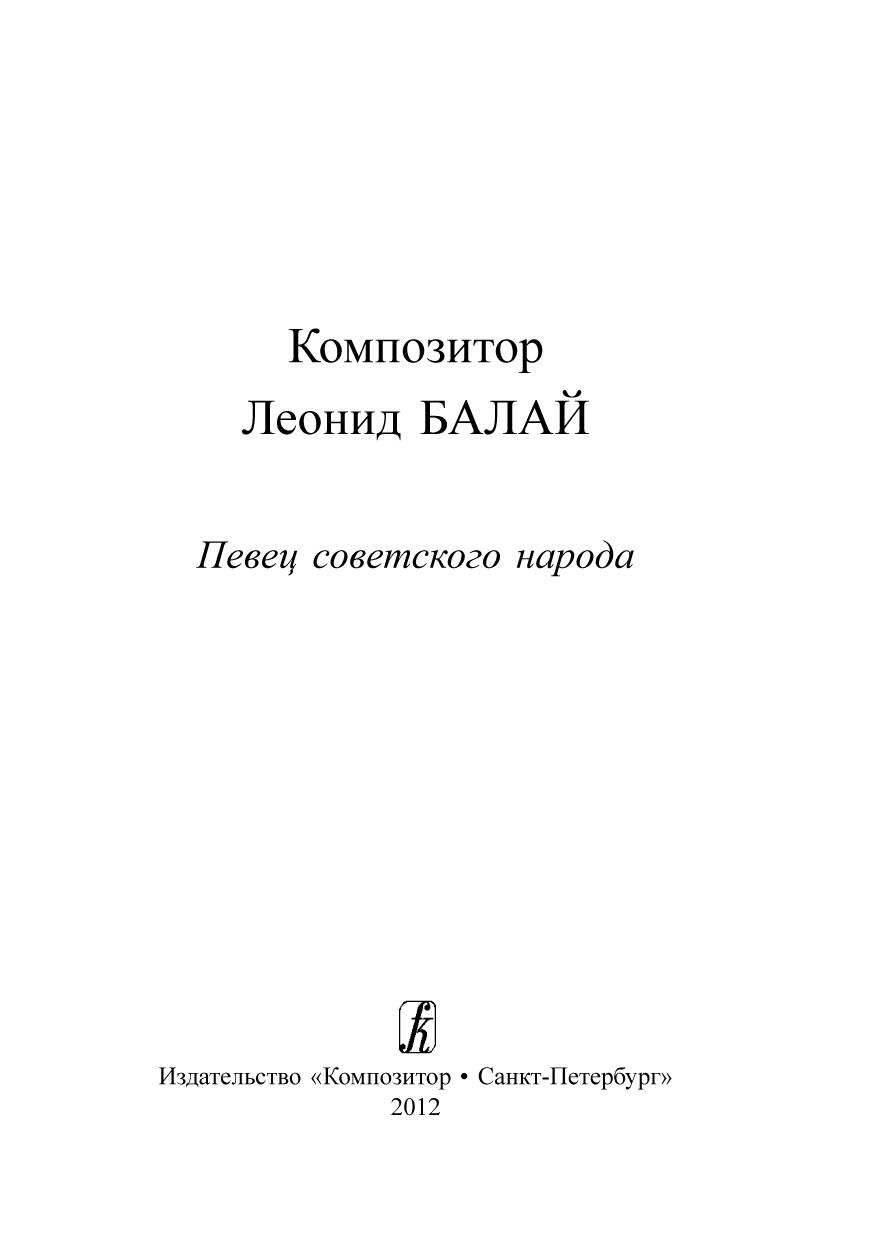 Небольшая по объему книга петербургского композитора В. Г. Соловьева — это краткое биографическое эссе, в котором изложены некоторые факты из творческой жизни талантливого композитора, пианиста и дирижера Леонида Петровича Балая (1940–1991), представителя ленинградской композиторской школы. Л. П. Балай рано ушел из жизни, но оставил после себя произведения, окрашенные яркой индивидуальностью и ясной гражданской позицией.