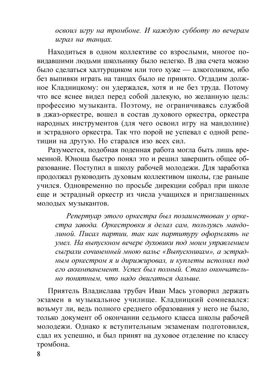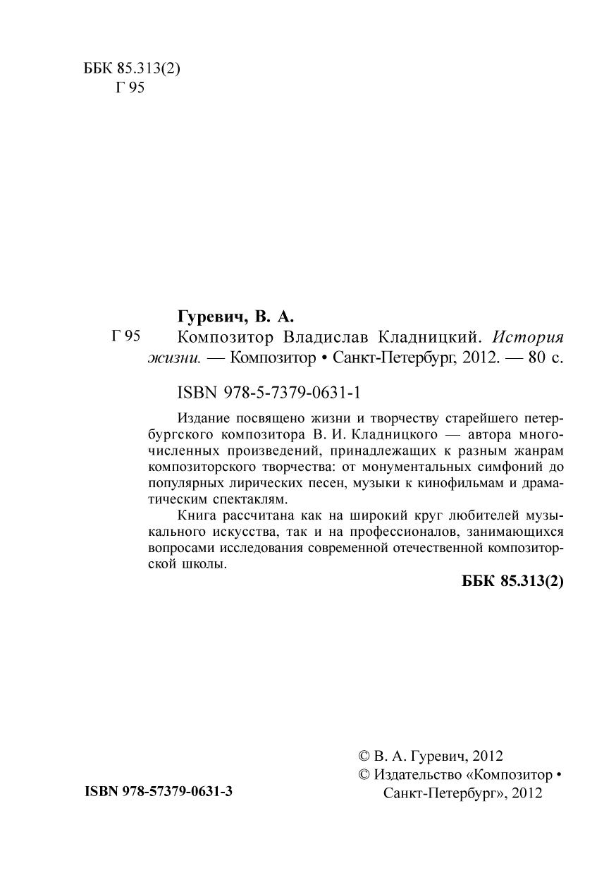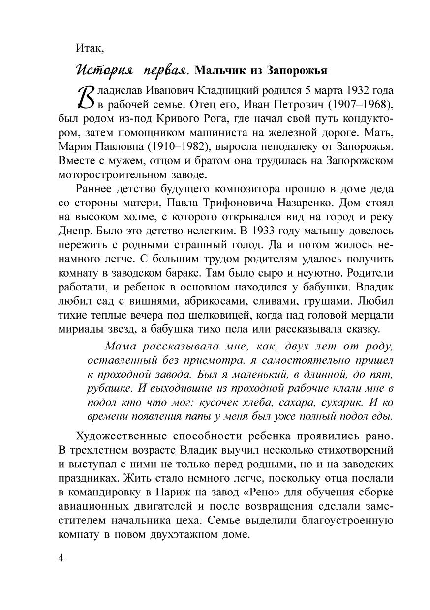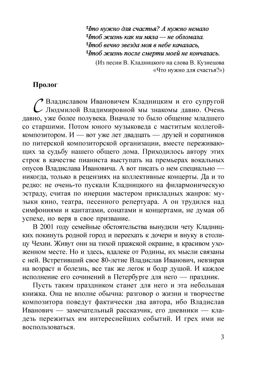 Издание посвящено жизни и творчеству старейшего петербургского композитора В. И. Кладницкого — автора многочисленных произведений, принадлежащих к разным жанрам композиторского творчества: от монументальных симфоний до популярных лирических песен, музыки к кинофильмам и драматическим спектаклям. Книга рассчитана как на широкий круг любителей музыкального искусства, так и на профессионалов, занимающихся вопросами исследования современной отечественной композиторской школы.